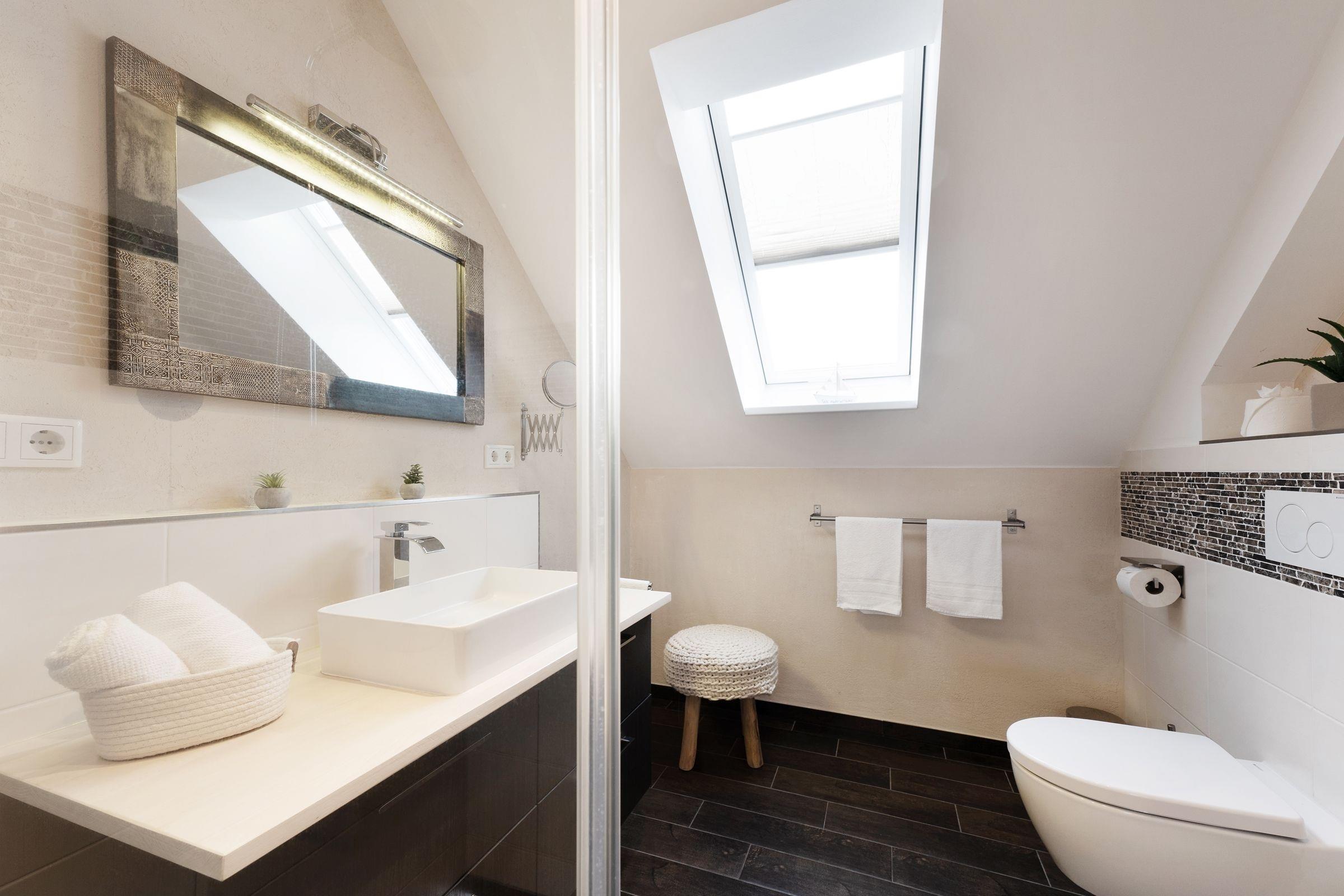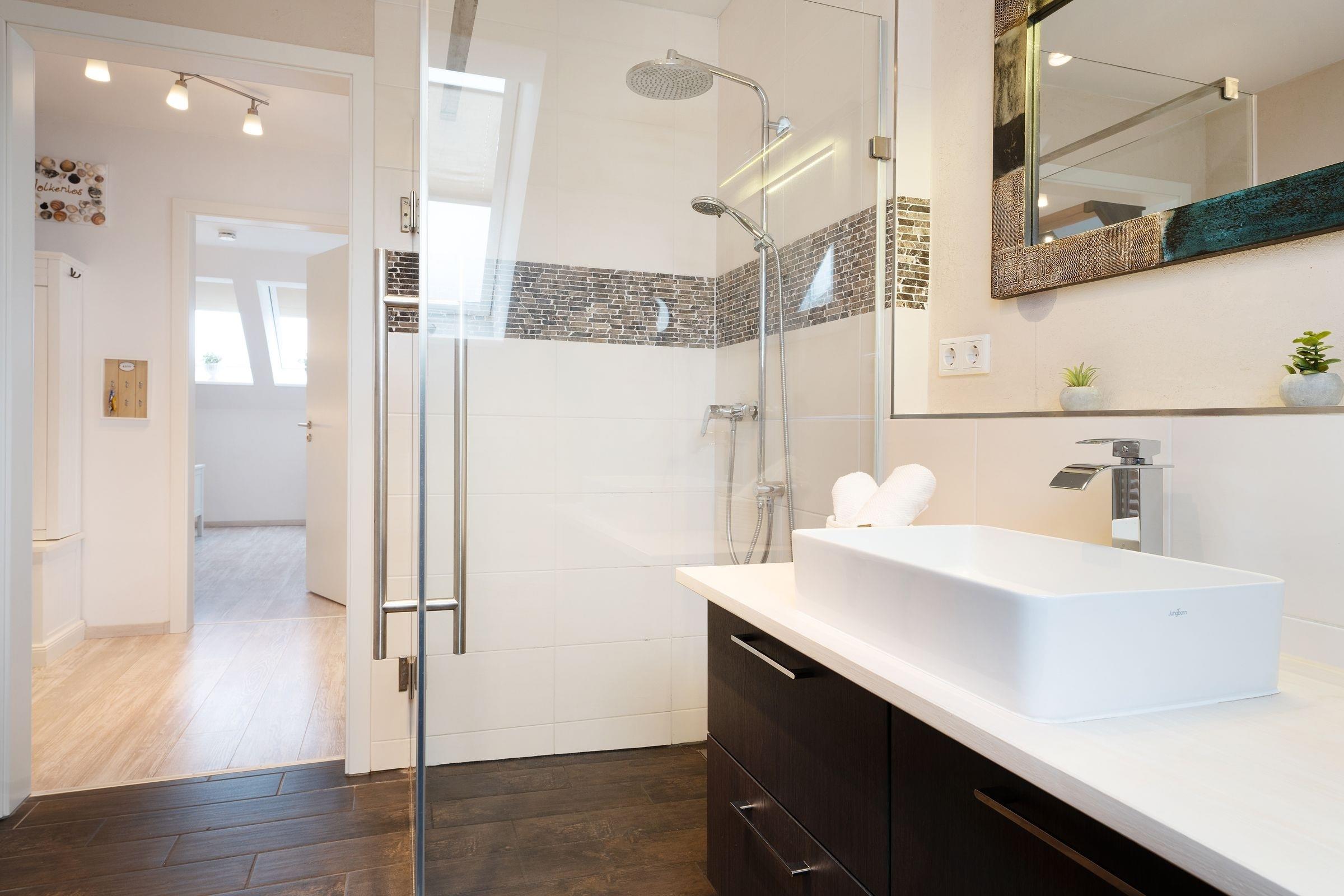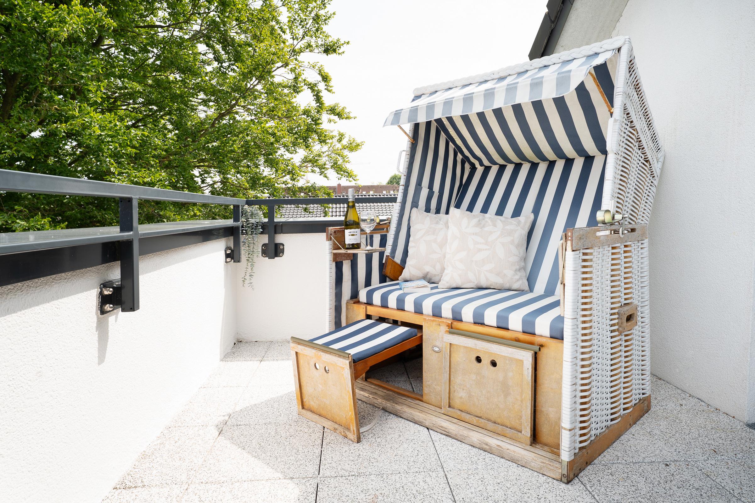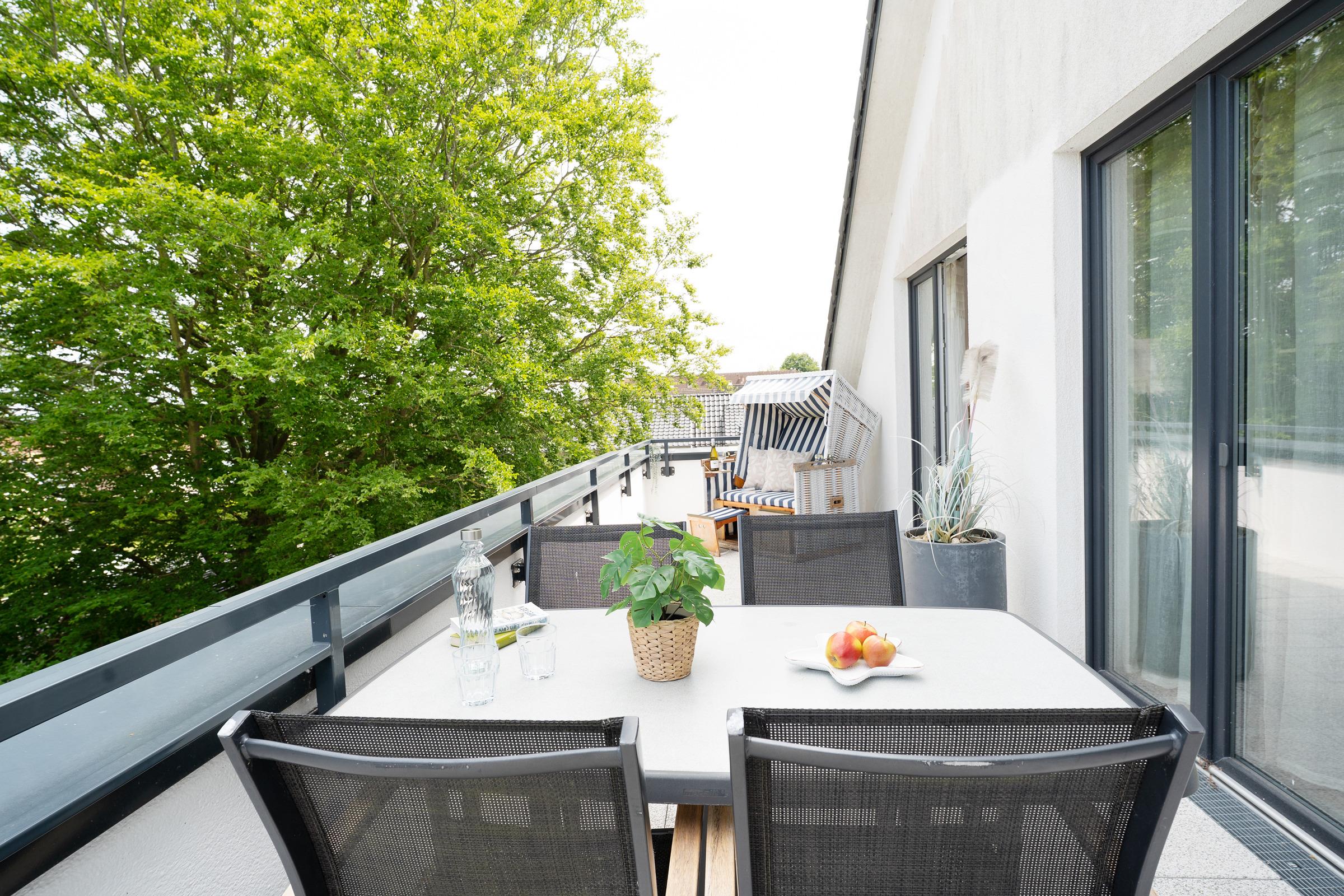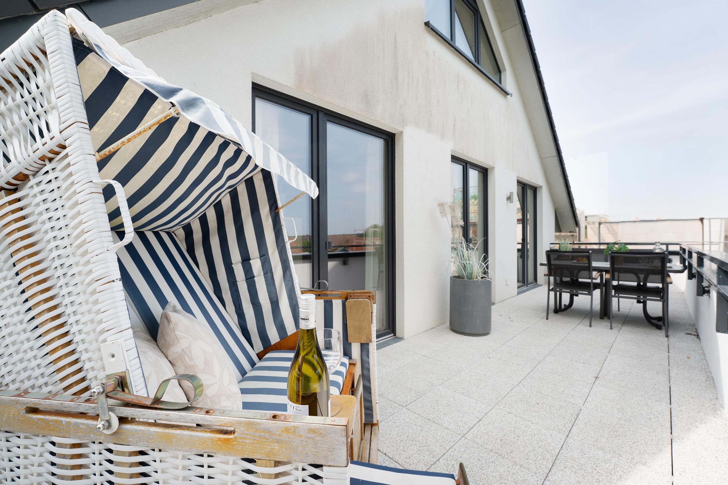 Ankommen ... Auspacken ... Wohlfühlen ... Diese Ferienwohnung erstreckt sich über 2 Ebenen und ist aufgeteilt in einen großzügigen Wohn-/Essbereich mit TV und Zugang zur 21 m² großen Dachterrasse mit Strandkorb - hier können Sie herrlich entspannen! Die Einbauküche ist zum Wohnbereich hin offen gestaltet und mit Backofen, Mikrowelle, Geschirrspüler, Kühlschrank, Kaffeemaschine, Toaster etc. ausgestattet. Ein Schlafzimmer verfügt über ein Doppelbett (2x 90x200 cm) und zusätzlichen TV, das zweite Schlafzimmer befindet sich in der oberen Etage und hat 2 Einzelbetten, die beide zu Doppelbetten (Liegefläche ca. 160x200 cm) ausgezogen werden können. Das moderne Bad mit WC und bodentiefer Dusche rundet das Angebot ab.