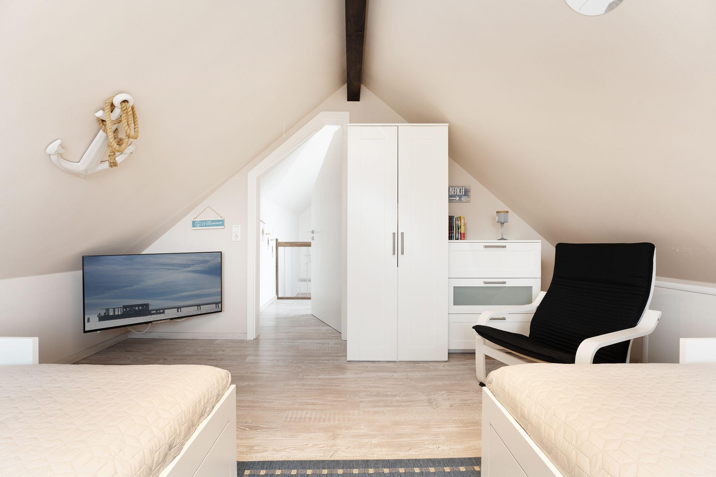 Schlafzimmer 2: 1 Kojen Bett (2x 90x200 cm), 1 Einzelbett (90x200 cm), TV