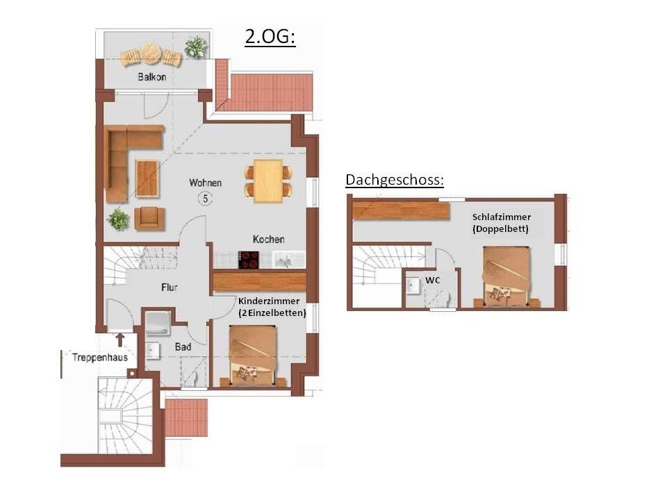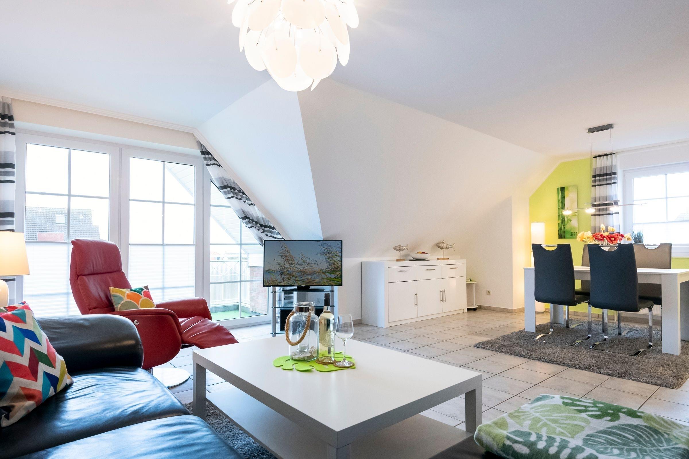 In dieser schönen Ferienwohnung erwartet Sie ein gemütliches Wohnzimmer mit Couch- und Essecke, TV und großzügigem Balkon. Genießen Sie von hier aus den Blick auf die Seebrücke. Die Küche ist im Wohnraum integriert und lässt keine Wünsche offen - Annehmlichkeiten wie ein Geschirrspüler, ein 4-Platten-Ceranfeld oder ein Backofen sind vorhanden. Weiterhin gibt es ein großes Schlafzimmer mit 2 Einzelbetten (je 90x200 cm), TV und Außenrollladen sowie ein Duschbad mit WC. Auf der 2. Ebene befindet sich ein weiteres Schlafzimmer mit Doppelbett (2x 90x200 cm) und TV sowie das Gäste-WC. Der WLAN-Anschluss ist inklusive.