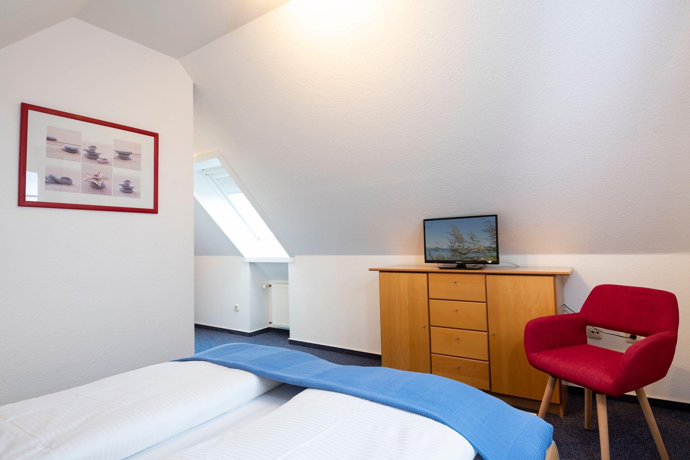 Schlafzimmer 1: 1 Doppelbett (2x 90x200 cm), TV, Kleiderschrank, Verdunkelungsmöglichkeit (Außenrolladen)