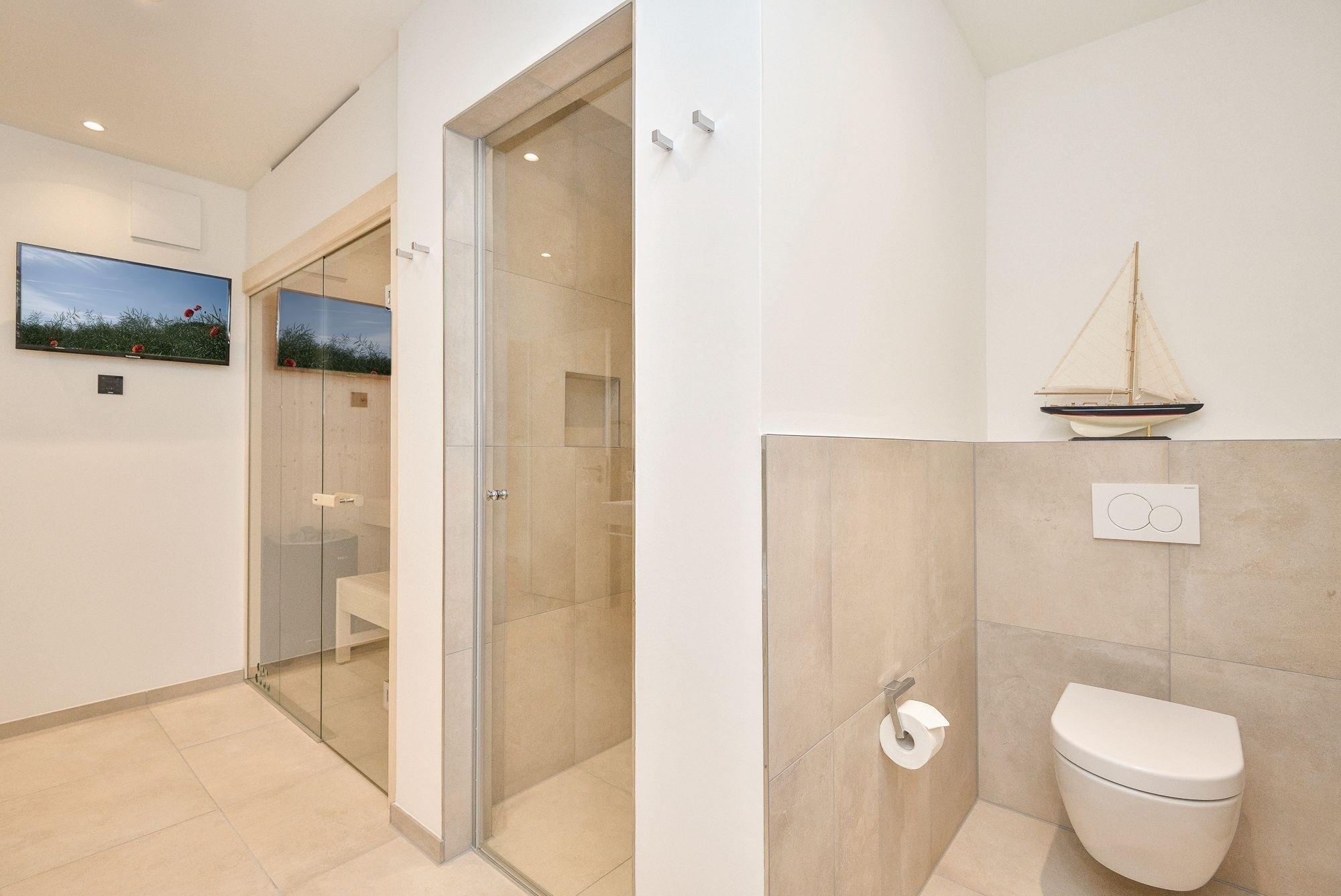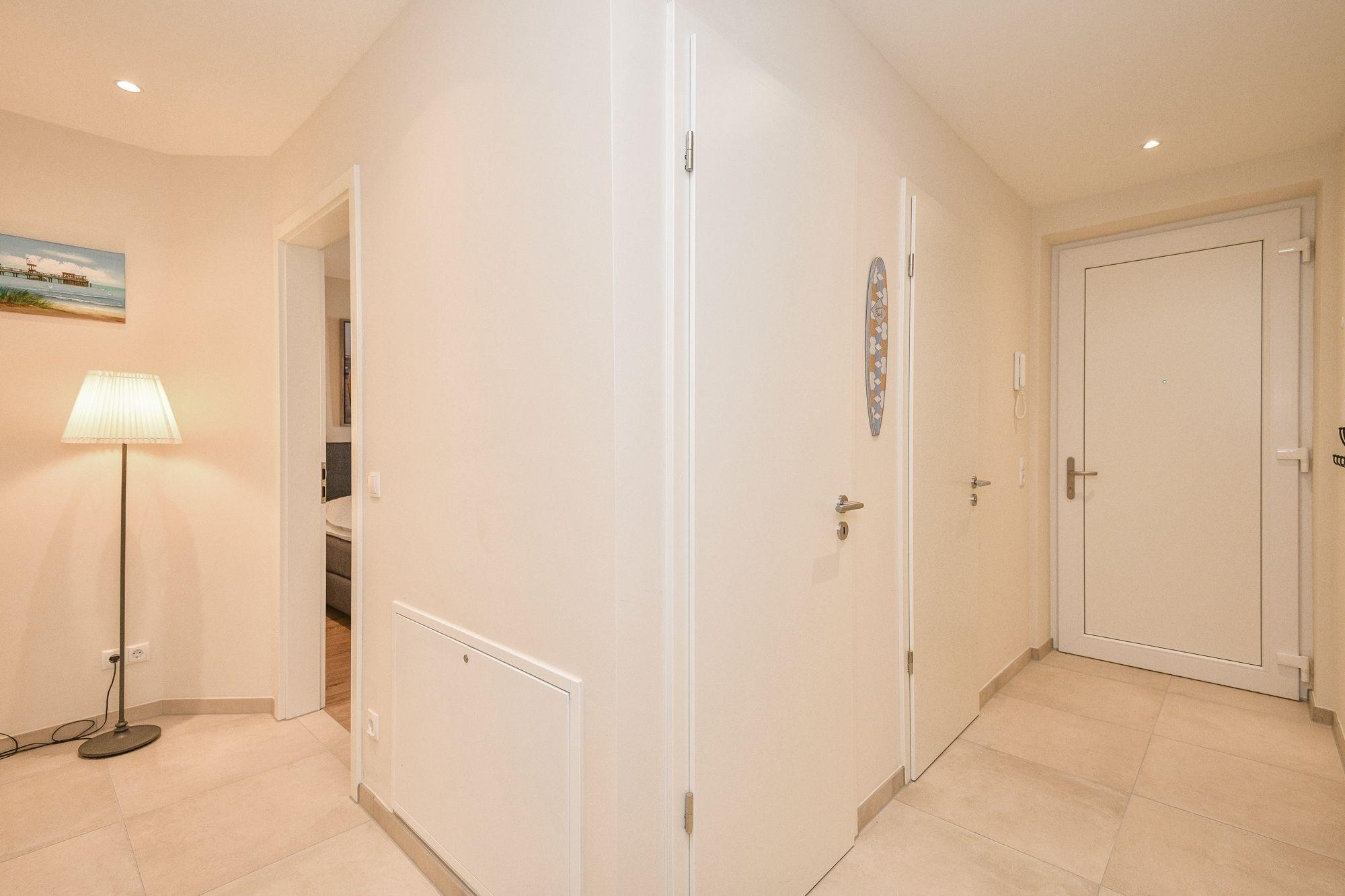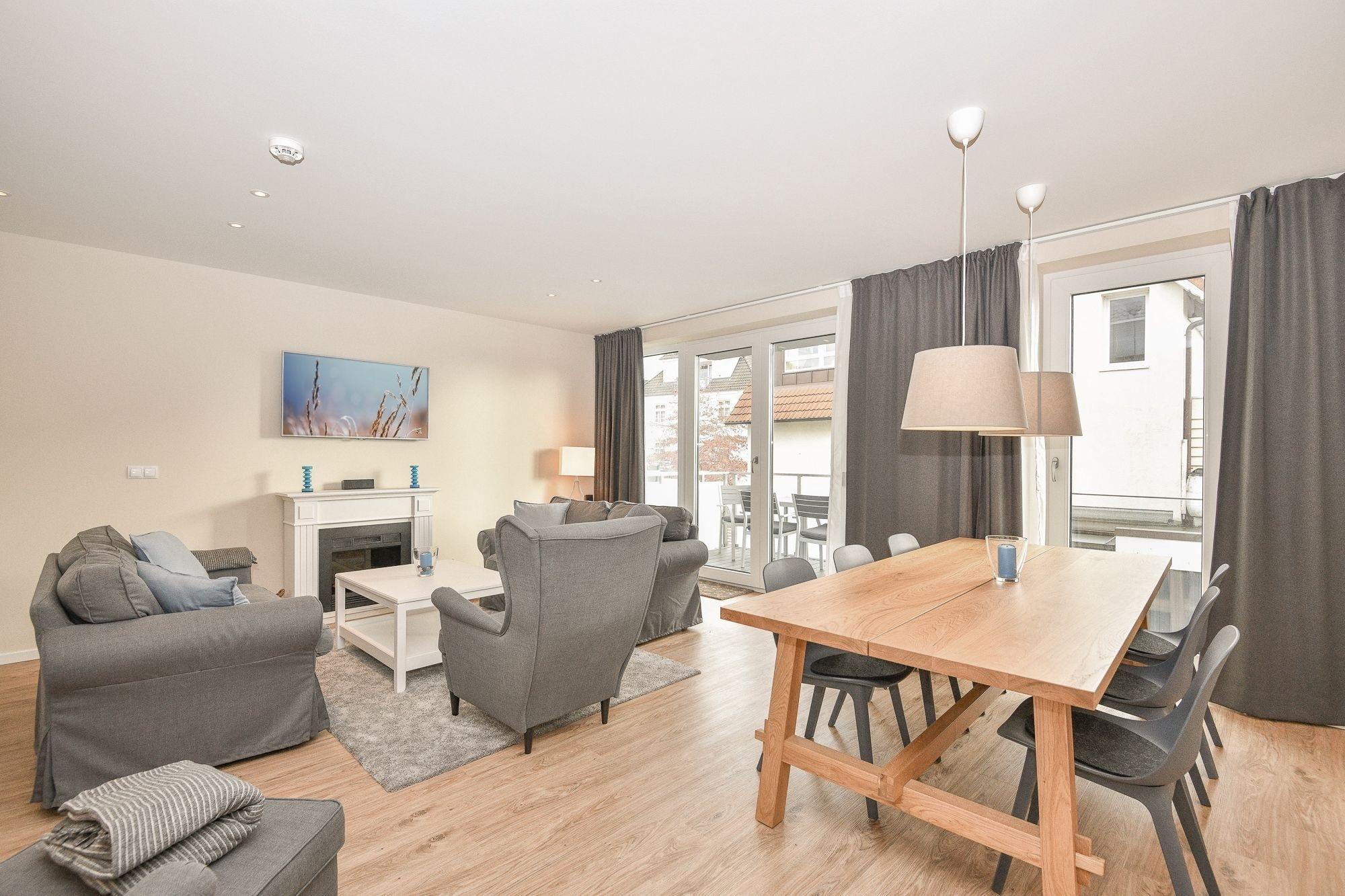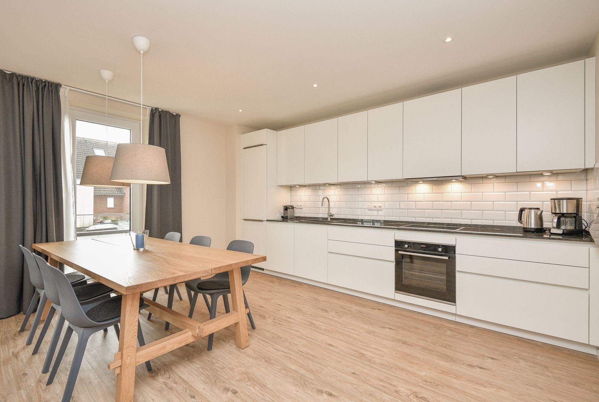 Die Wohnung befindet sich im Obergeschoss (mit Fahrstuhl) und verfügt über einen sehr großzügigen Wohn-/Essbereich (ca. 35 m²) mit einer gut ausgestatteten grifflosen Küche mit Granitarbeitsplatte (Induktionskochfeld, Geschirrspüler usw.). Der großzügige Esstisch und die hochwertige Ausstattung machen das Essen in der Wohnung zum Vergnügen. Der Bäcker befindet sich übrigens im Gebäude im Erdgeschoss! Beide Schlafzimmer sind mit hochwertigen Boxspringbetten (je 180x200 cm) und großzügiger Schrankkapazität ausgestattet. Neben dem Gäste-WC gibt es ein großes Badezimmer mit einer Whirlwanne (Villeroy & Boch), einer großen Dusche und einer verglasten Sauna. Wärme und Entspannung sind daher zu jeder Jahreszeit garantiert! Damit ein Koffer zu Hause bleiben kann, verfügt die Wohnung über eine eigene Waschmaschine und Trockner (Miele). Auch sonst ist die Wohnung technisch gut ausgestattet: 4 TV-Geräte, Blu-ray Dolby Surround-Anlage, hochwertiges Radio (inkl. Internetradio), 500 Mbit- Internetanschluss (WLAN) und dimmbare Deckenspots runden das Bild ab. Für Kinder gibt es als weitere Pluspunkte: Spielzeug, ein Reisebett, Hochstuhl usw.