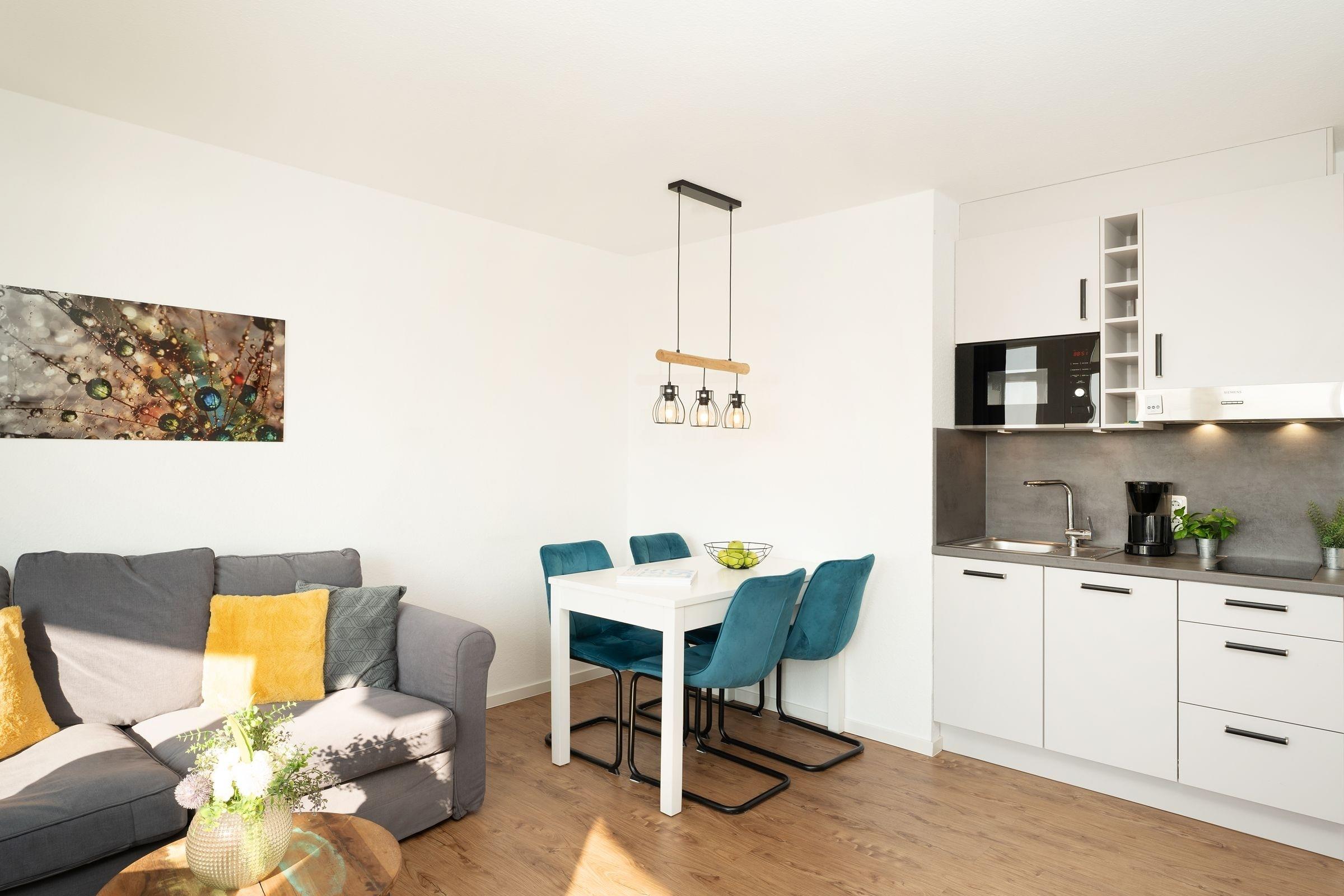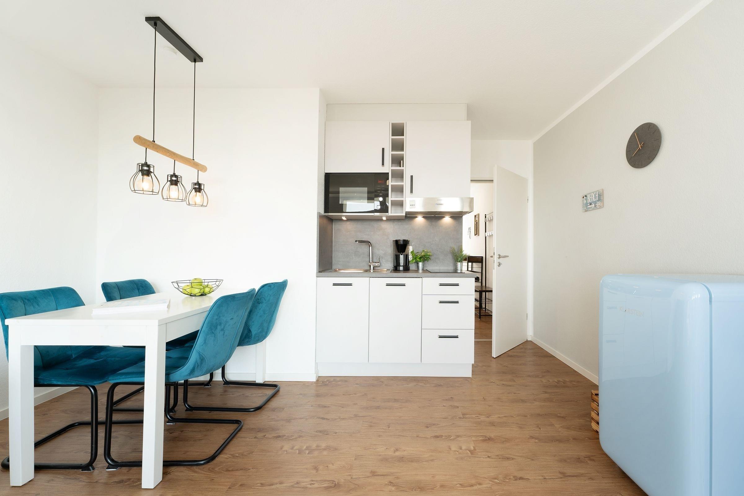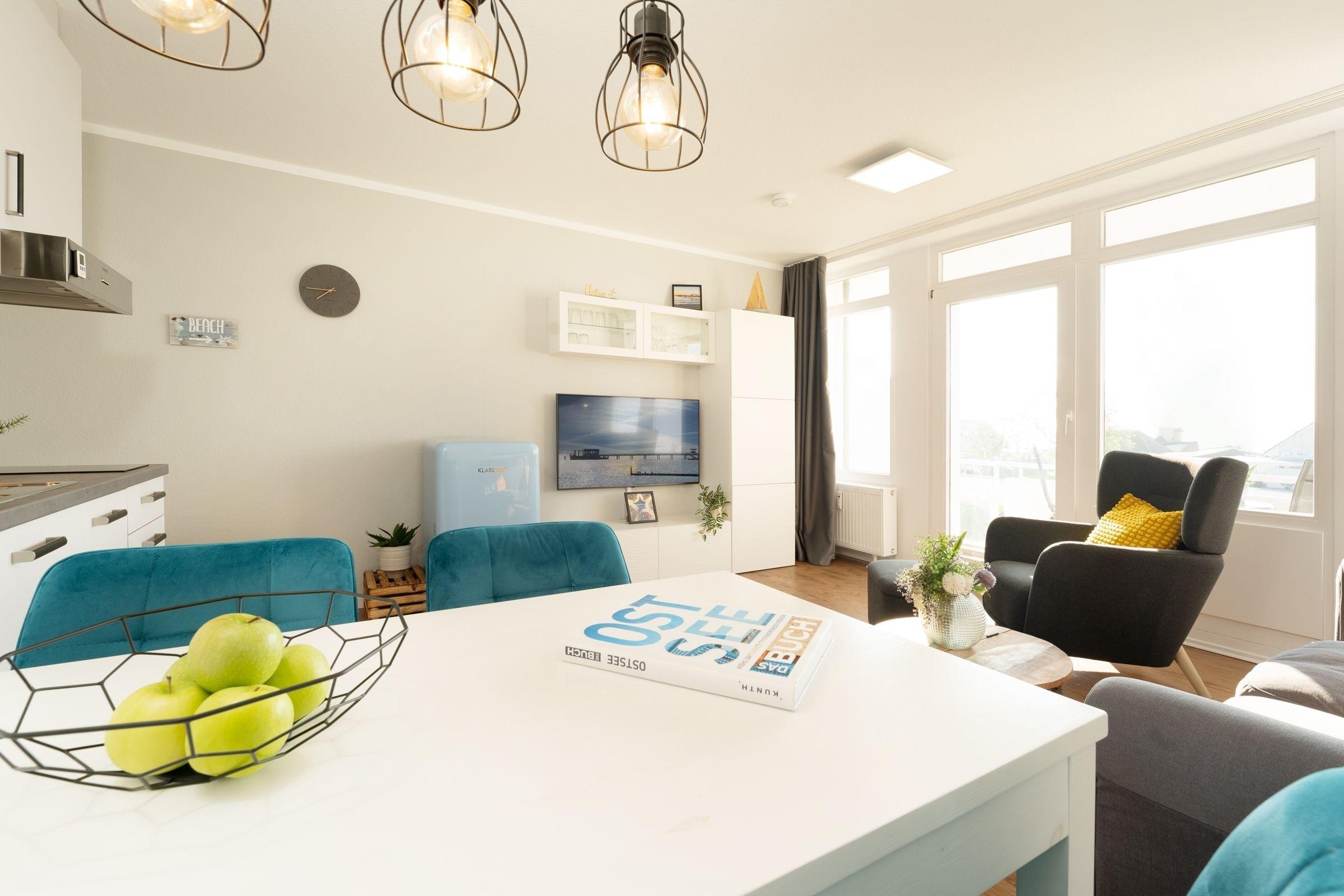 Aufwachen und auf die Ostsee schauen - Das können Sie in dieser schönen Ferienunterkunft im Haus Seeblick. Die Wohnung bietet ein schönes Wohnzimmer mit Couch, Sessel und einem Smart-TV und eine kleine, zum Wohnzimmer integrierte moderne Einbauküche nebst Esstisch mit Stühlen. Im Schlafzimmer können Sie es sich im Doppelbett (2x 90x200 cm) vor dem 2. Fernseher gemütlich machen. Die Fenster lassen sich hier durch ein Rollo angenehm abdunkeln. Das moderne Badezimmer ist mit einer Dusche ausgestattet. Vom Balkon aus können Sie das Rauschen des Meeres hören. Ein kostenfreier WLAN-Anschluss ist natürlich vorhanden.