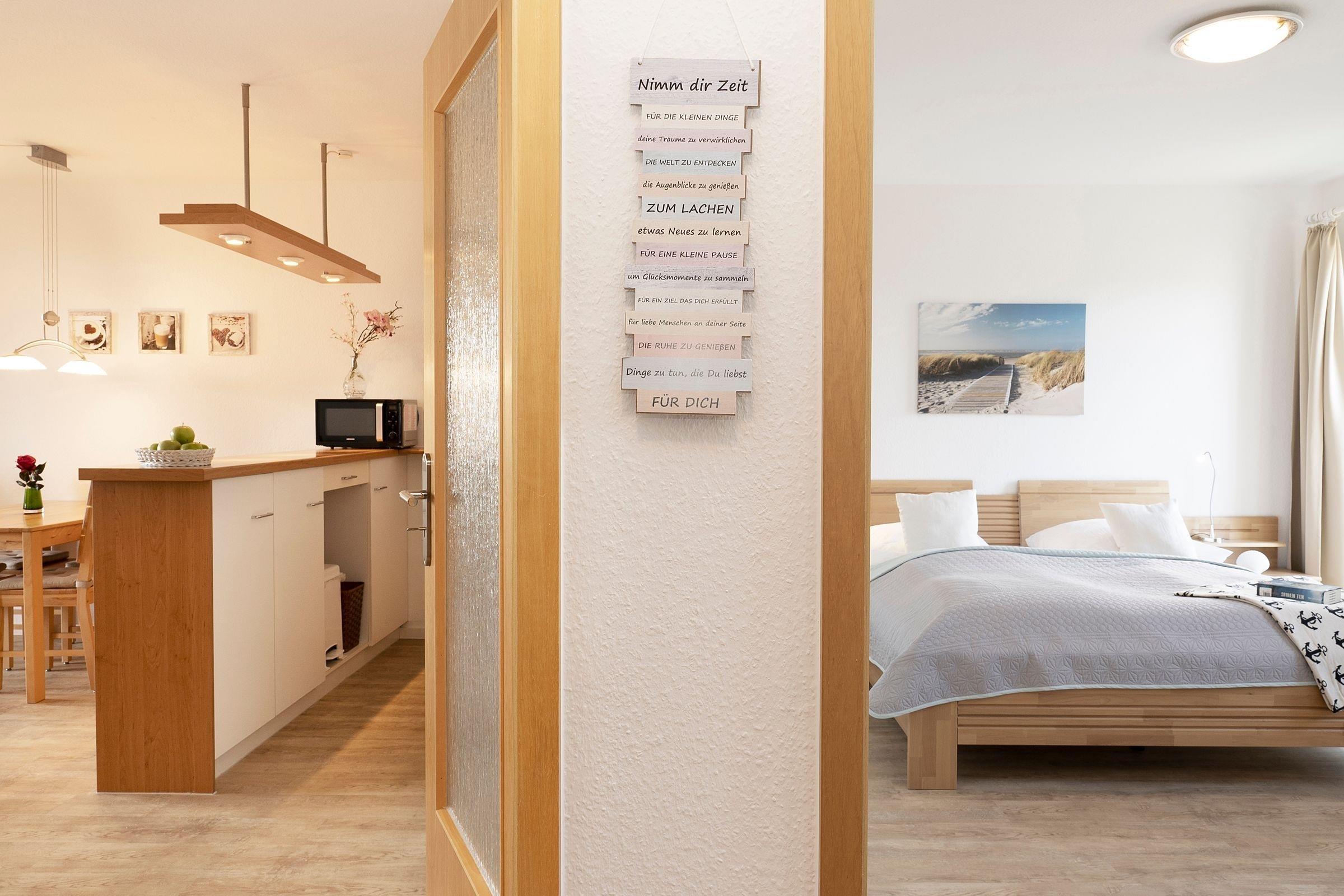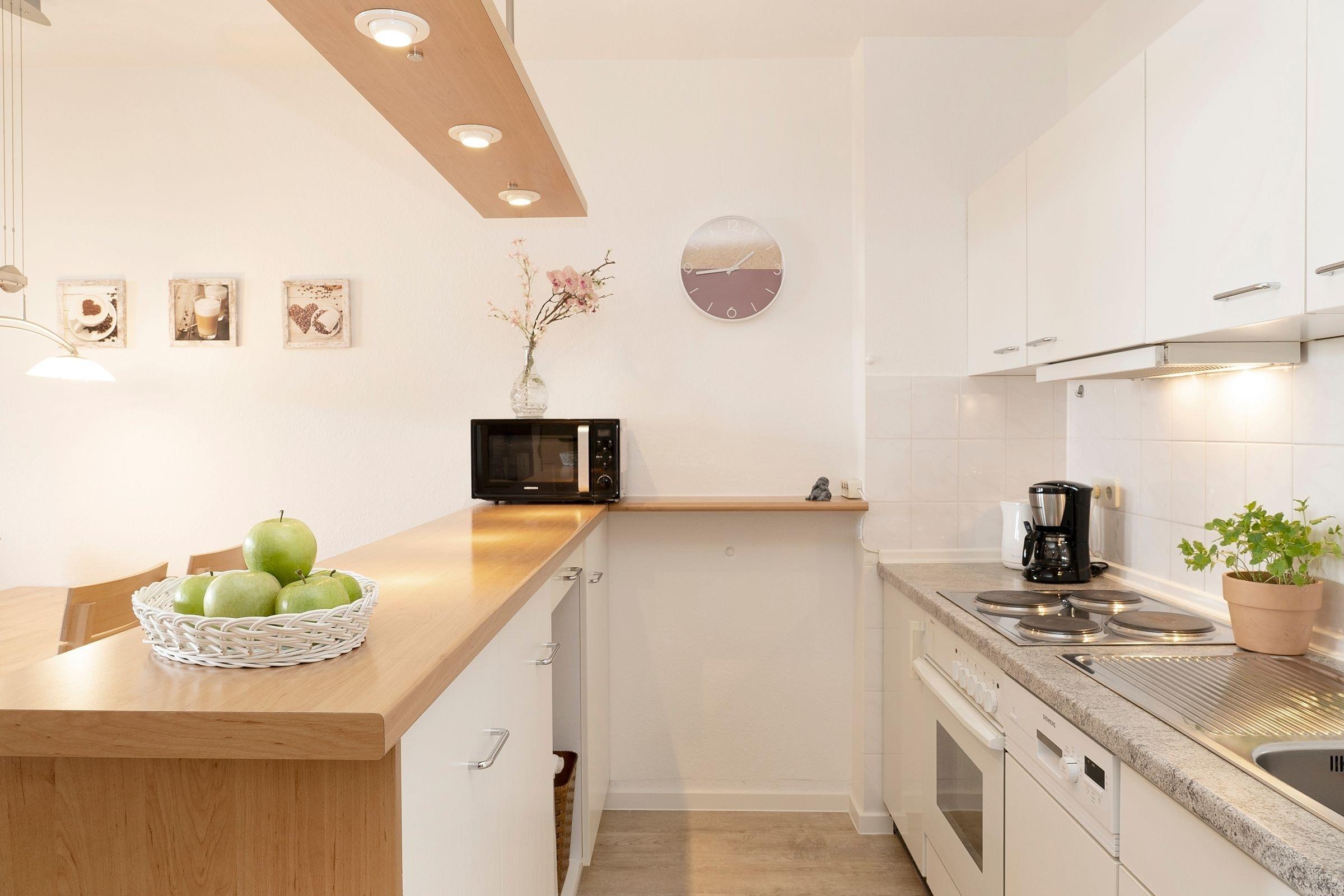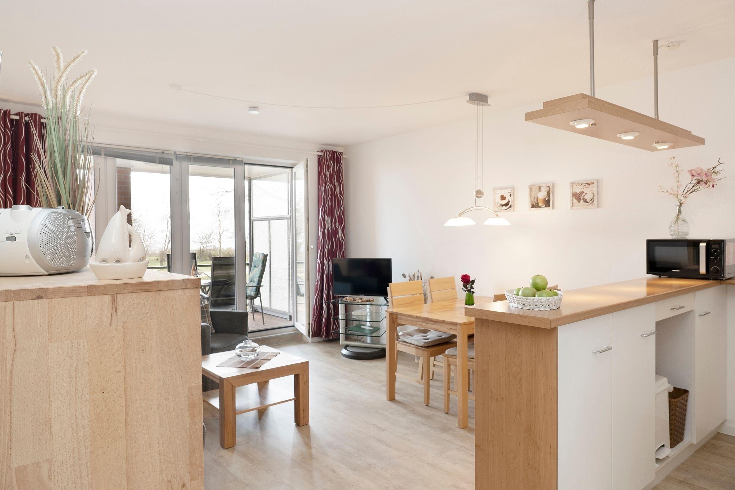 Hier können Sie frische Meeresluft schnuppern – die helle Ferienwohnung Strandmöwe im Wohnpark Kaiserhof ist nur rund 65 Meter vom Ostseestrand entfernt. Der geschmackvolle und farblich schick abgestimmte Wohnbereich empfängt Sie mit einer kuscheligen Polster-Garnitur. Entspannen Sie hier vor dem TV-Gerät oder mit einem guten Buch. Oder Sie lassen Ihren Blick auf der angrenzenden großen möblierten Balkon-Loggia mit saisonalem Teilmeerblick in die Ferne schweifen. Hören Sie den Wellen zu und genießen Sie hier Ihre wohlverdiente Auszeit an der traumhaften Ostseeküste. Die Küche ist in den Wohnbereich integriert und gut ausgestattet. Zaubern Sie hier Ihre Lieblings-Menüs und schlemmen Sie in der gemütlichen Essecke. Der Geschirrspüler übernimmt derweil den Abwasch. Ein Tresen dient als Raumteiler und sorgt für Gemütlichkeit. Für die Nacht haben Sie die Möglichkeit, die Schlafcouch im Wohnbereich in ein Doppelbett (ca. 150 cm breit) zu verwandeln. Und in einem separaten Schlafzimmer wartet ein Doppelbett (2x 90x200 cm) auf Sie. Wir wünschen angenehme Träume. Das moderne Duschbad mit Fenster verspricht einen guten Start in den nächsten Urlaubstag.