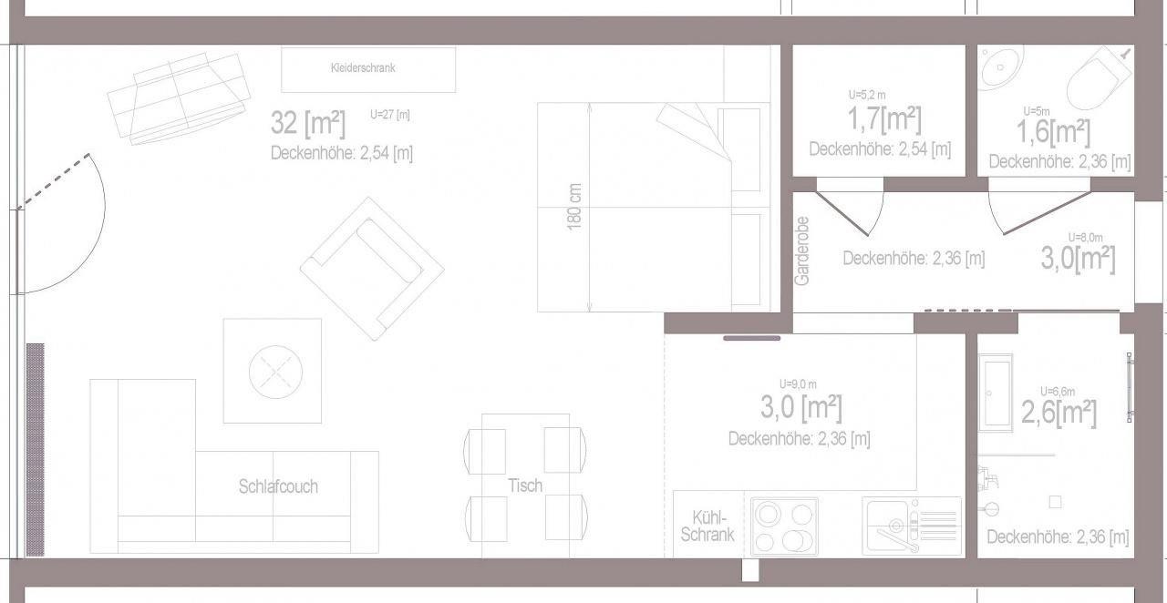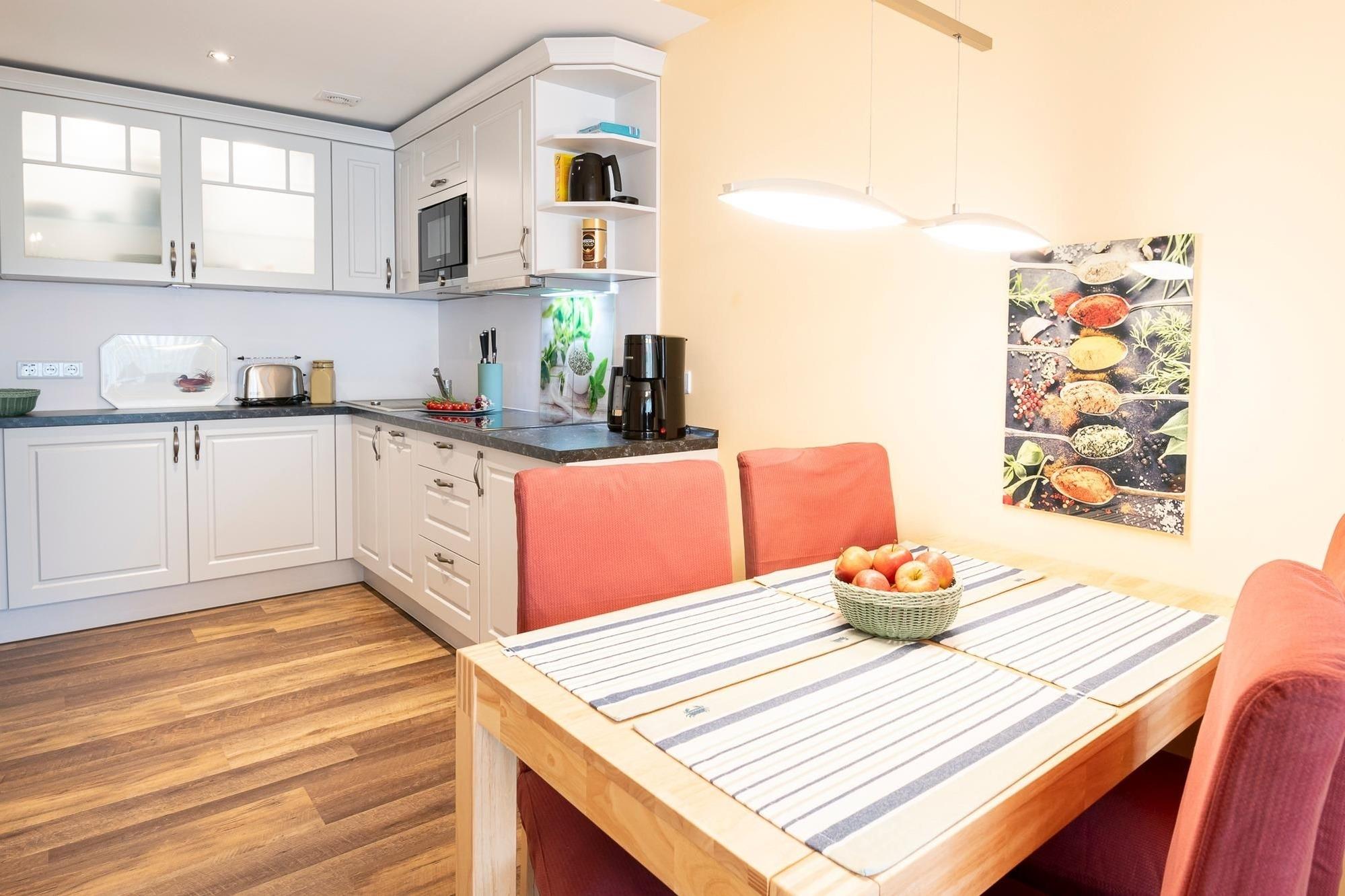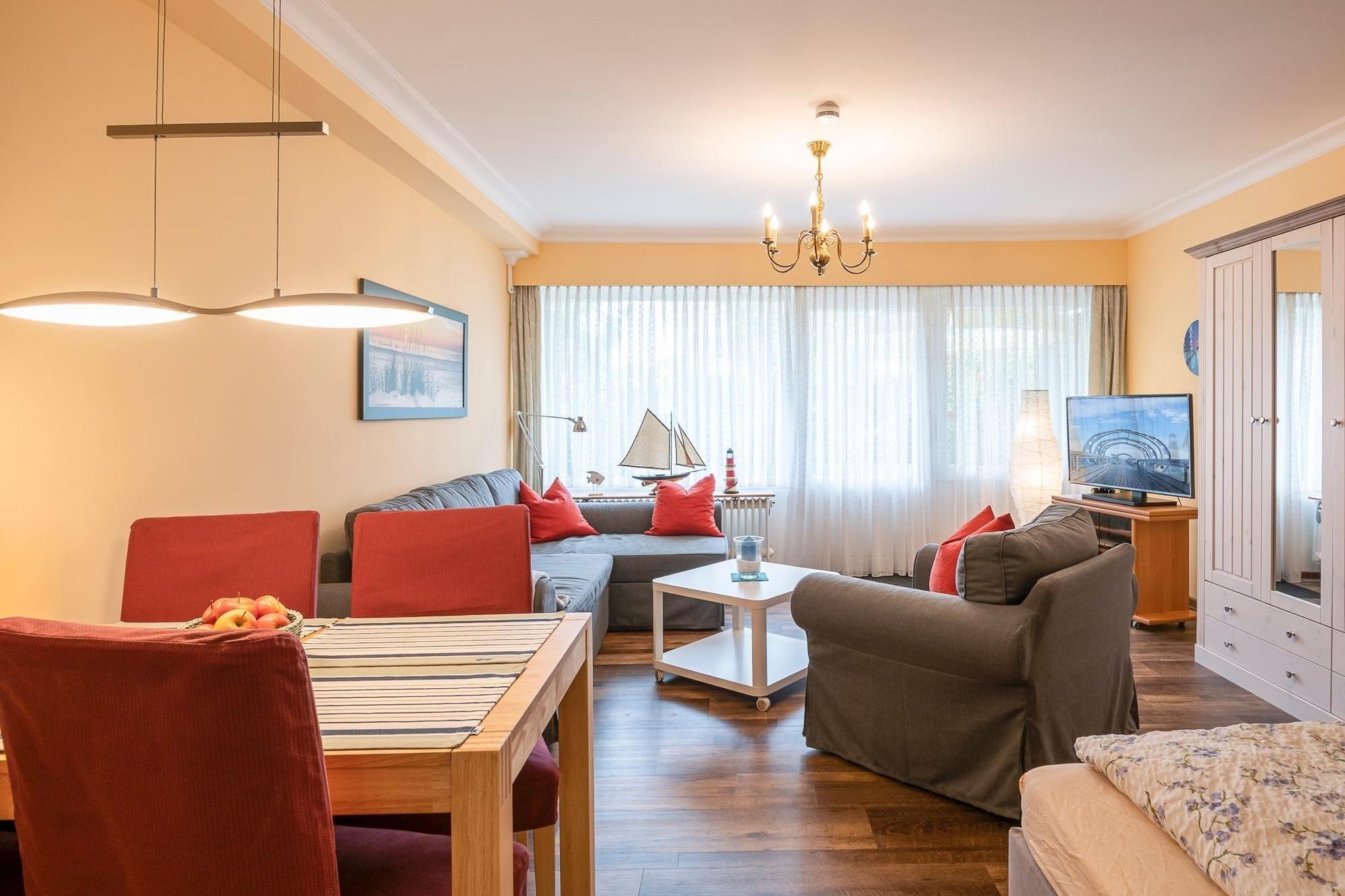 Das großzügige Wohnzimmer ist aufgeteilt in einen Wohnbereich mit TV, Radio und Sofa, einen Schlafbereich mit Doppelbett (2 x 180x200 cm), zusätzlichem TV sowie einer offenen, voll ausgestatteten Küche mit komfortablem Induktionsherd und Mikrowelle mit Grillfunktion. Von hier haben Sie Zutritt zu der möblierten, süd-westlich ausgerichteten Terrasse und zu dem Gartenabschnitt, der unmittelbar vor dem Appartement liegt. Durch die hohe blickdichte Hecke ist dieser Bereich von außen nicht einsehbar. Das Badezimmer ist unterteilt in 2 Räume: Ein Raum mit Dusche und Waschbecken, der 2. Raum (direkt gegenüber) mit WC und Waschbecken. Ein kostenfreier WLAN-Anschluss ist vorhanden.