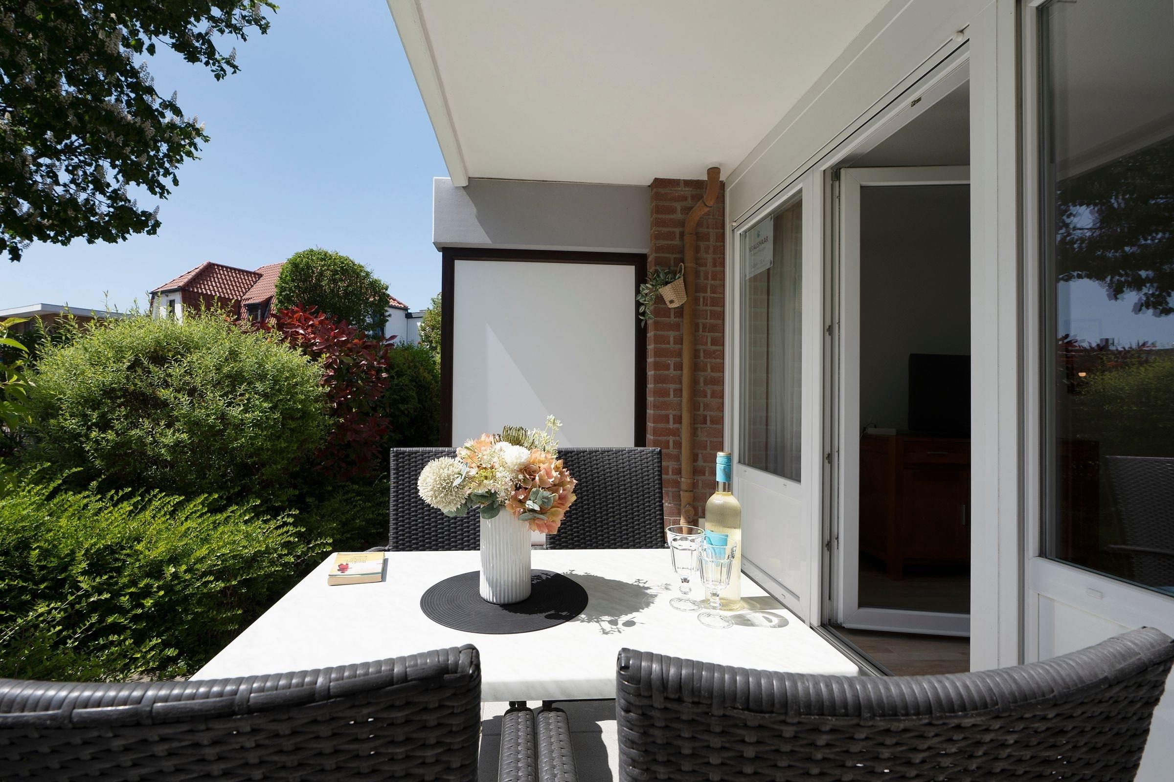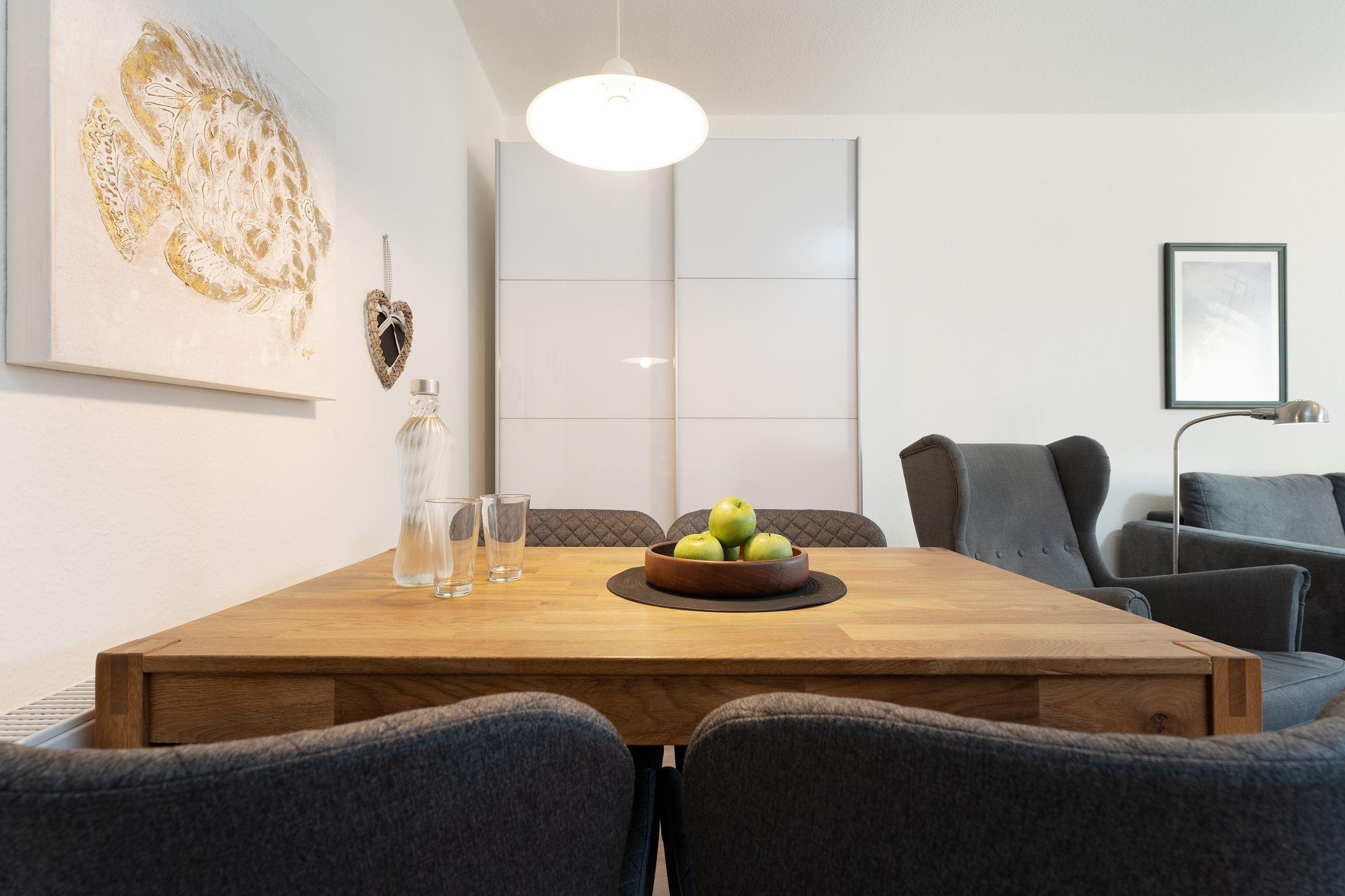 Über einen Flur gelangen Sie in den offen gestalteten Wohnraum mit integriertem Essbereich und angrenzender, voll ausgestatteter Küchenzeile. Verbringen Sie hier gesellige Spieleabende oder genießen Sie das gemeinsame Essen. Ein bequemes Sofa lädt Sie zu einem spannenden Buch oder erholsamen Stunden vor dem Fernseher ein. Zur Nacht lässt sich das Boxspring-Schlafsofa mühelos in einen weiteren sehr komfortablen Schlafplatz verwandeln (ca. 140x200 cm). Die beiden geräumigen Kleiderschränke im Wohnzimmer und Flur bieten ausreichend Platz für Ihre mitgebrachte Urlaubsgarderobe. Über einen kostenlosen WLAN-Anschluss können Sie Ihre Liebsten Zuhause mit aktuellen Urlaubsfotos versorgen. Vom Wohnbereich gelangen Sie auf die schöne, möblierte Terrasse, auf der Sie bei einem Glas Wein den Tag ausklingen lassen, oder bei einer Tasse heißen Kaffee aus der Tassimo Pad Maschine in den Tag starten können. Tanken Sie im separaten Schlafzimmer mit kleinem Balkon Energie für den nächsten Urlaubstag. In dem komfortablen Doppelbett (2x 90x200 cm) verbringen Sie geruhsame und schlafreiche Nächte. Das Badezimmer mit Dusche, Handtuchheizung und Fön vervollständigt dieses schöne Feriendomizil. Wohn- und Schlafzimmer lassen sich mit elektrischen Außenrollläden verdunkeln.