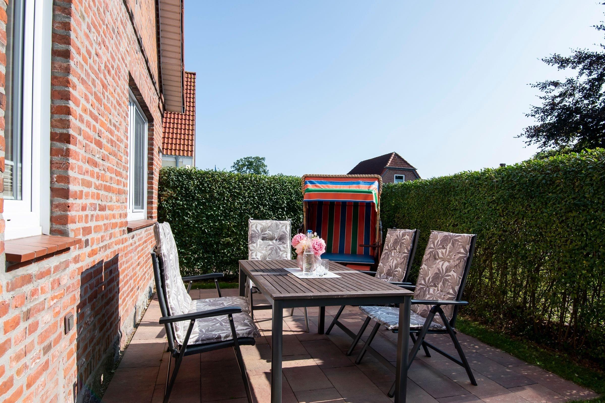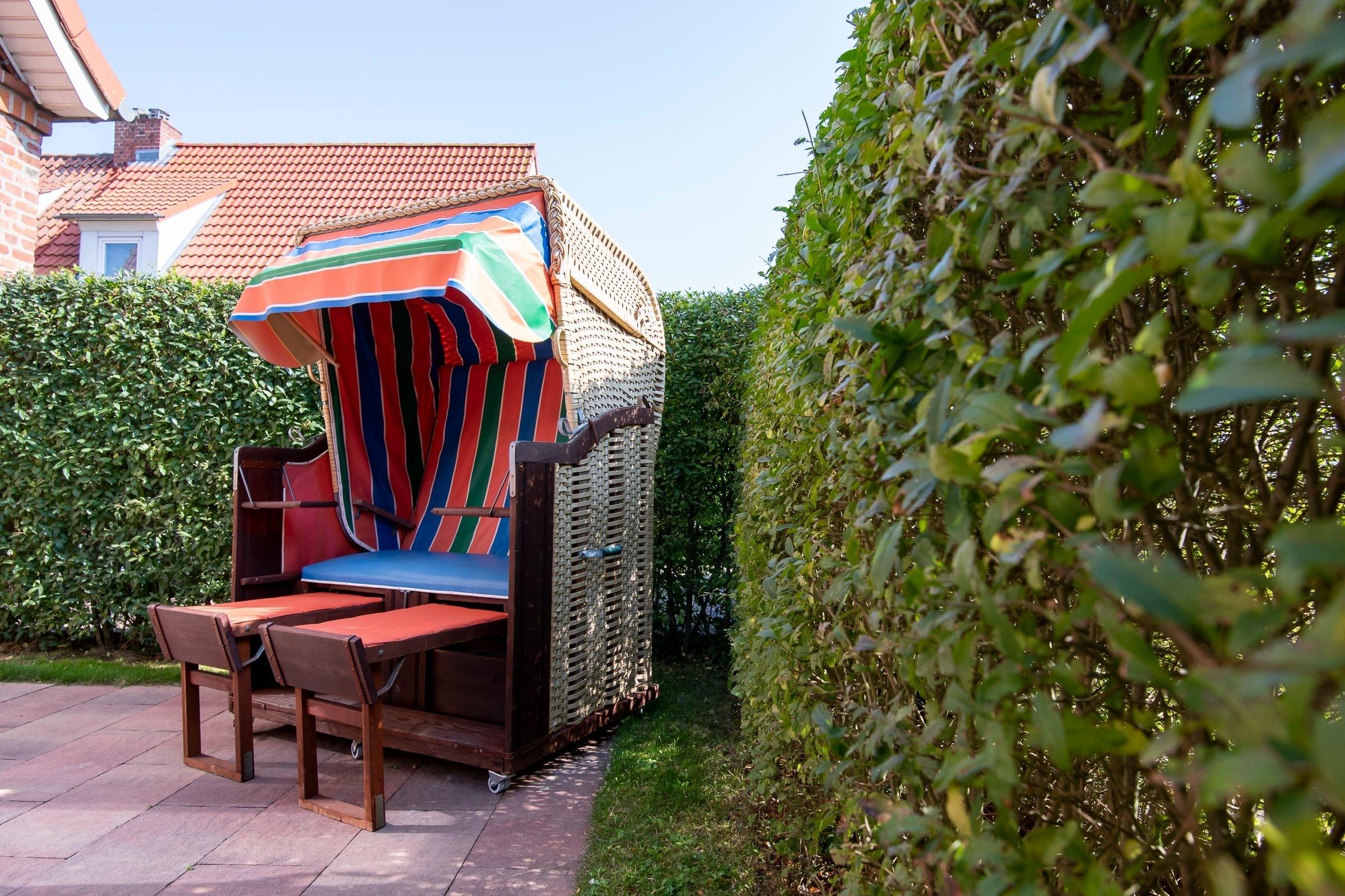 Genießen Sie erholsame Urlaubsstunden auf der möblierten Terrasse mit eigenem Strandkorb vor dem Haus oder toben Sie mit Ihren Kindern im großen Garten - Hier kommt jeder auf seine Kosten.