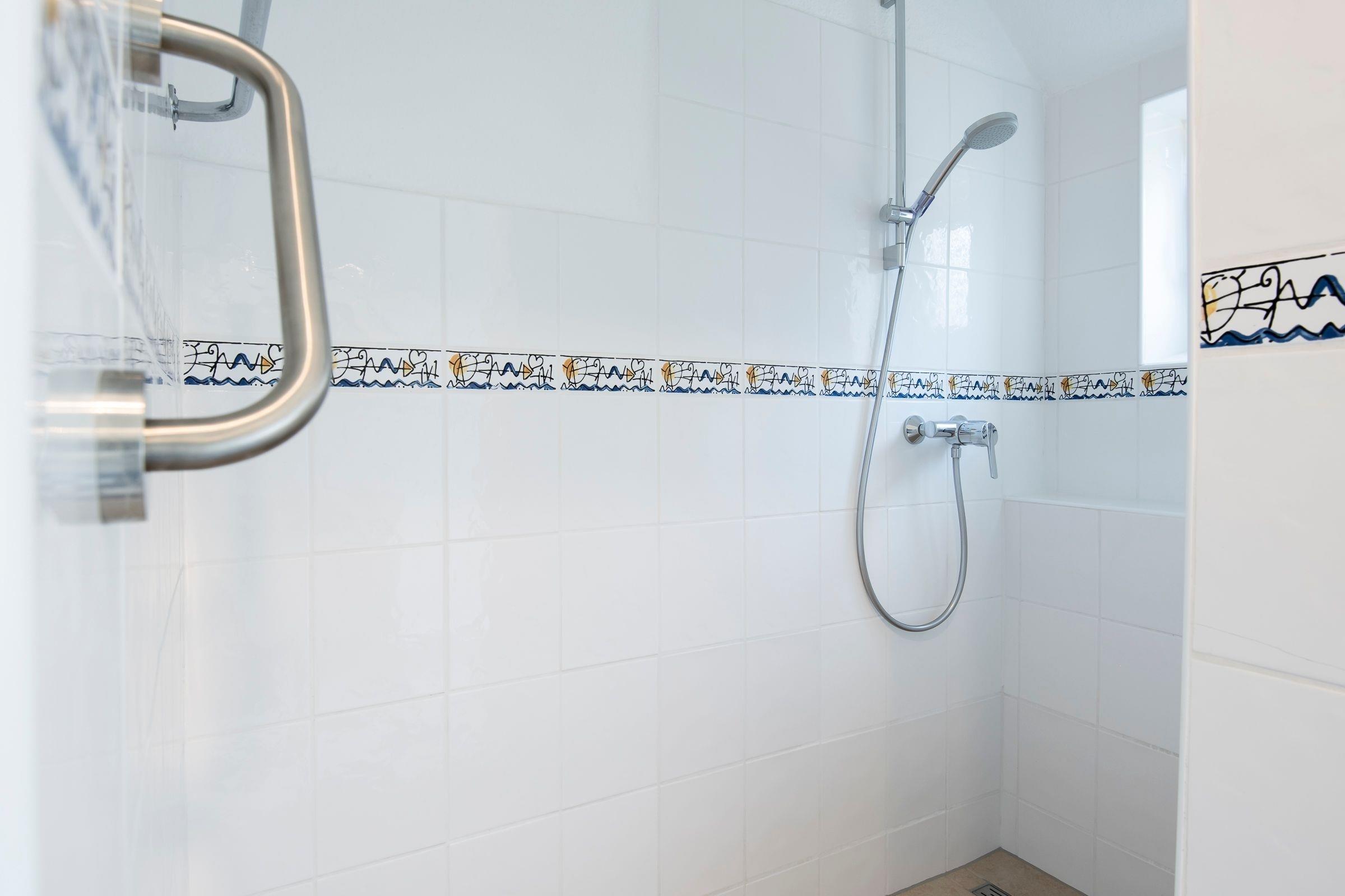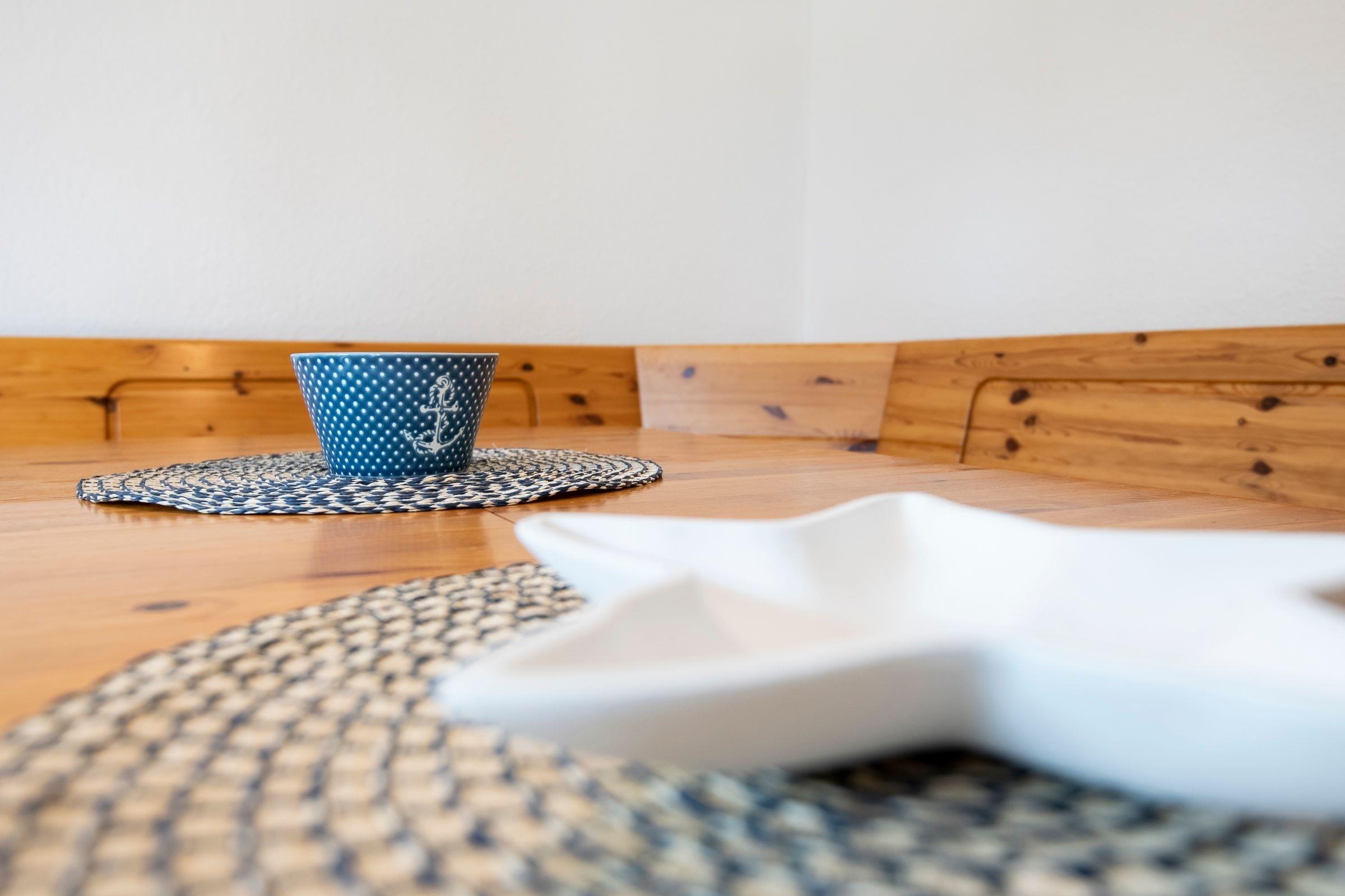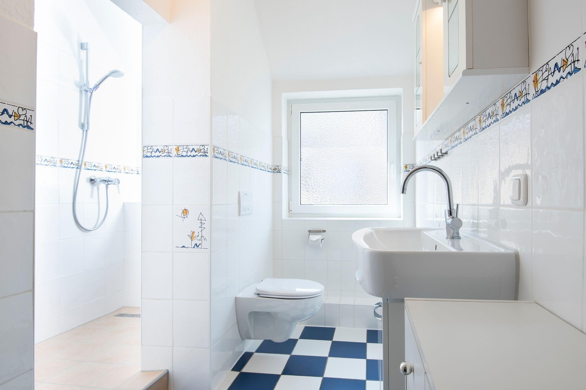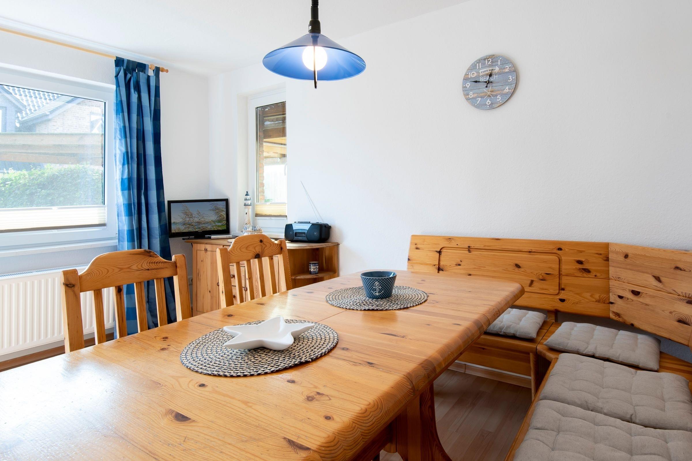 Im Erdgeschoss empfängt Sie ein Flur mit Garderobe und eine Holztreppe, die ins Obergeschoss führt. Auf der linken Seite befindet sich das Esszimmer mit einem Esstisch, einer gemütlichen Eckbank und Esszimmerstühlen sowie einem Fernseher. Die Küche liegt geradeaus durch den Flur auf der linken Seite. Hier stehen Ihnen Annehmlichkeiten wie z. B. ein Herd mit Ceranfeld, ein Backofen, ein Kühlschrank und ein Geschirrspüler zur Verfügung. Ein Kinderhochstuhl gehört zur Grundausstattung. Gegenüber von der Küche liegt ein Badezimmer mit Dusche, WC sowie Waschmaschine und Trockner. In der Dusche sind Haltegriffe und ein Duschstuhl vorhanden. Das Wohnzimmer mit einem gemütlichen Ecksofa, einem Sessel und einem Fernseher befindet sich ebenfalls im Erdgeschoss.
