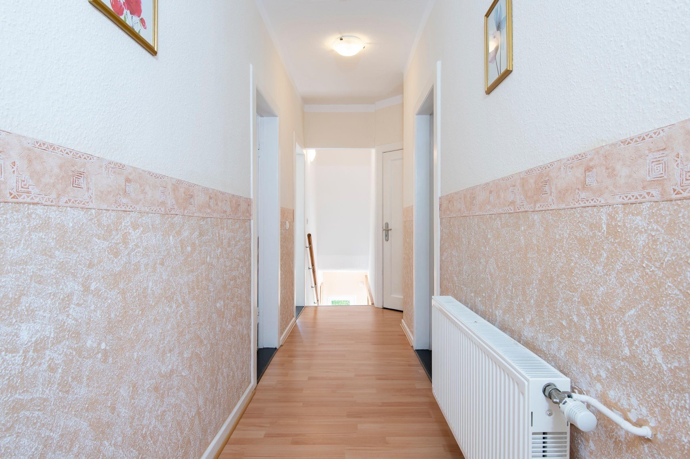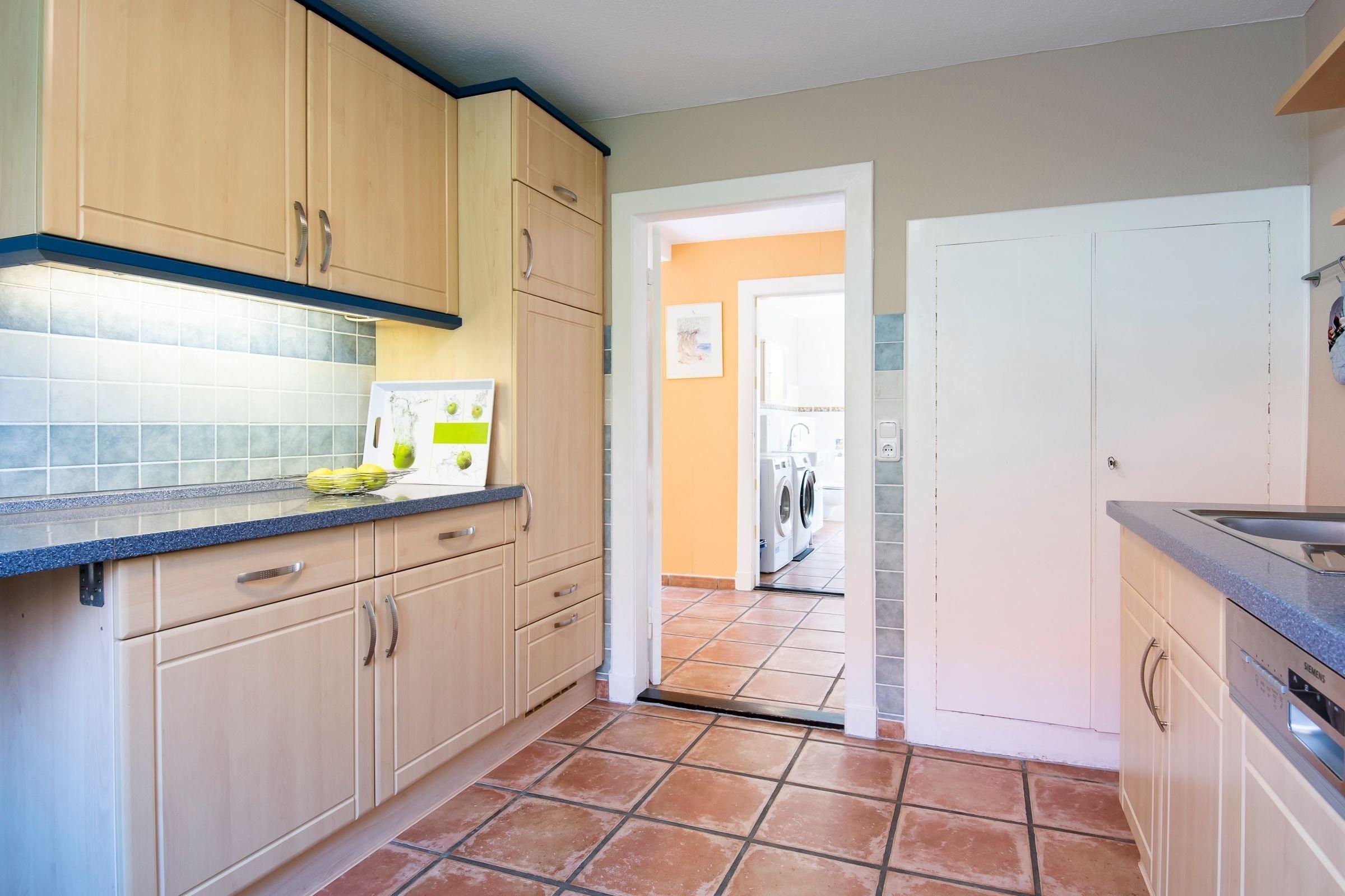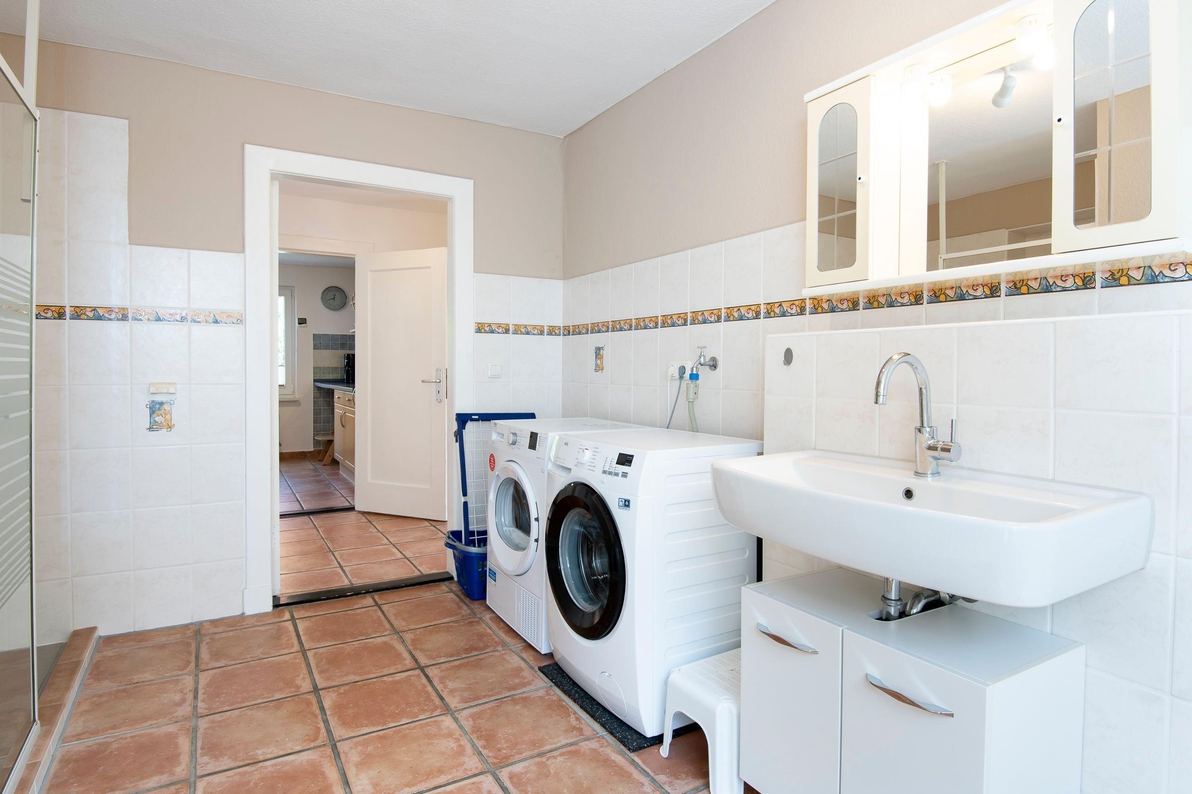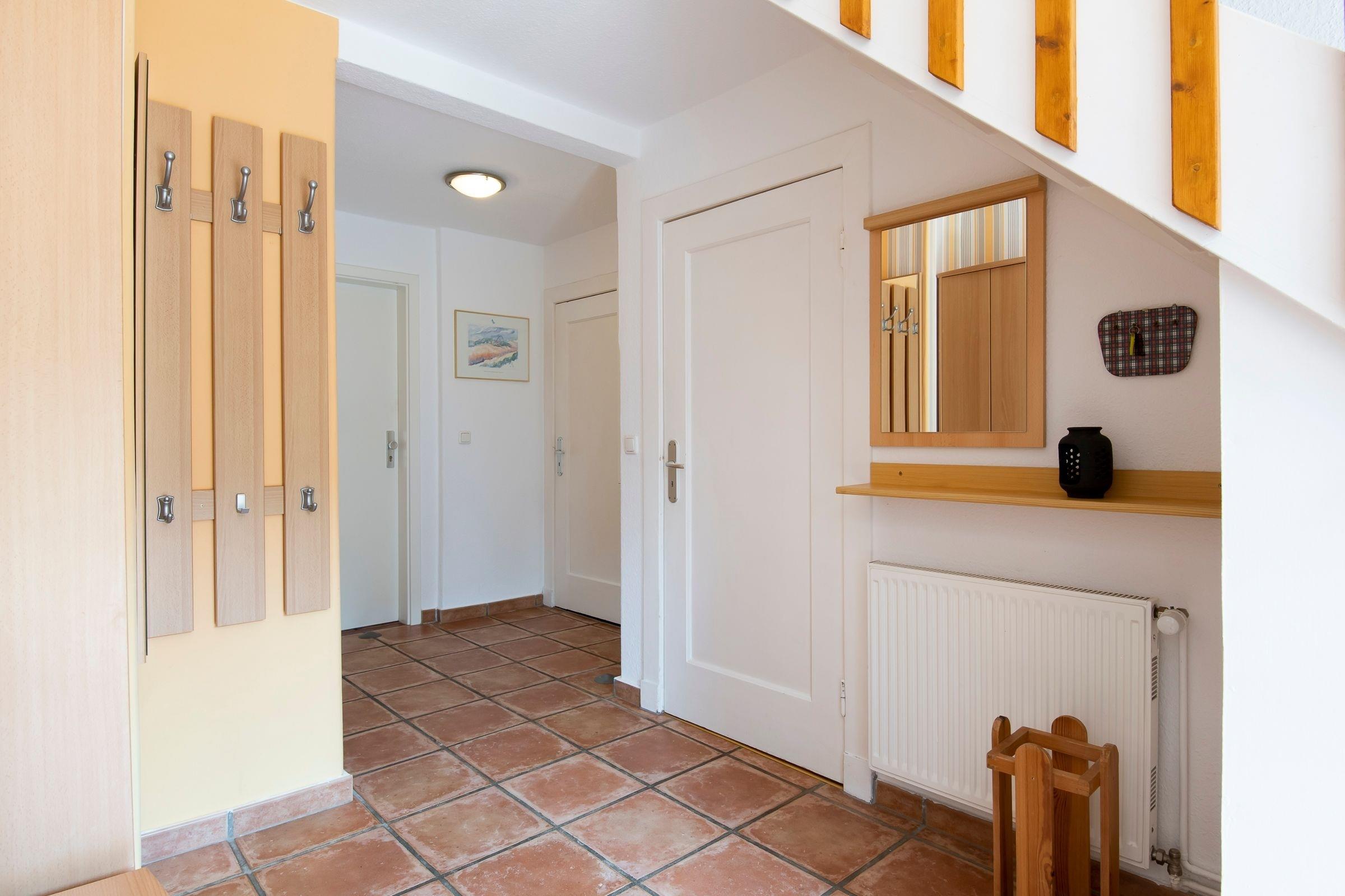 Im Erdgeschoss empfängt Sie ein Flur mit Garderobe und eine Holztreppe, die ins Obergeschoss führt. Auf der linken Seite befindet sich das Esszimmer mit einem Esstisch, einer gemütlichen Eckbank und Esszimmerstühlen sowie einem Fernseher. Die Küche liegt geradeaus durch den Flur auf der linken Seite. Hier stehen Ihnen Annehmlichkeiten wie z. B. ein Herd mit Ceranfeld, ein Backofen, ein Kühlschrank und ein Geschirrspüler zur Verfügung. Ein Kinderhochstuhl gehört zur Grundausstattung. Gegenüber von der Küche liegt ein Badezimmer mit Dusche, WC sowie Waschmaschine und Trockner. In der Dusche sind Haltegriffe und ein Duschstuhl vorhanden. Das Wohnzimmer mit einem gemütlichen Ecksofa, einem Sessel und einem Fernseher befindet sich ebenfalls im Erdgeschoss.