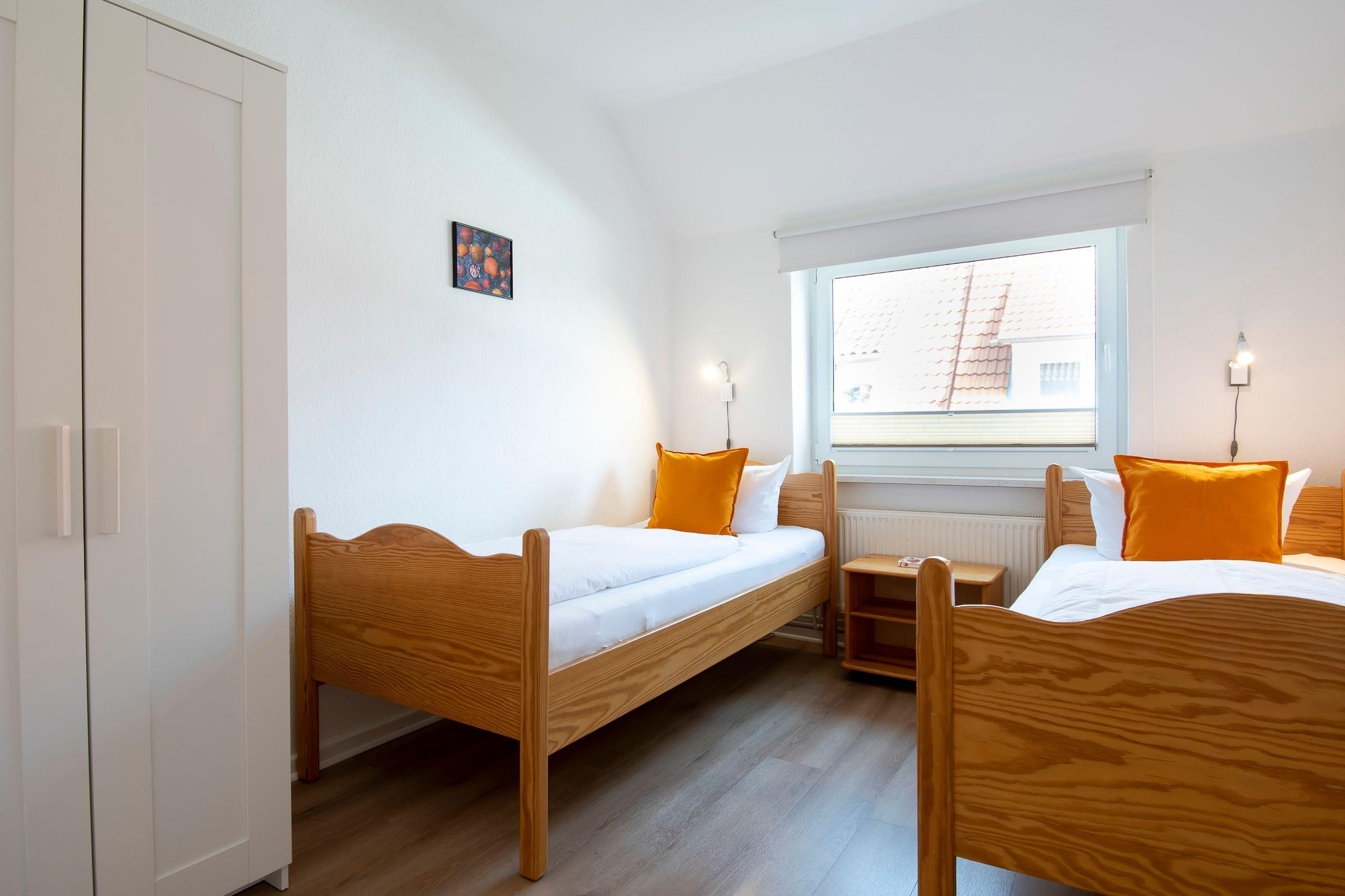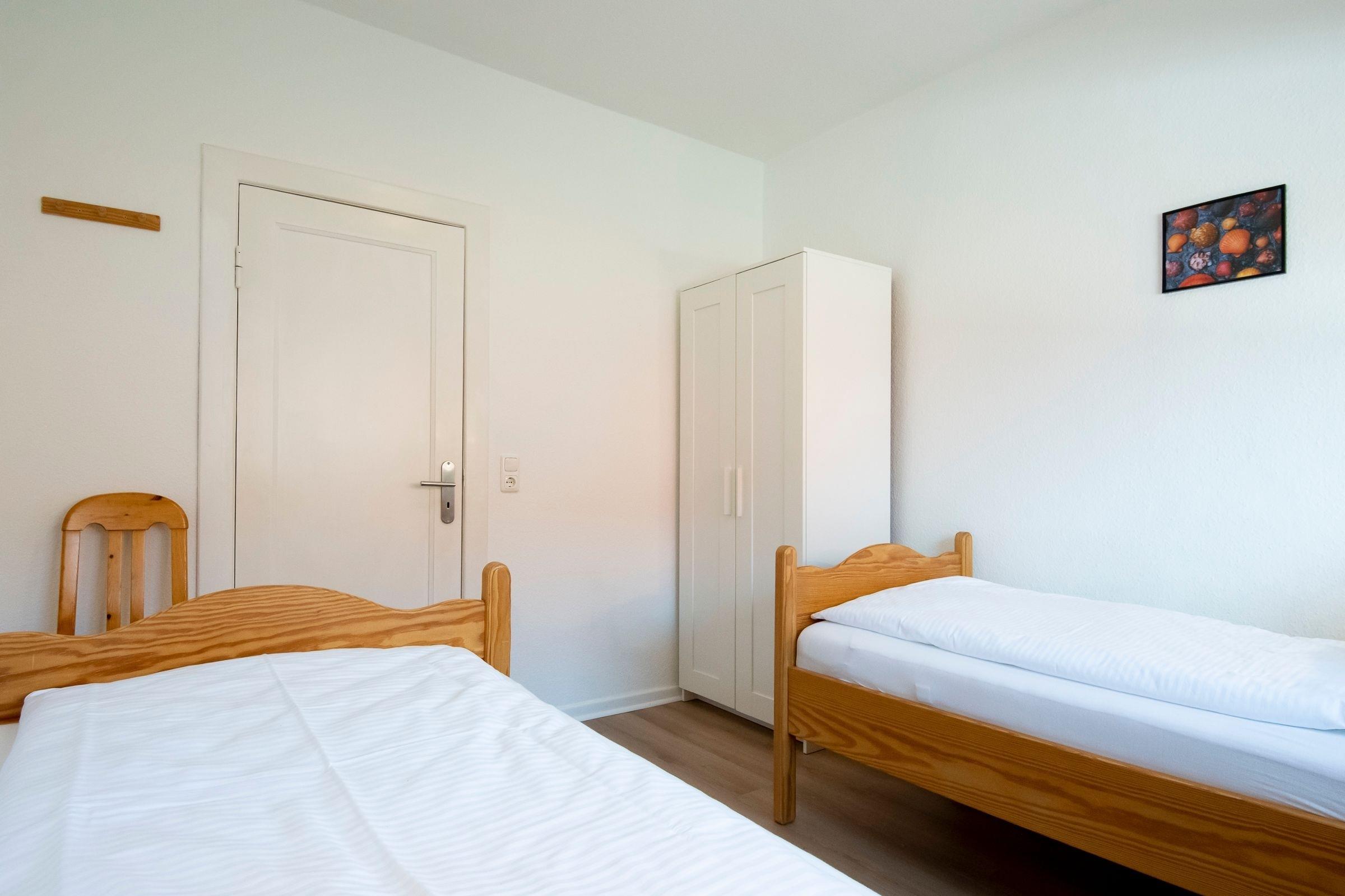 Schlafzimmer 3: 2 Einzelbetten (2x 90x200 cm), Plissees und Rollos vorhanden, Kleiderschrank
