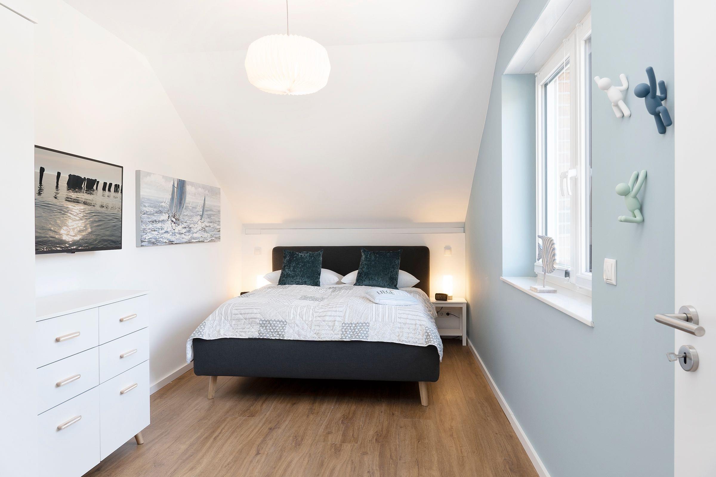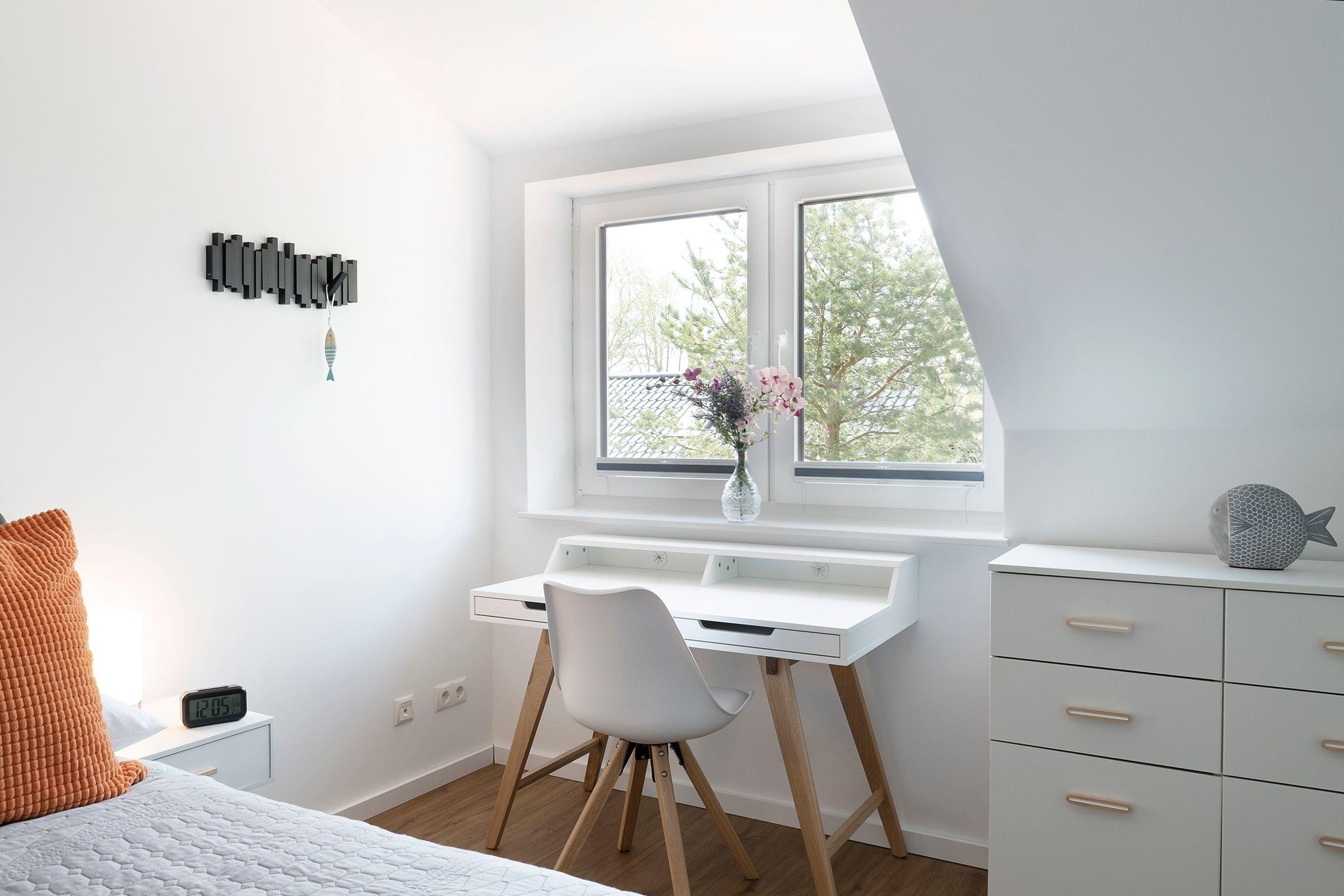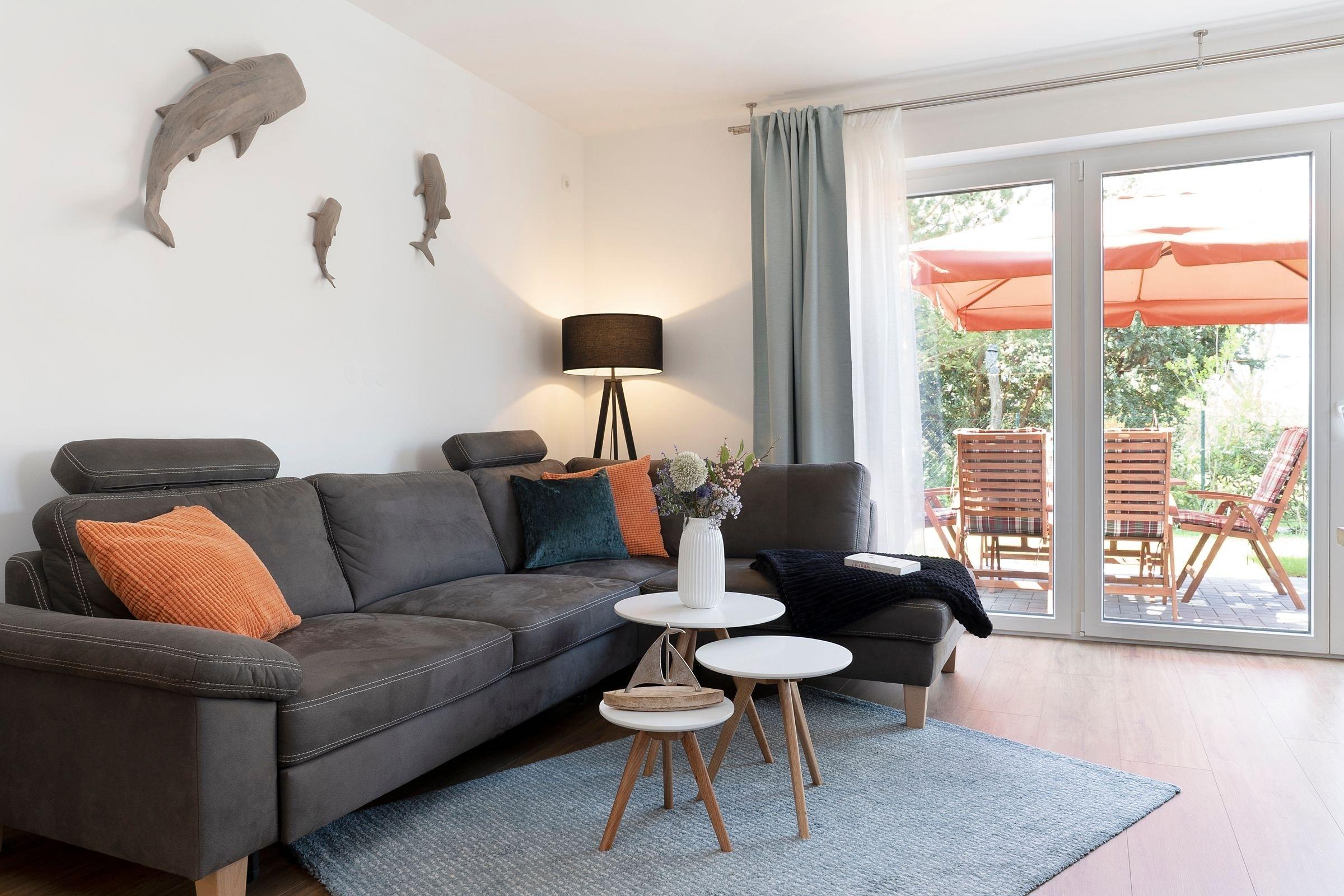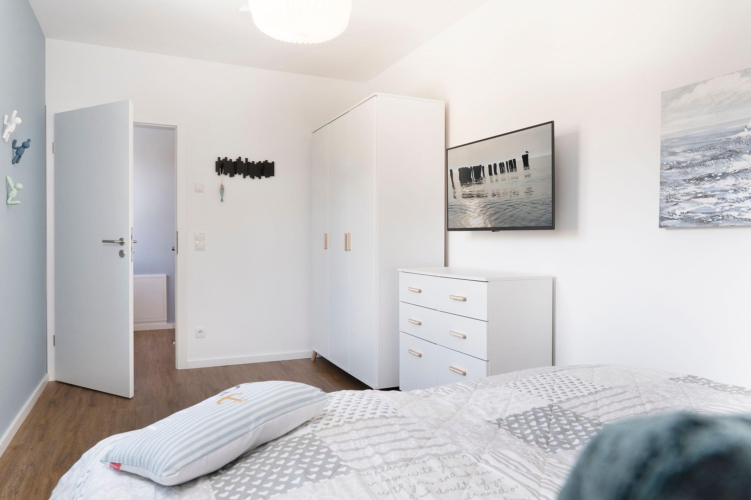 Das Herzstück dieses modern eingerichteten Feriendomizils bildet das zum Essbereich und zur Küche offen gestaltete, großzügige Wohnzimmer. Hier können Sie gemeinsam kochen, essen, lachen und die Seele baumeln lassen. Für gemeinsame Spieleabende finden Sie hier eine liebevoll zusammengestellte Auswahl an Gesellschaftsspielen. Die drei individuell eingerichteten Schlafzimmer mit jeweils eigenem TV bilden die perfekten Rückzugsorte. Im Erdgeschoss finden Sie ein Schlafzimmer mit einem Boxspring-Einzelbett (100x200 cm). Und im Obergeschoss sind die beiden Schlafräume jeweils mit einem Doppelbett (2x 80x200 cm bzw. 2x 90x200 cm) ausgestattet. Dank praktischer Außenjalousien bzw. Plissees sind Sie nachts bestens abgeschirmt und können sich auf einen erholsamen Schlaf freuen. Sie haben viel Programm für den nächsten Urlaubstag geplant? Dank der zwei modernen Duschbäder kommt keine Hektik auf und Sie starten entspannt in den Tag. Neben den ebenerdigen Duschen runden hier gemütliche Fußbodenheizungen das Wohlfühlerlebnis ab. Im Strandkorb auf der Terrasse lassen Sie gemütlich den Tag ausklingen - genießen Sie hier die gesunde Ostseeluft bei einem gut temperierten Glas Wein aus dem Weinkühlschrank.