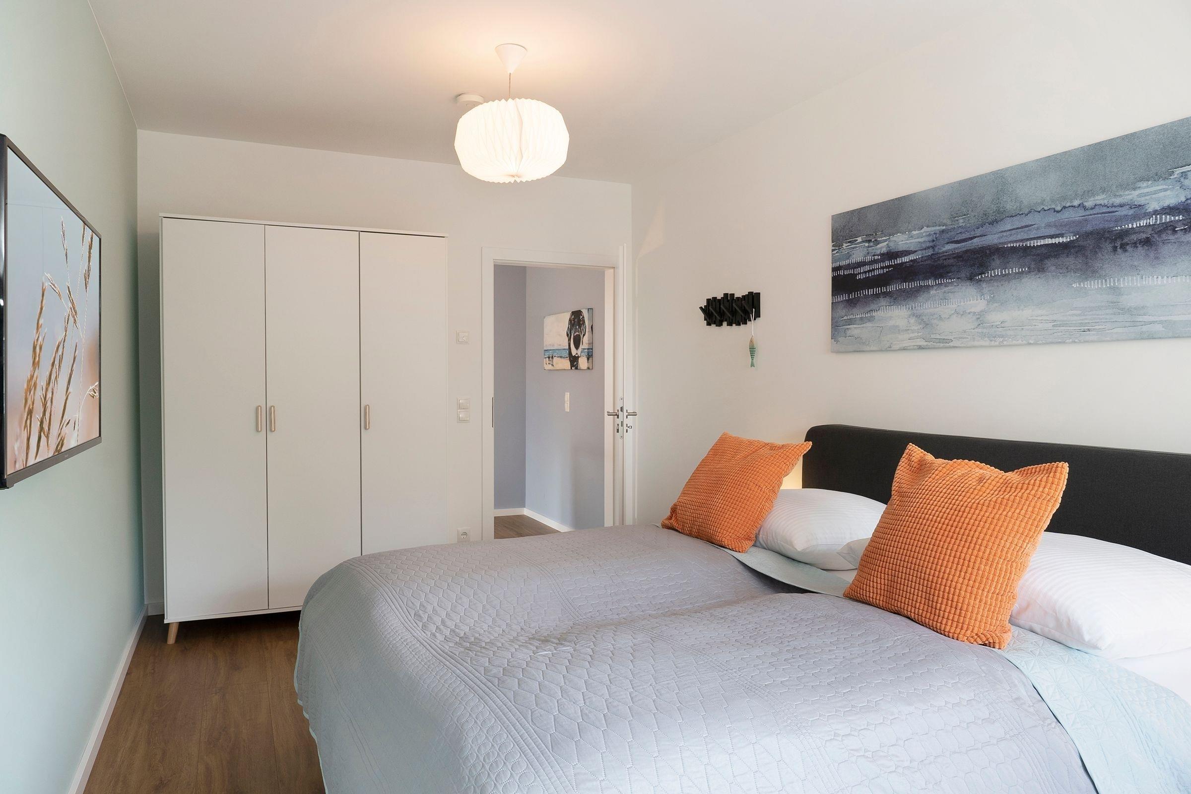 Schlafzimmer 2 (1.OG): Doppelbett (2x 80x200cm), Kleiderschrank, Verdunkelung: Außenjalousien, TV, Platz für Kinderreisebett