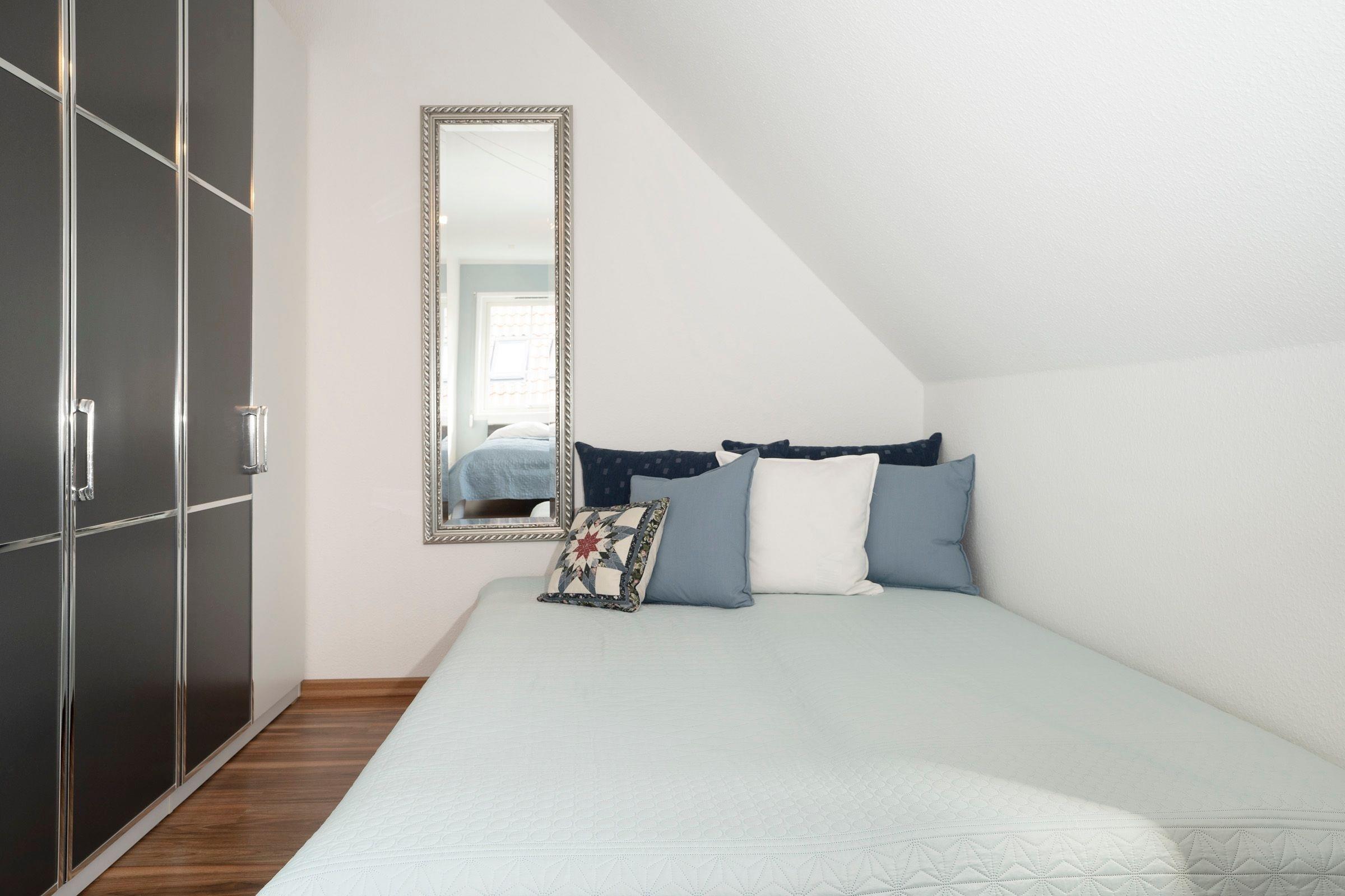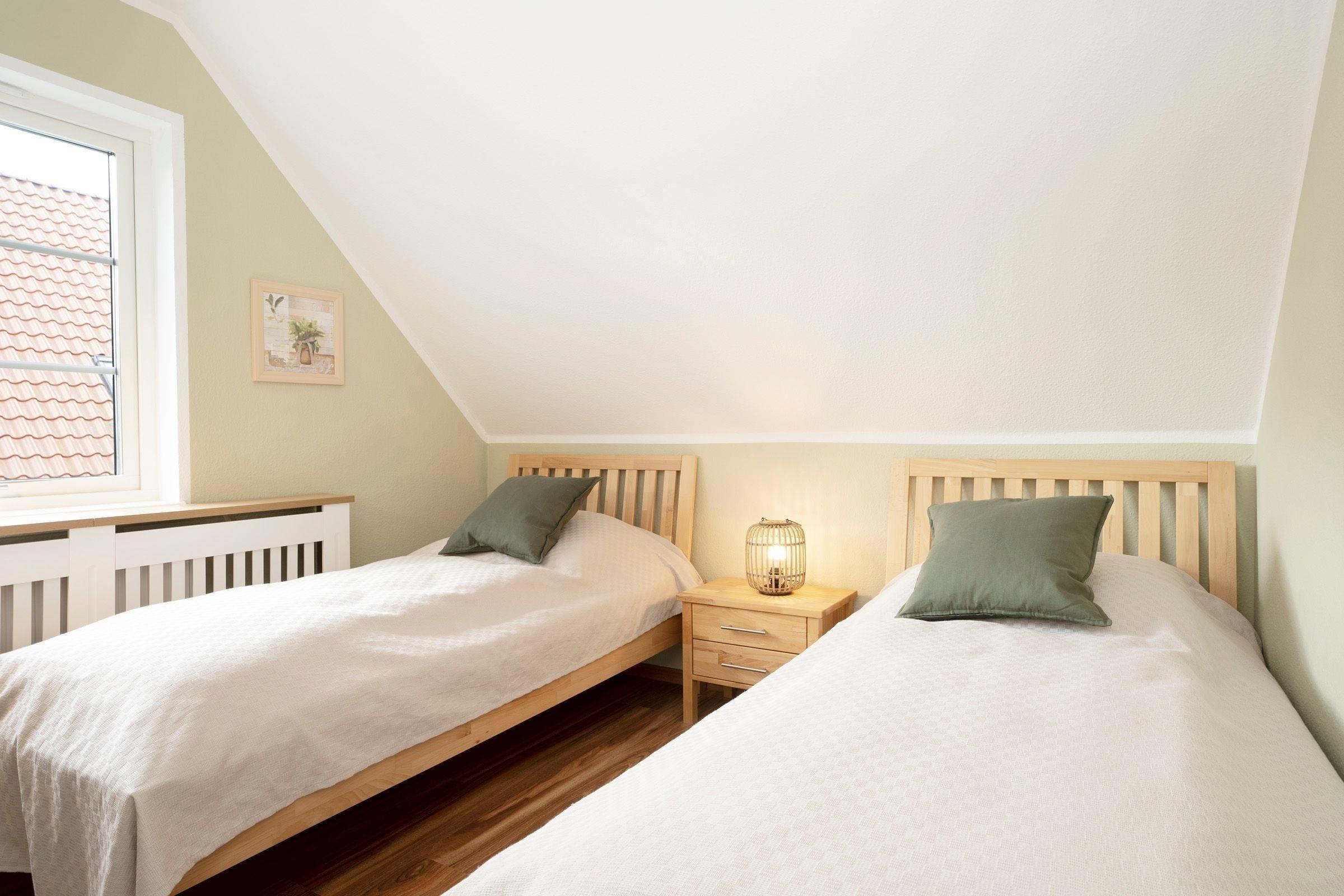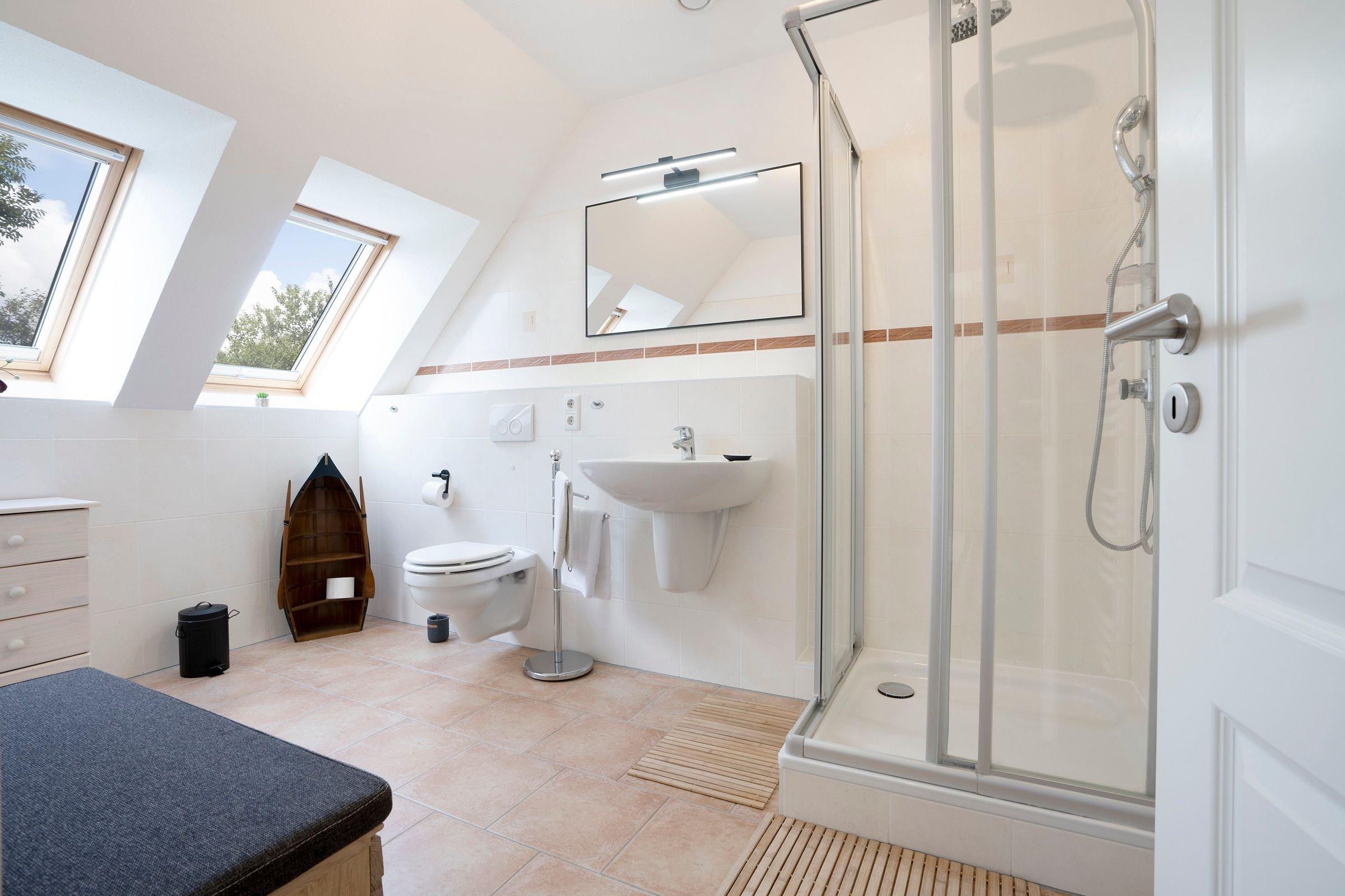 Die nötige Erholung bekommen Sie in der oberen Etage, wo sich die beiden Schlafzimmer und das Vollbad befinden. Die Schlafräume bieten einmal mit einem Doppelbett (2x 90x200 cm) und einer Schlafcouch (2x 85x200 cm), sowie zwei Einzelbetten (je 100x200 cm) im zweiten Schlafzimmer genug Rückzugsmöglichkeiten für Sie und Ihre Familie. Das Meersalz nach einem langen Strandtag waschen Sie sich in der bodengleichen Dusche im nebenliegenden Tageslichtbad ab.