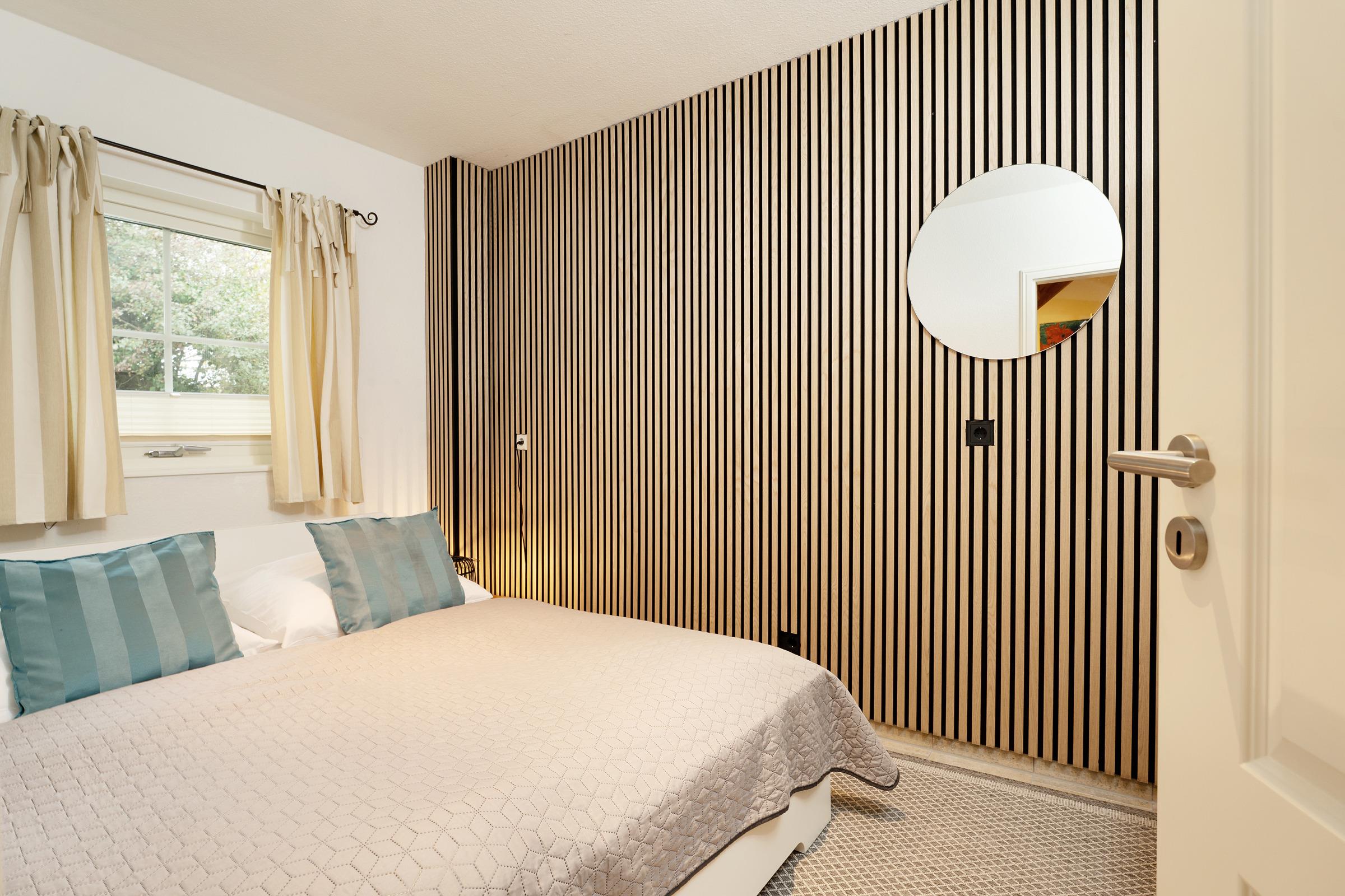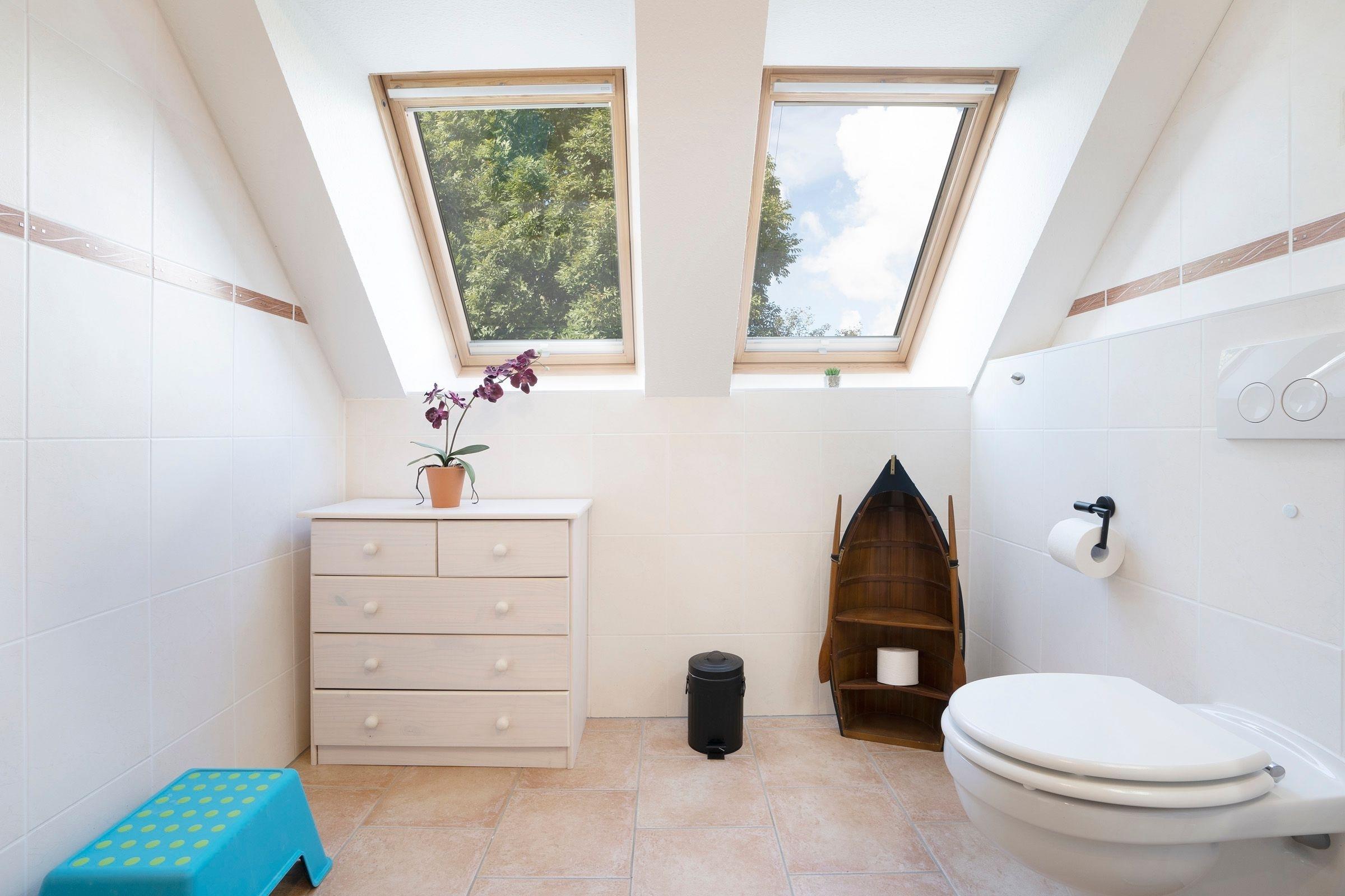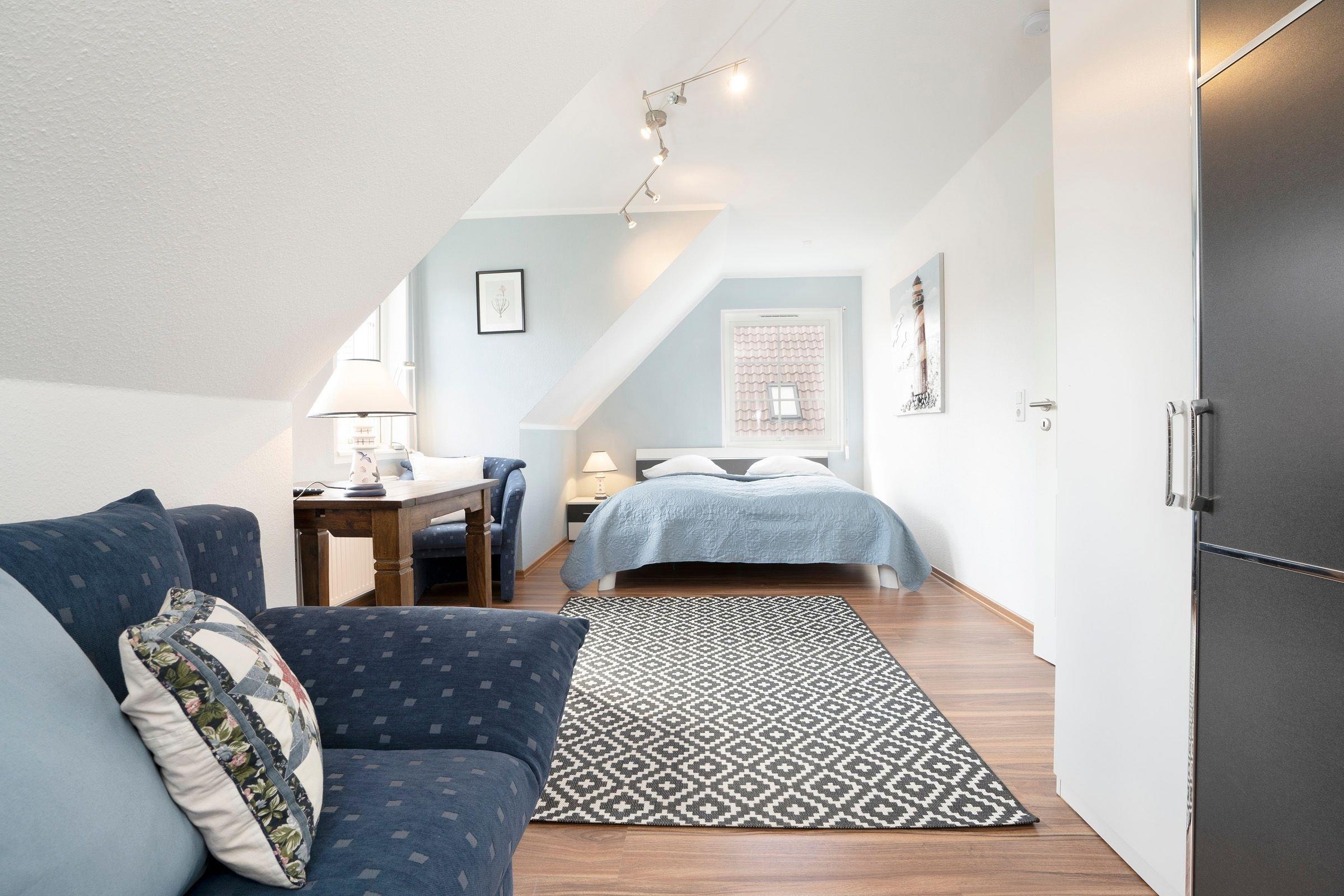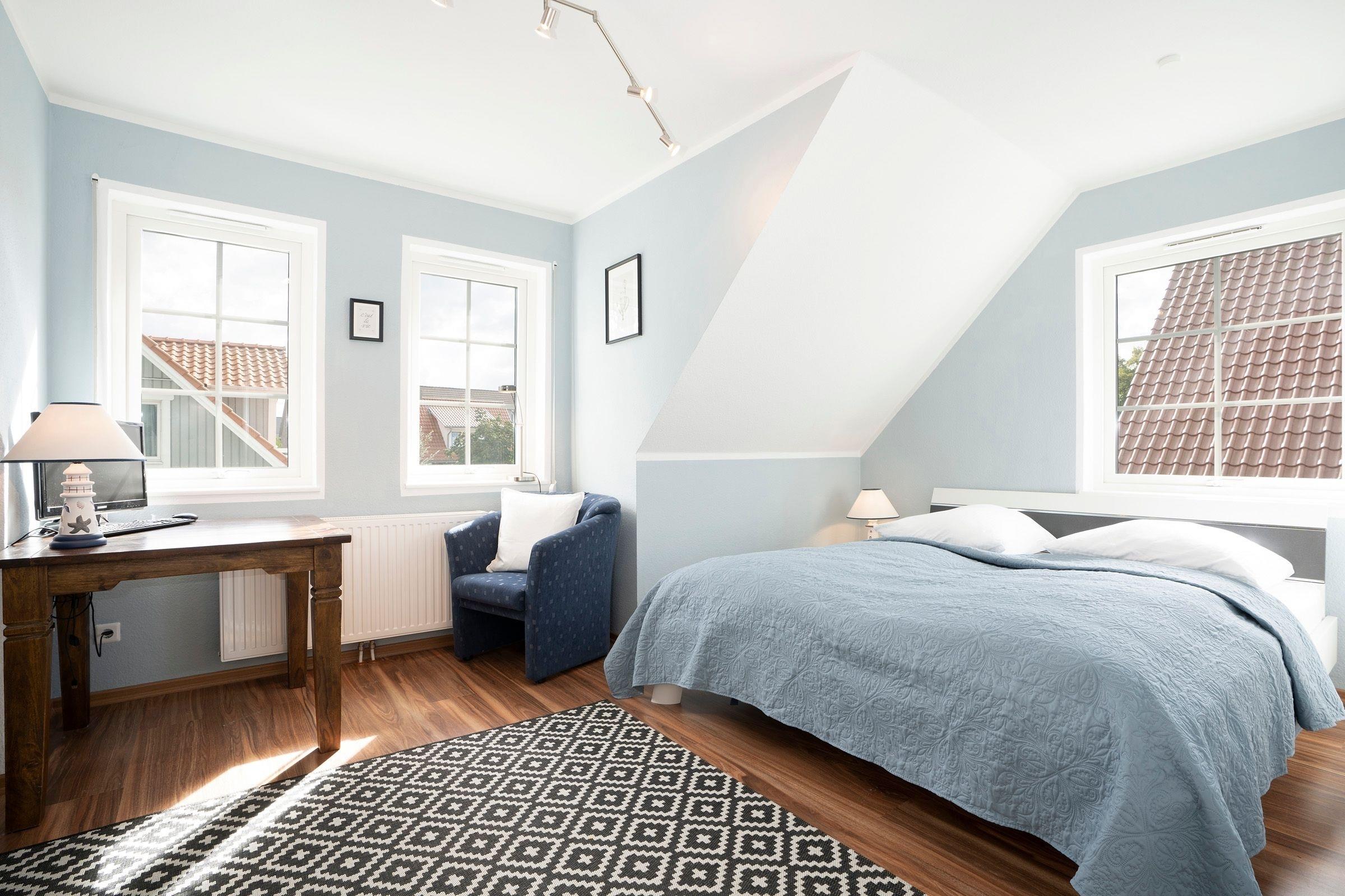 Die nötige Erholung bekommen Sie in der oberen Etage, wo sich die beiden Schlafzimmer und das Vollbad befinden. Die Schlafräume bieten einmal mit einem Doppelbett (2x 90x200 cm) und einer Schlafcouch (2x 85x200 cm), sowie zwei Einzelbetten (je 100x200 cm) im zweiten Schlafzimmer genug Rückzugsmöglichkeiten für Sie und Ihre Familie. Das Meersalz nach einem langen Strandtag waschen Sie sich in der bodengleichen Dusche im nebenliegenden Tageslichtbad ab.