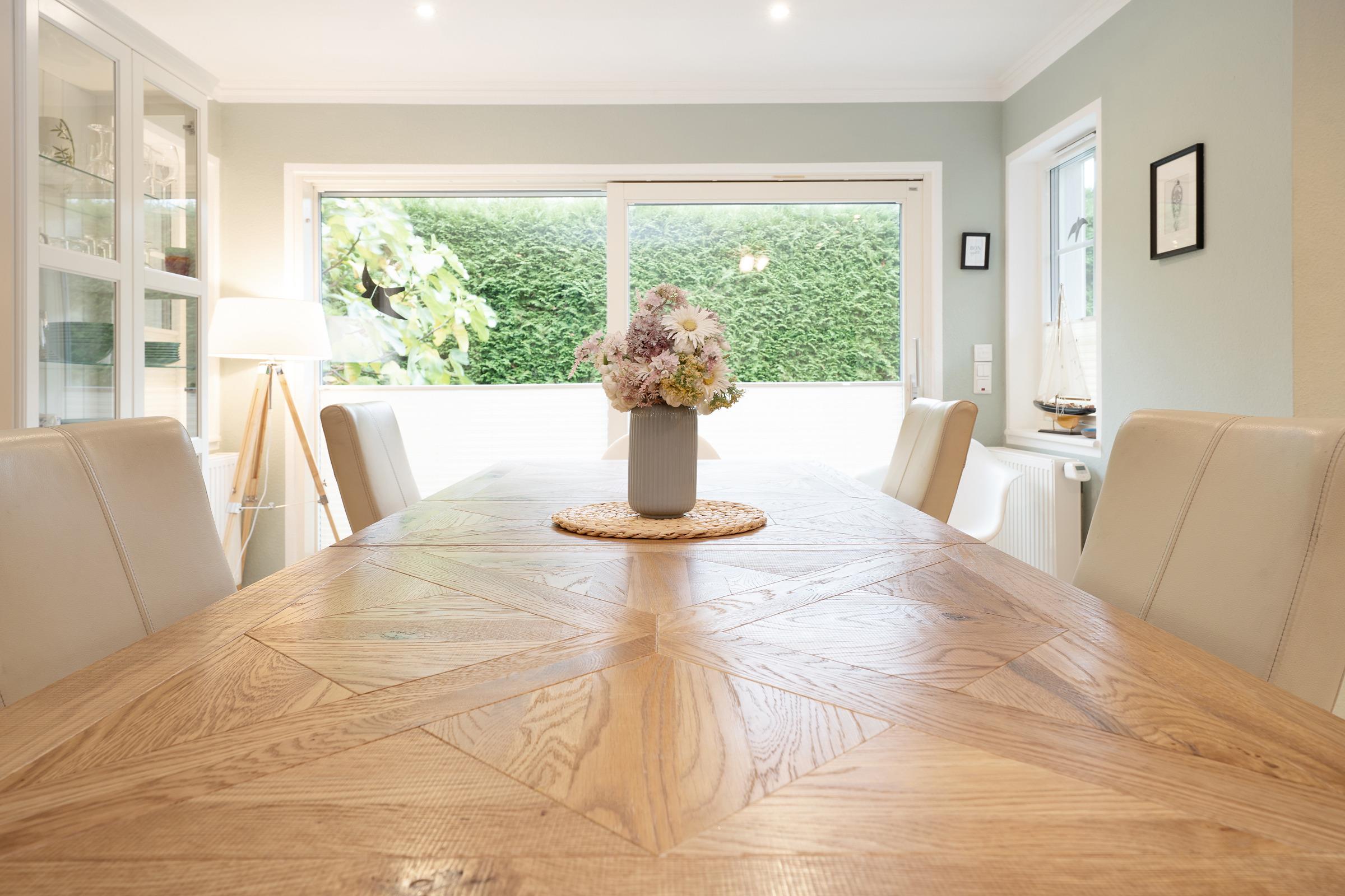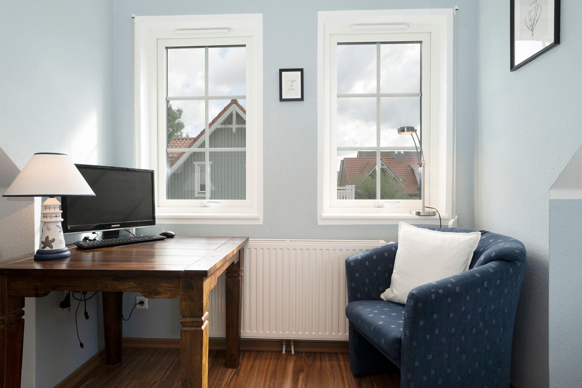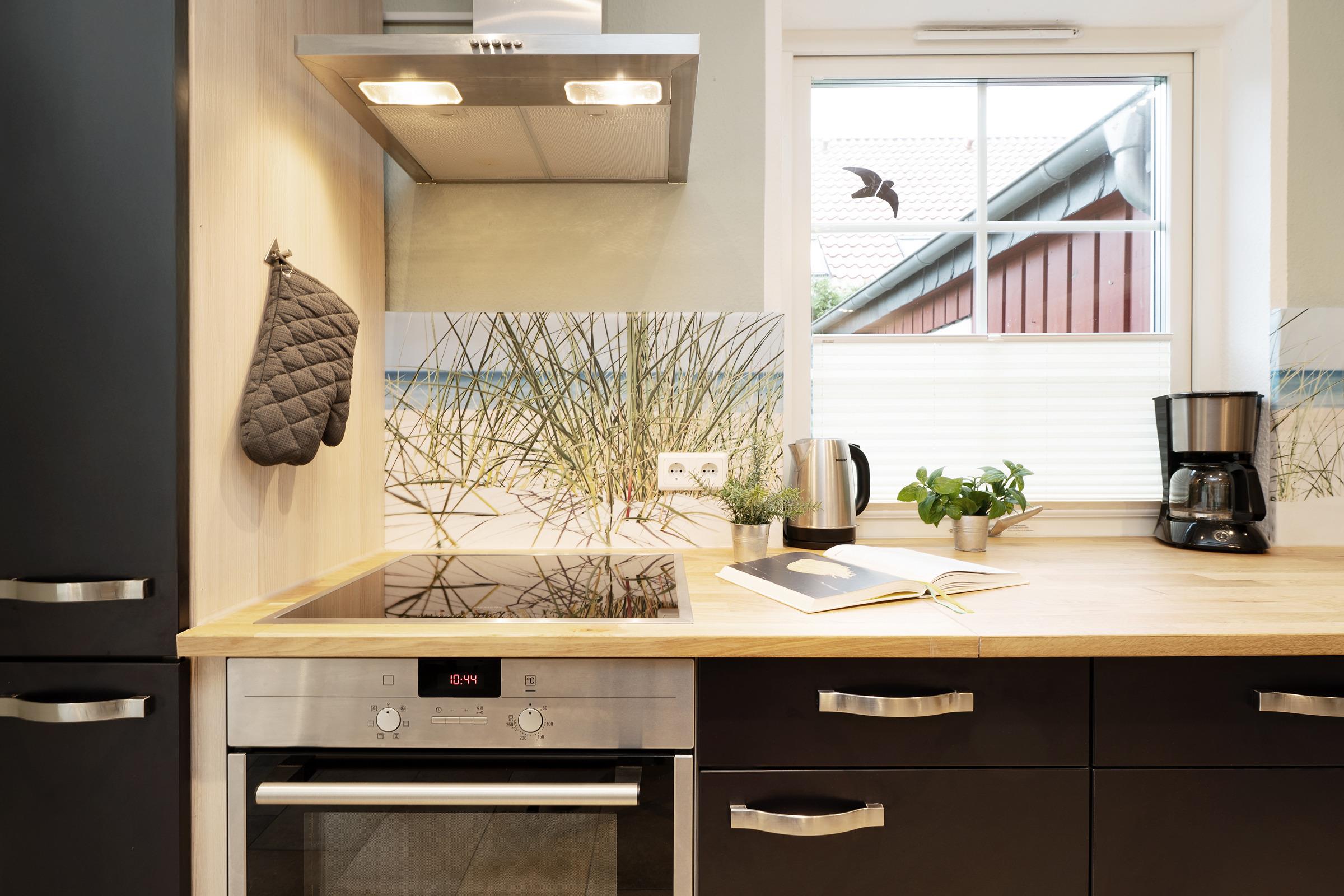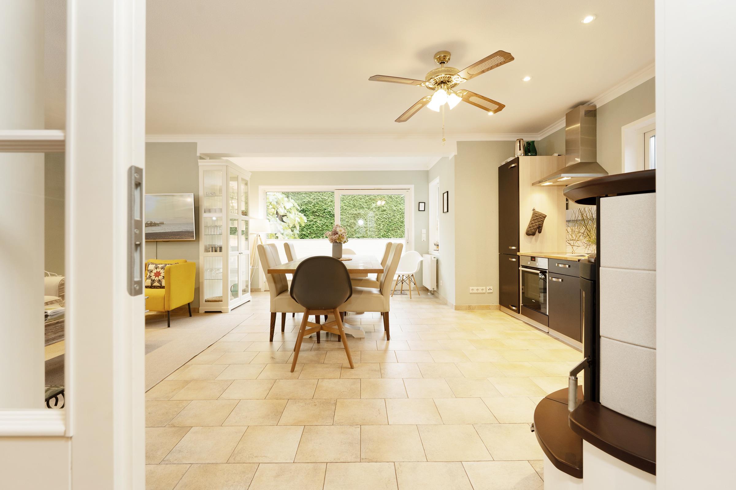 Ankommen und Wohlfühlen - in dieser Doppelhaushälfte werden Sie vom großzügigen Eingangsbereich direkt in das Wohn- und Esszimmer geleitet. Die geschmackvolle Einrichtung umfasst neben einer gemütlichen Couch noch einen Kamin mit Sichtfenster, Smart-TV und einer Bluetooth-Musikbox, sodass entspannenden Urlaubstagen nichts im Wege steht. Die offene, moderne Küche bietet Ihnen mit der Cafissimo-Kaffeemaschine, einer weiteren Bluetooth-Box, einer Spülmaschine und großzügiger Ausstattung alles, was Sie für einen angenehmen Urlaub benötigen. Besonders praktisch ist das Gäste-WC, das sich ebenfalls im Erdgeschoss befindet.