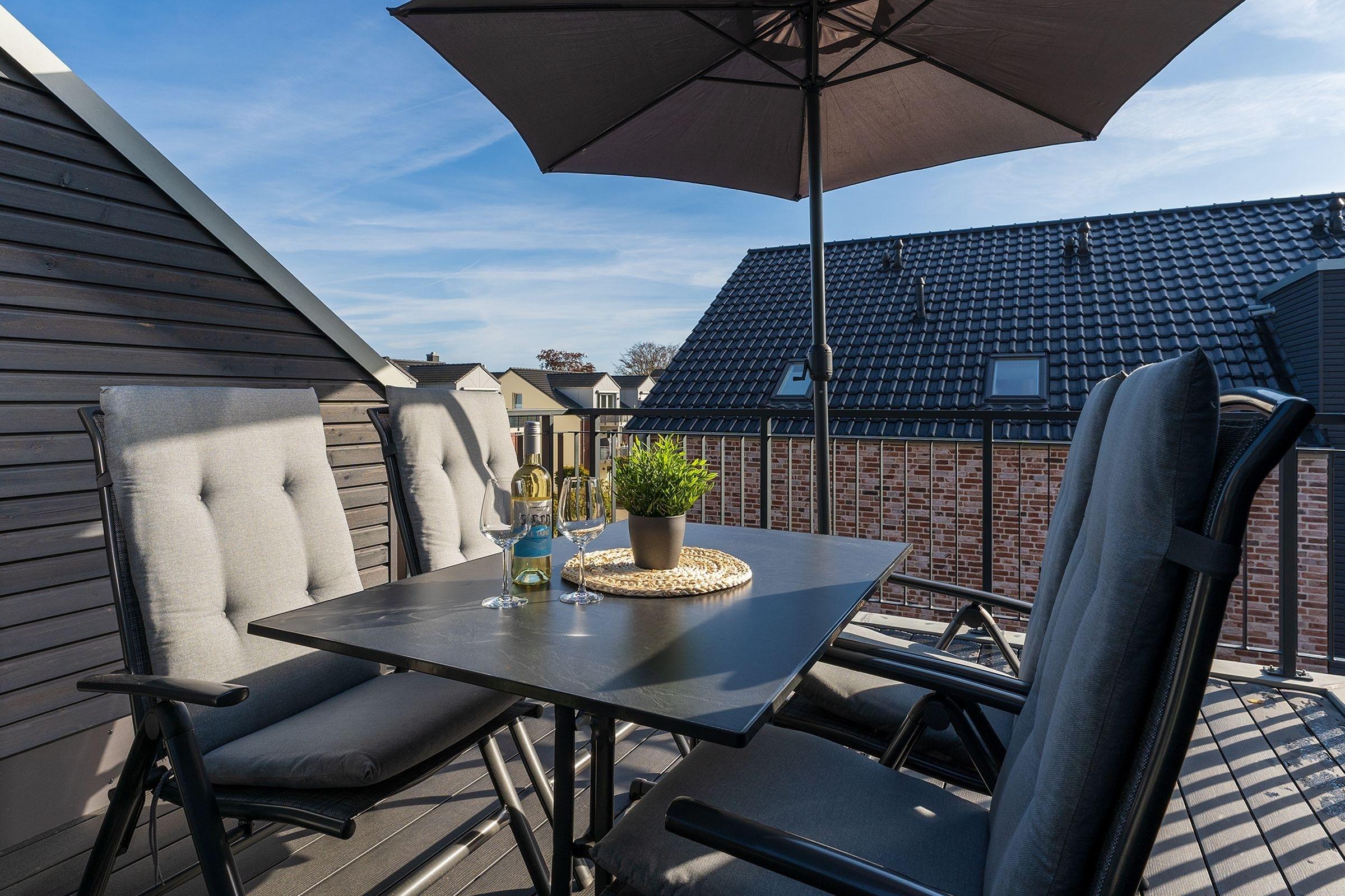 Das Herzstück dieser Wohnung bildet das Wohnzimmer mit Schlafsofa (130x200cm) und offener Küche, welche zum Verweilen und gemeinsamen Kochen einlädt. Von dort gelangen Sie auf den Balkon mit Südausrichtung, der mit Sonnenschirm und Balkonmöbeln ausgestattet ist. Für die Erholung im Urlaub gibt es ein separates Schlafzimmer, das sich mit Jalousien abdunkeln lässt, und mit eigenem TV und Boxspringbett (2x 90x200cm) überzeugt. Das Tageslichtbad verfügt über eine bodengleiche Dusche und Annehmlichkeiten wie einen Haartrockner und eine Handtuchheizung, damit es Ihnen an nichts fehlt, wenn Sie aus der eigenen Sauna kommen. Als weitere Besonderheit verfügt die gesamte Wohnung über eine angenehme Fußbodenheizung. Kostenfreies WLAN und ein Internetradio stehen hier zur Verfügung.