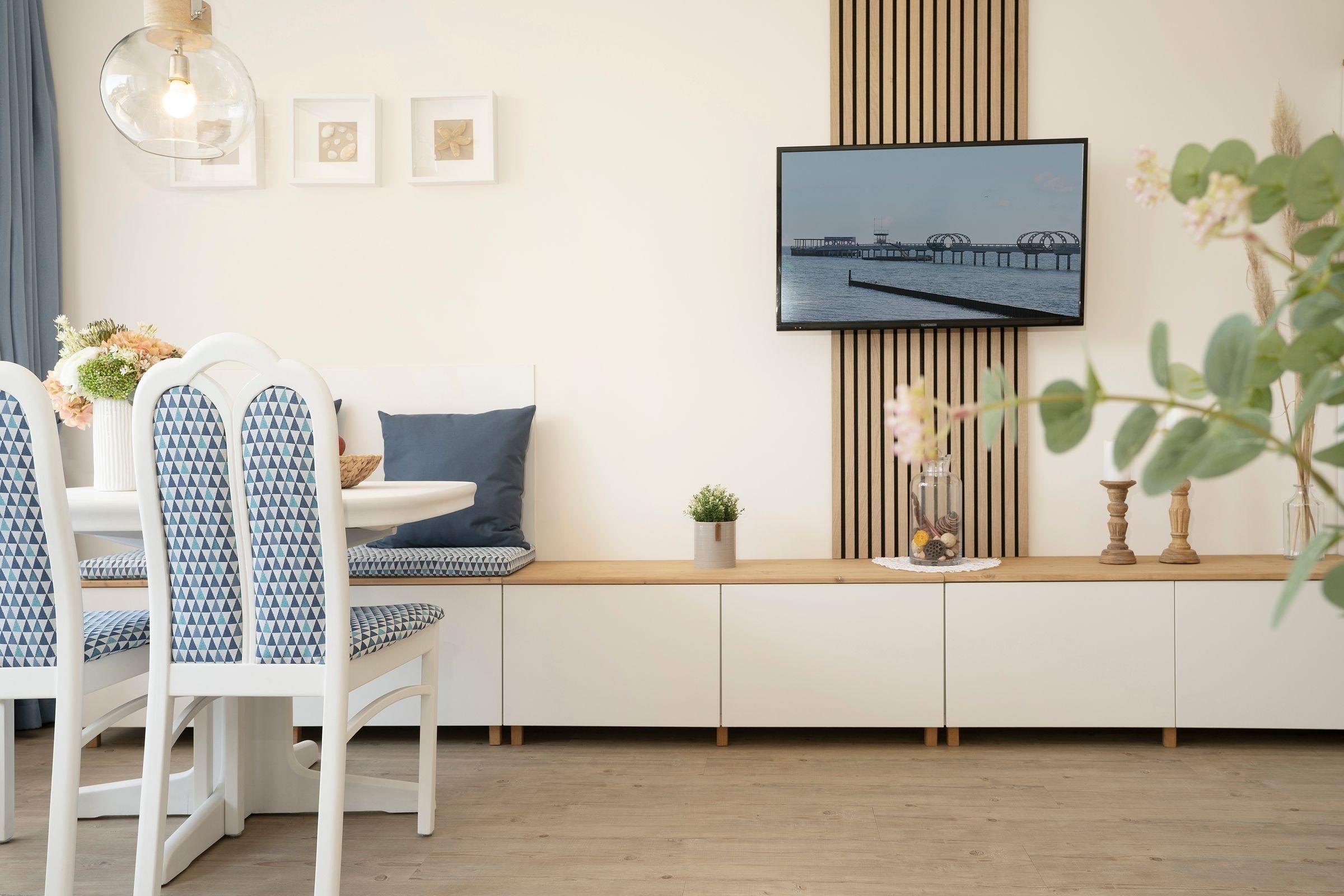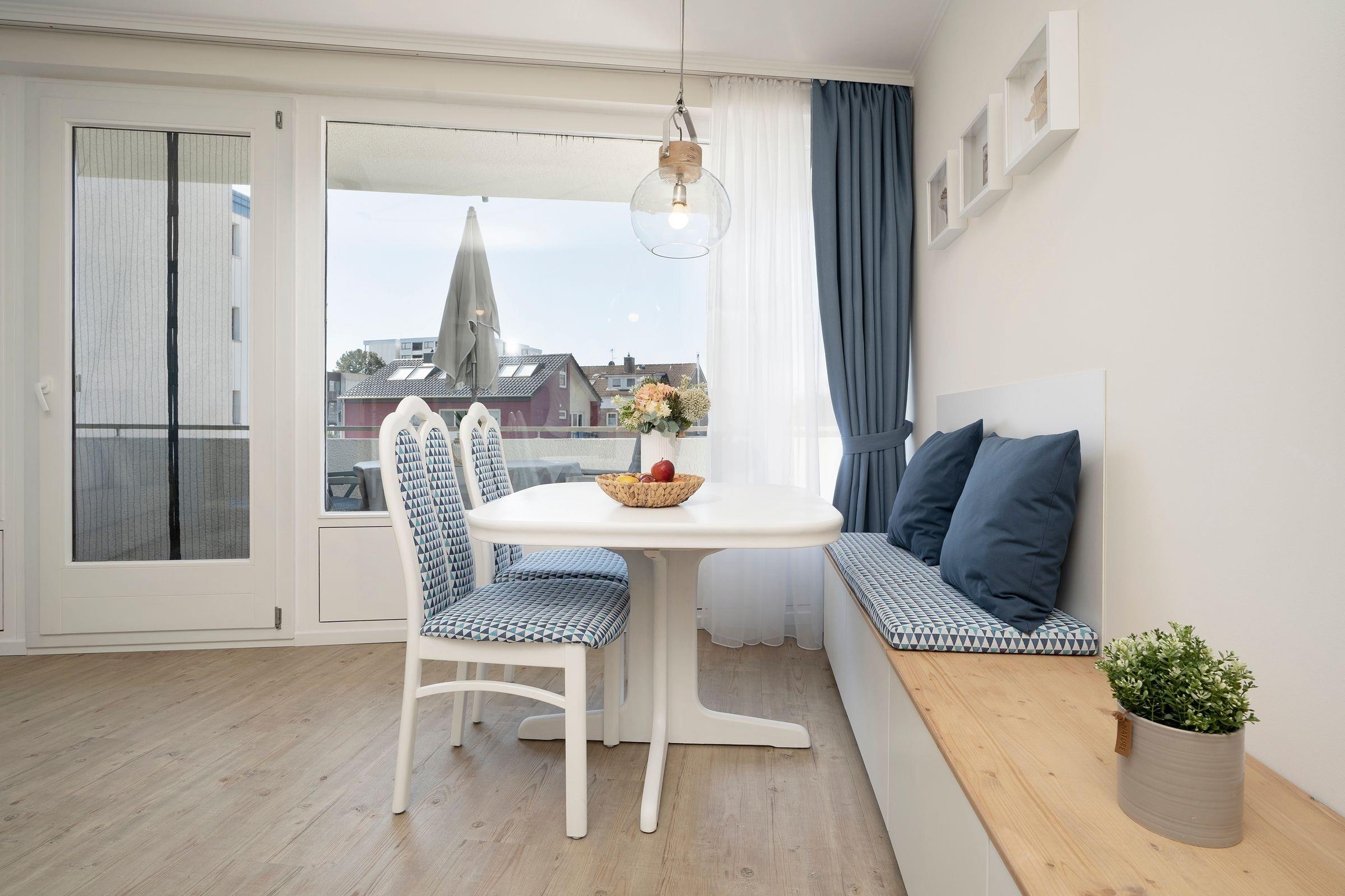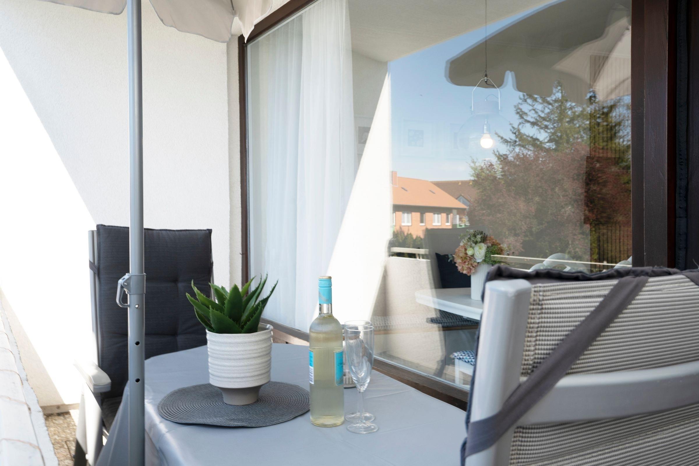 Der helle und gemütliche Wohnbereich empfängt Sie mit einem Schlafsofa (140x200 cm) mit Gelschaumtopper, einem komfortablen Leder-Sessel mit elektrischer Steuerung und Fußstütze sowie einem Flachbild-TV. Die offen gestaltete, moderne Küchenzeile bietet Stauraum für Ihre Einkäufe und viele Annehmlichkeiten wie Geschirrspülmaschine, Toaster, Eierkocher, Mikrowelle mit Grillfunktion, Kaffeemaschine mit Thermoskanne etc. Der Essplatz lädt zum gemeinsamen Essen und zu Spieleabenden ein. Dafür lässt sich der Tisch extra ausziehen und Ihren Bedürfnissen anpassen. Bücher und Brettspiele befindet sich in der Wohnung. Zahlreiche Stunden an der frischen Ostseeluft können Sie auf dem überdachten, möblierten Süd-Balkon in Ruhe genießen. Eine Solarlichterkette zaubert hier zur Dämmerung ein stimmungsvolles Licht. So kann man den Abend prima ausklingen lassen ...