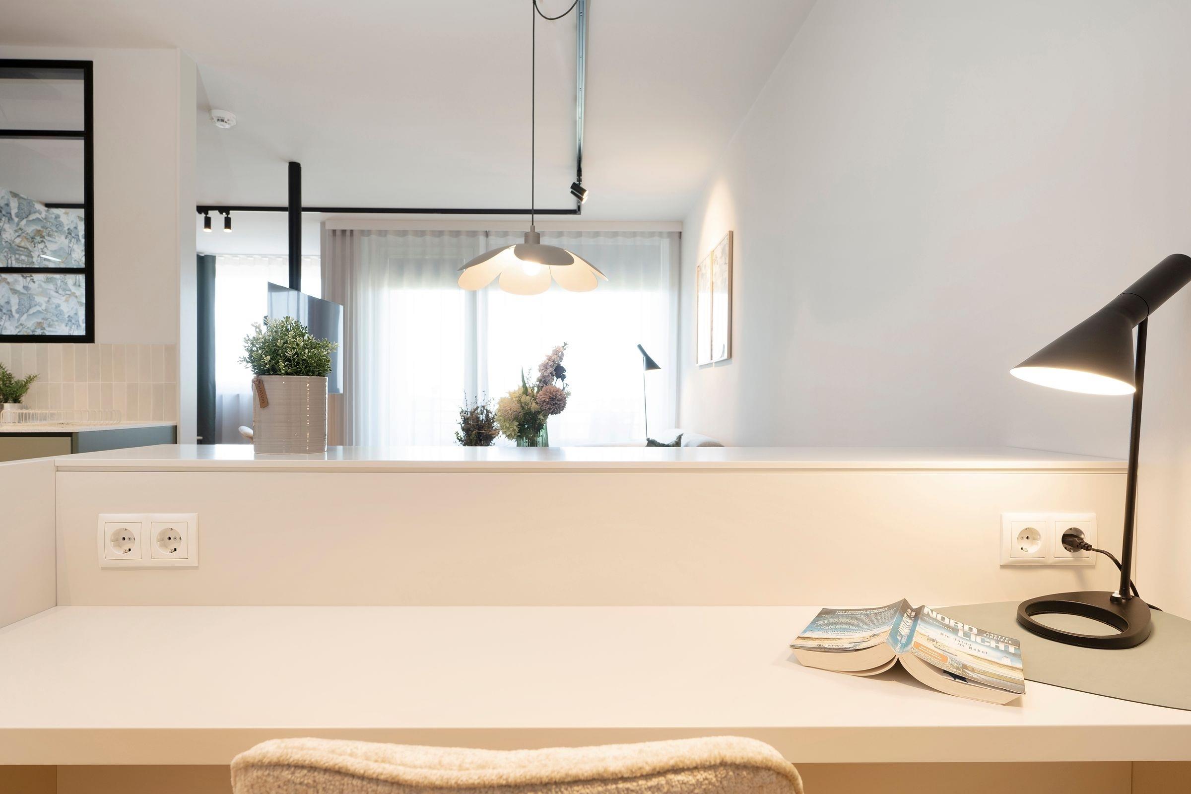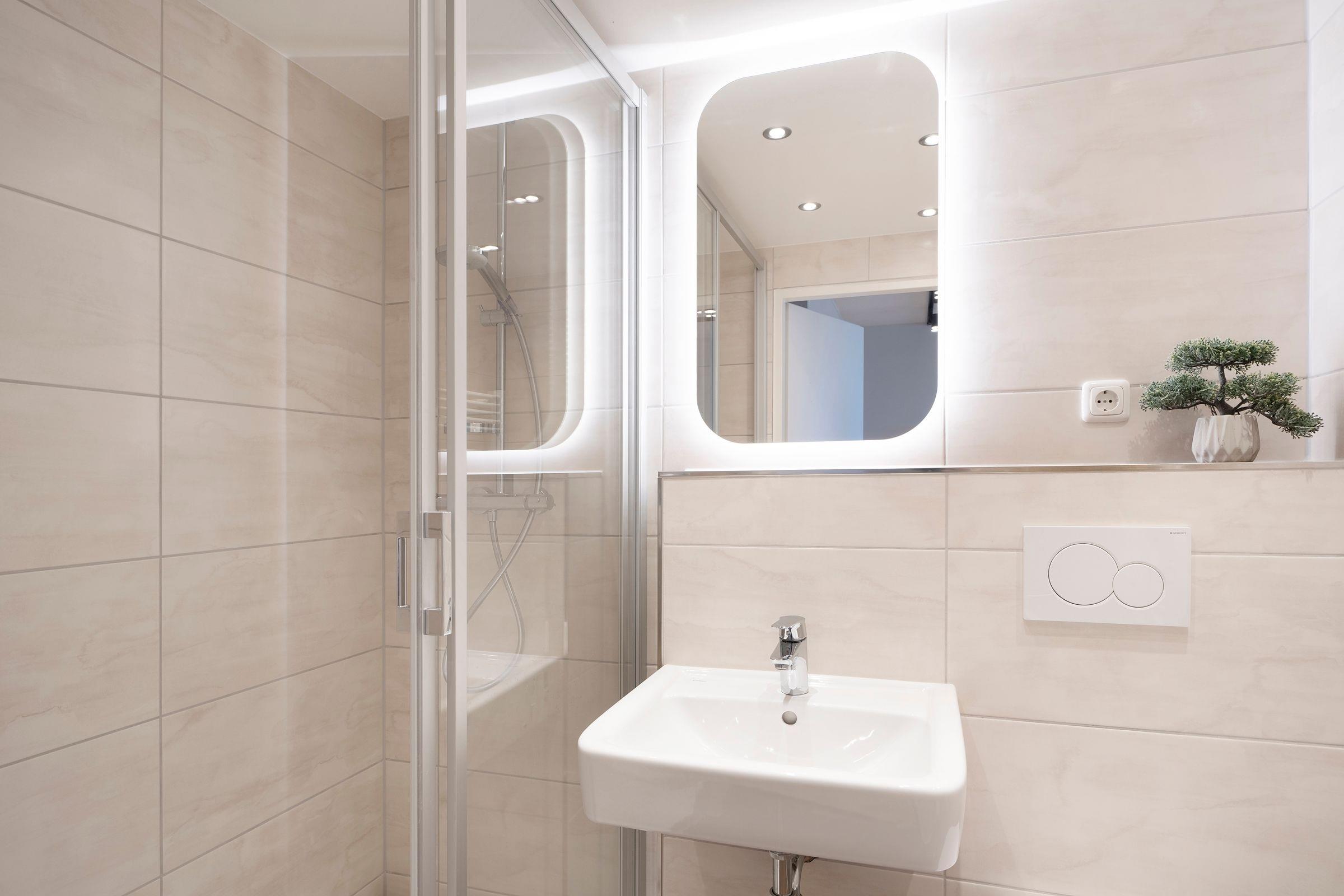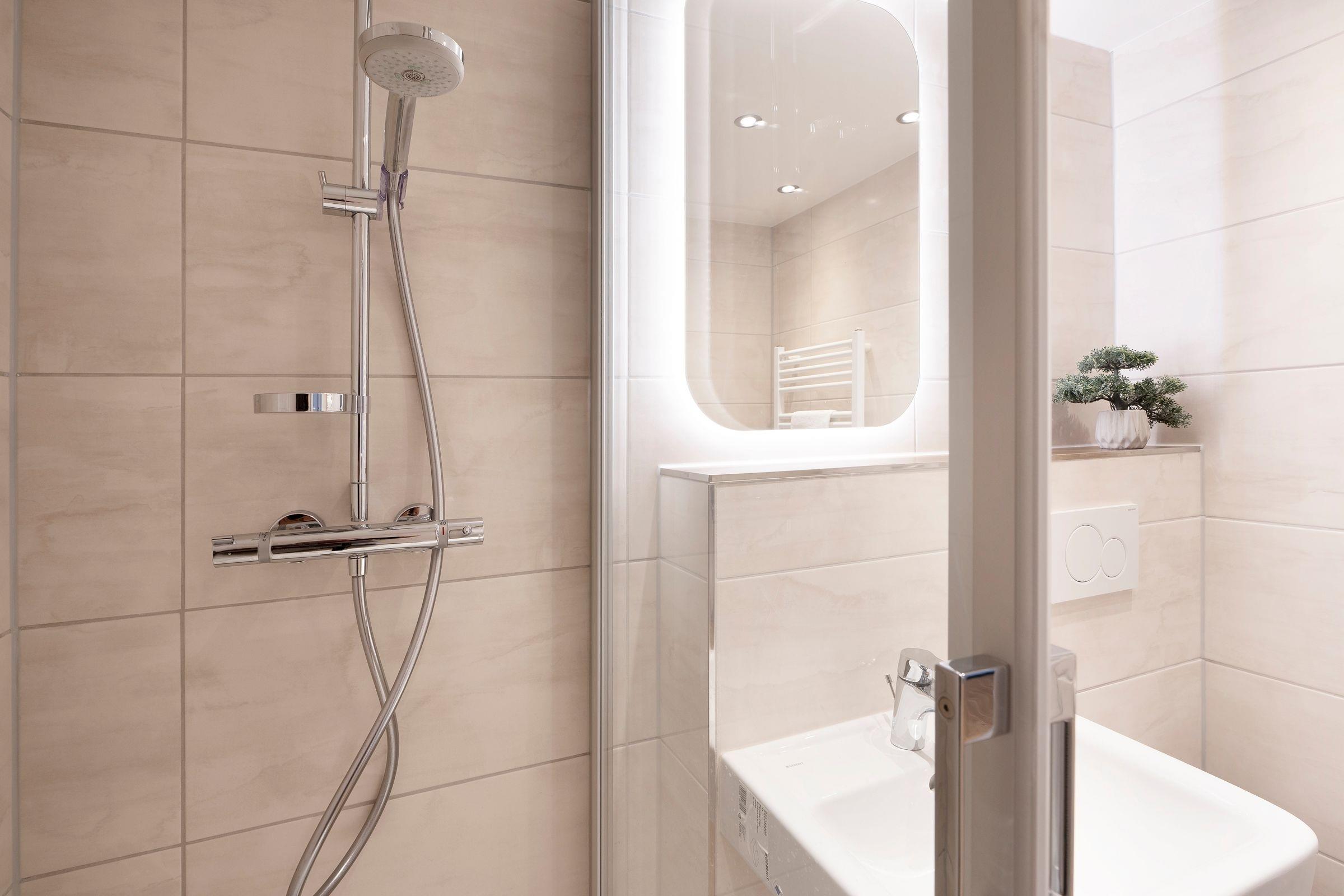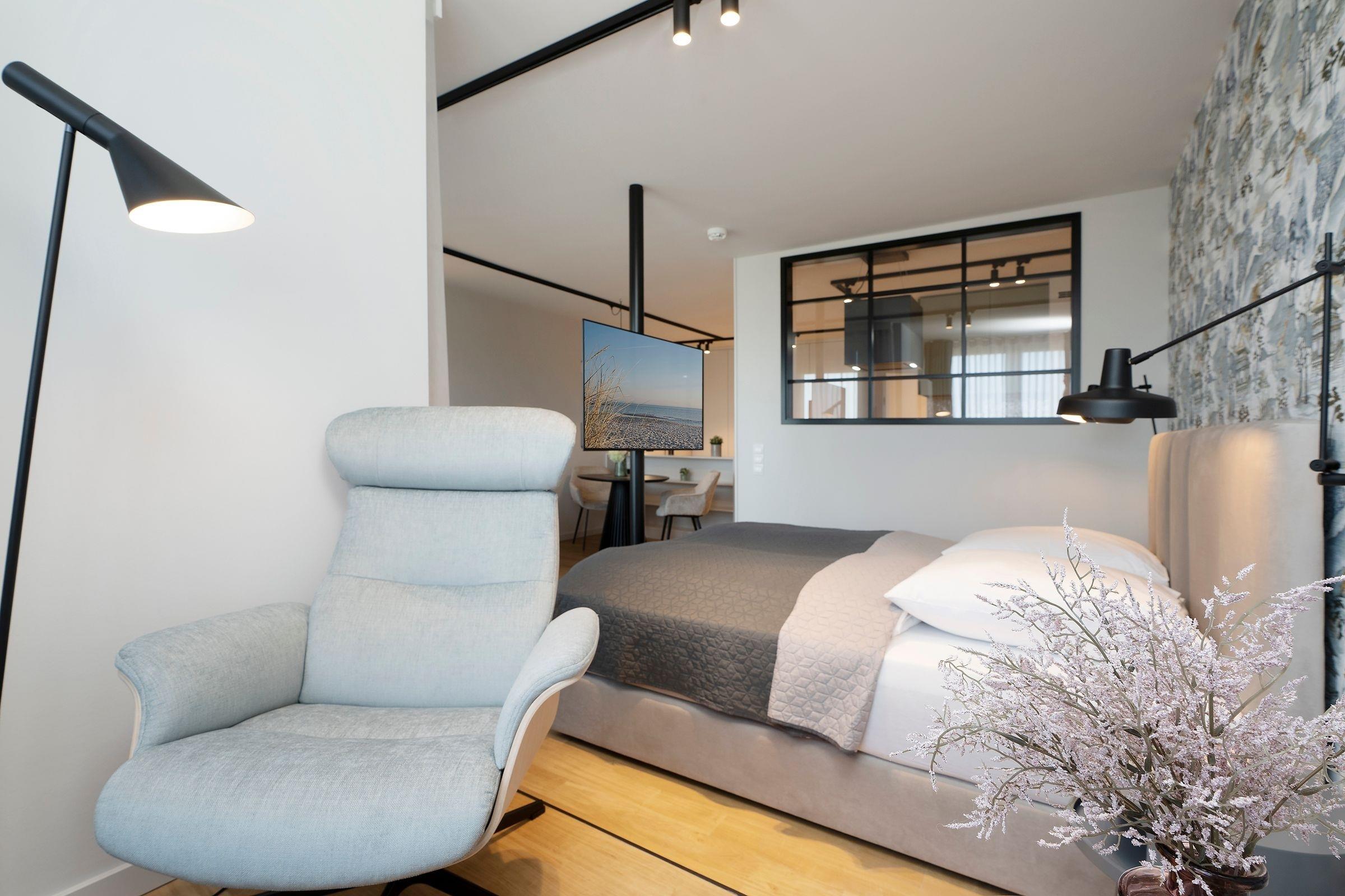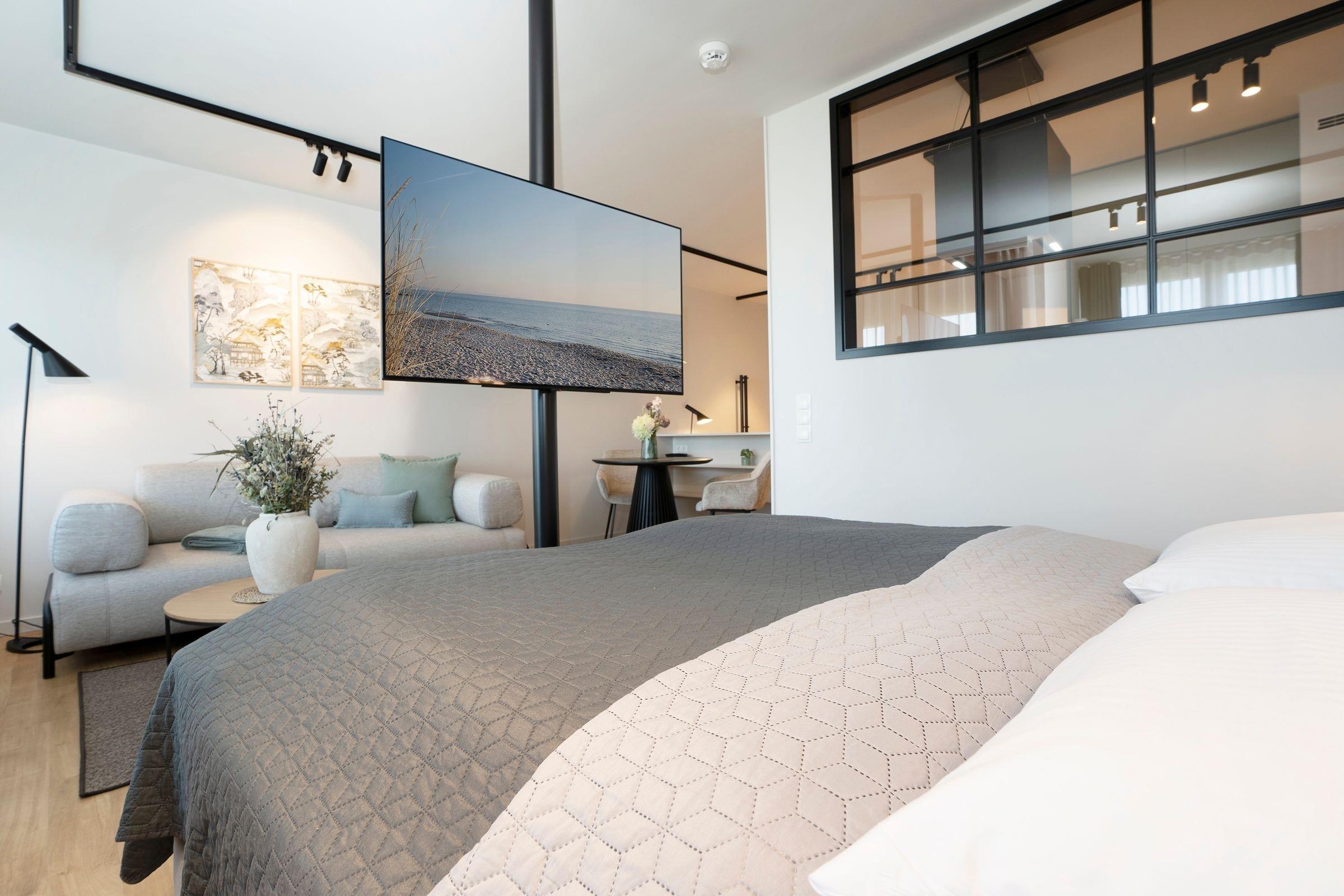 Mit einem modernen und geschickten All-in-One-Raumkonzept begrüßt Sie Ihr Feriendomizil für die bevorstehenden Urlaubstage. Es erwartet Sie ein heller Wohn- & Essbereich, in dem man sich sofort wie zu Hause fühlt. Machen Sie es sich auf der Couch oder im Doppelbett (2x 90x200 cm) des optisch abgetrennten Schlafbereichs vor dem drehbaren Fernseher gemütlich. Die integrierte, offene Küche ist mit nahezu allen Annehmlichkeiten ausgestattet und lädt zum Kochen Ihrer Mahlzeiten ein. Das funktionalen Bad ist mit einer geräumiger Dusche ausgestattet.