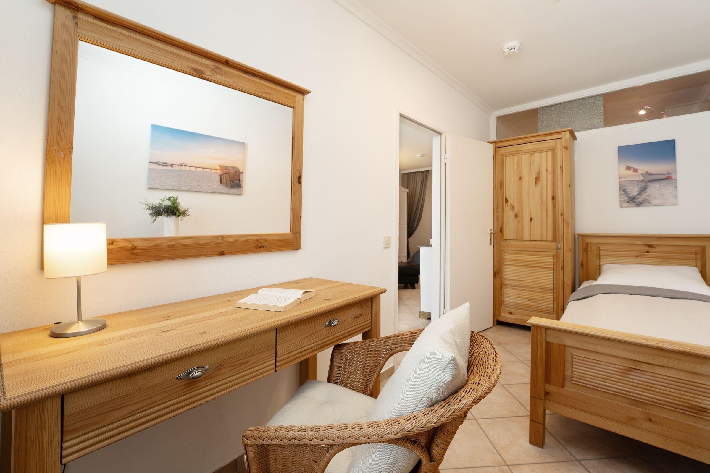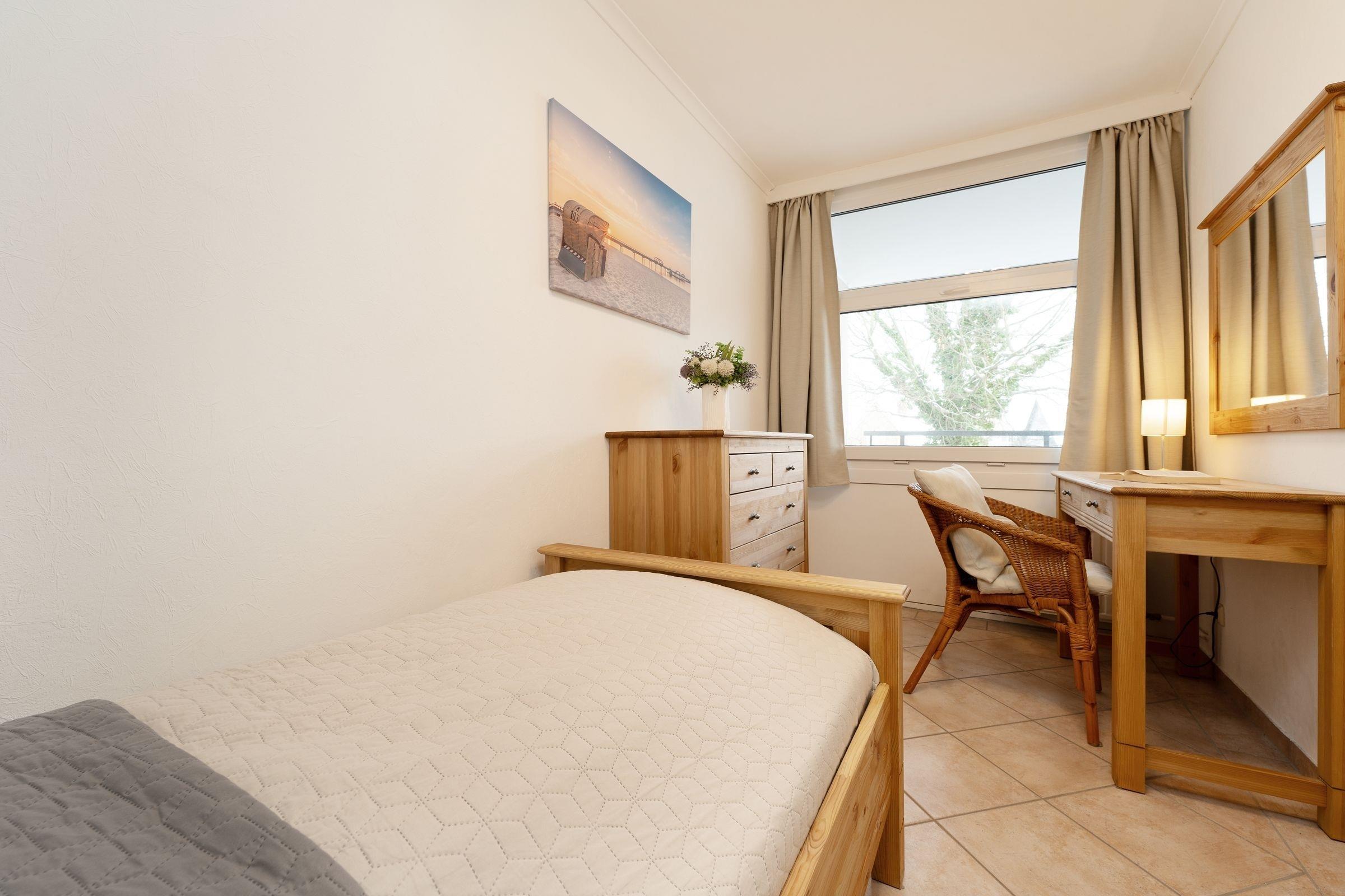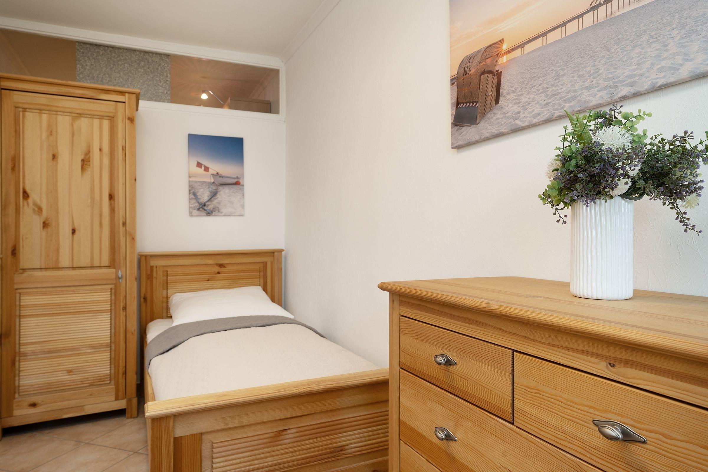 Schlafzimmer: 1 Einzelbett (90x200 cm), Kleiderschrank, Verdunkelung: Vorhänge, kein Platz für ein Babybett