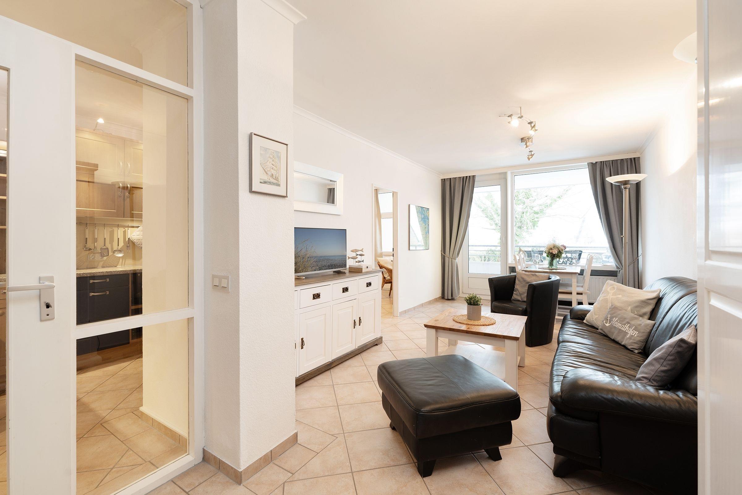 In bester Lage von Kellenhusen: strandnahe 2-Zimmer-Ferienwohnung im 1. Stock den Strandappartements am Leuchtturmweg mit Balkon, Aufzug und einer Wohnfläche von ca. 50 m² für bis zu 3 Personen.