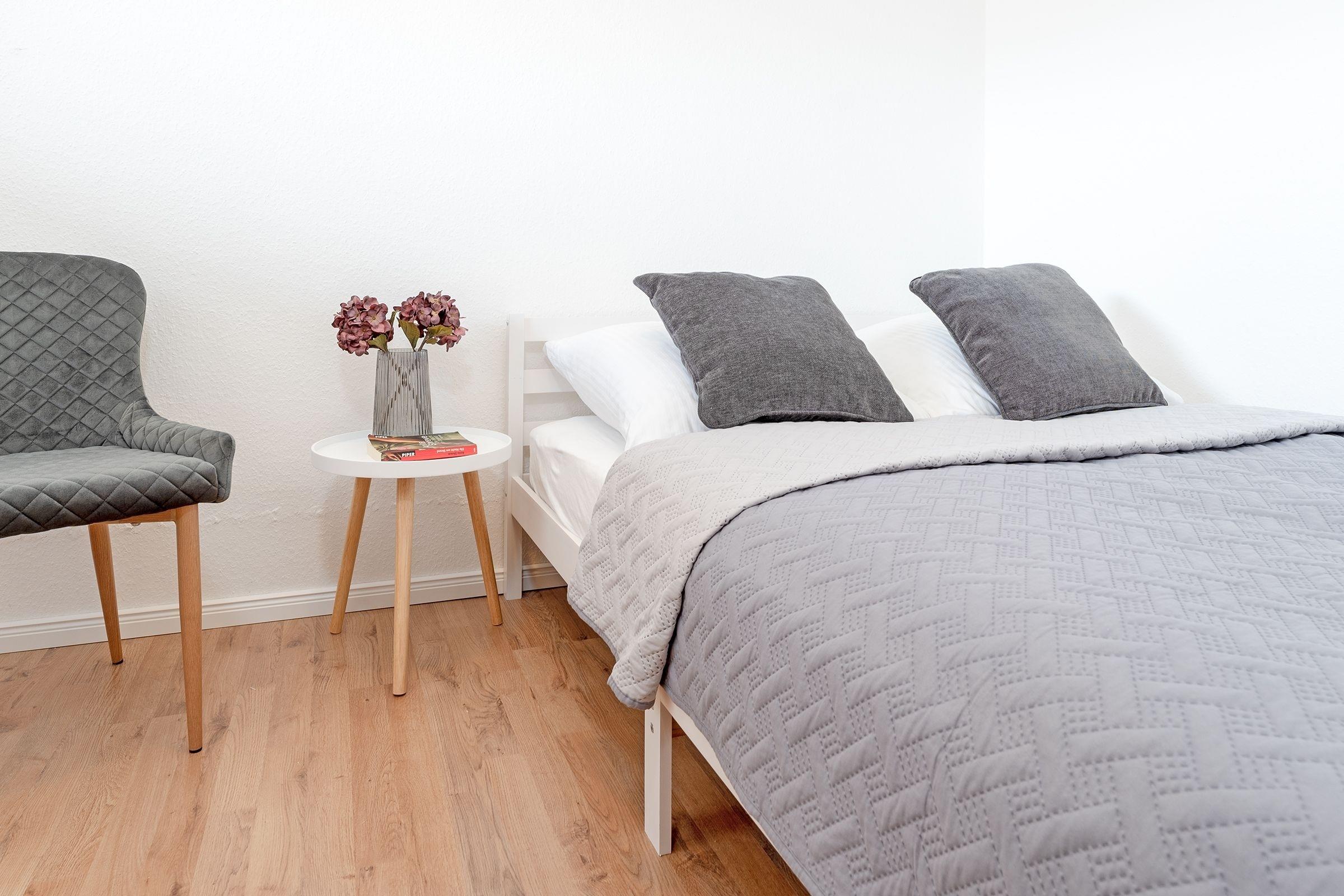 Schlafzimmer: 1 Doppelbett (140 x 190cm), Kleiderschrank, Verdunkelung: Rollo, kein Platz für ein Babybett vorhanden