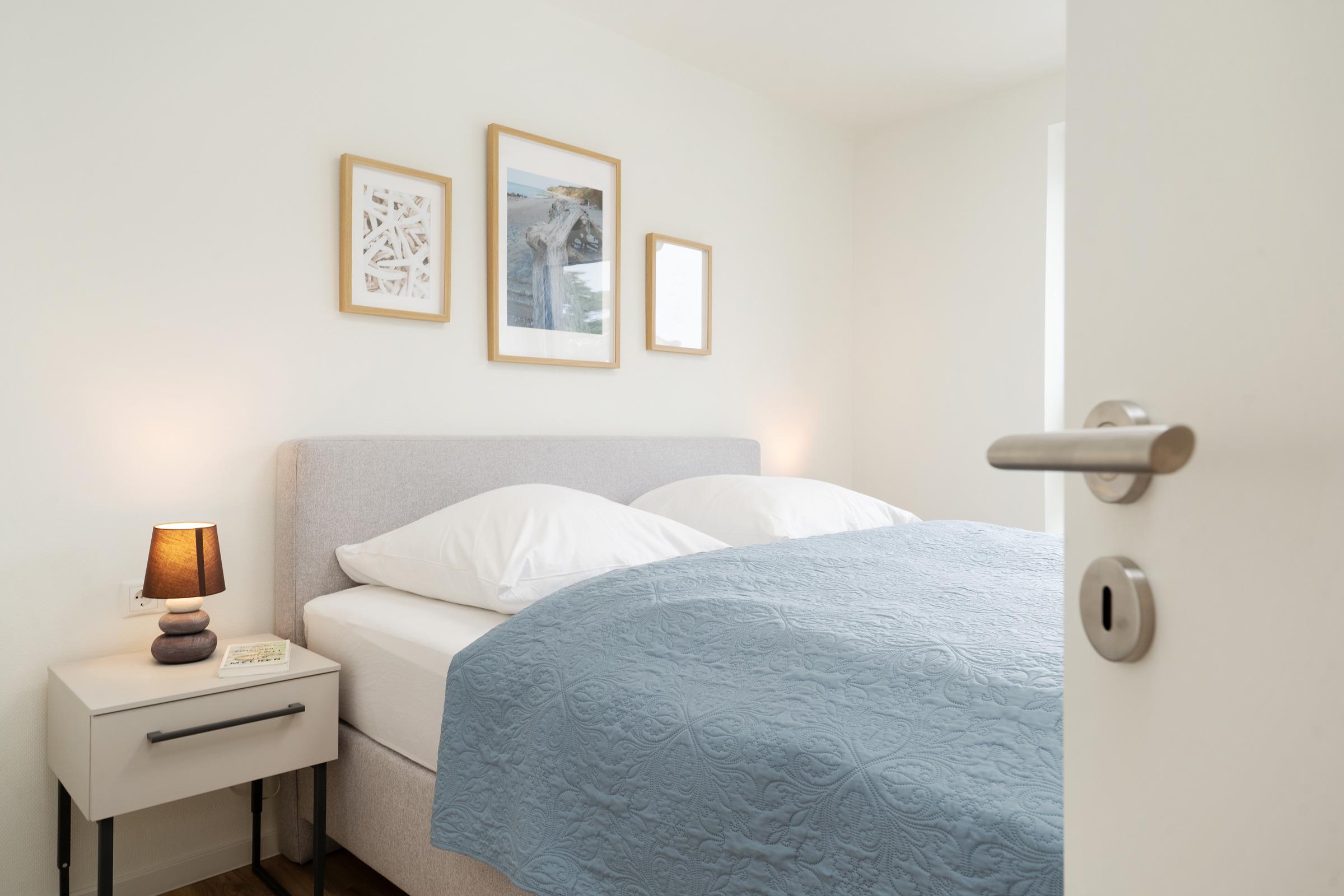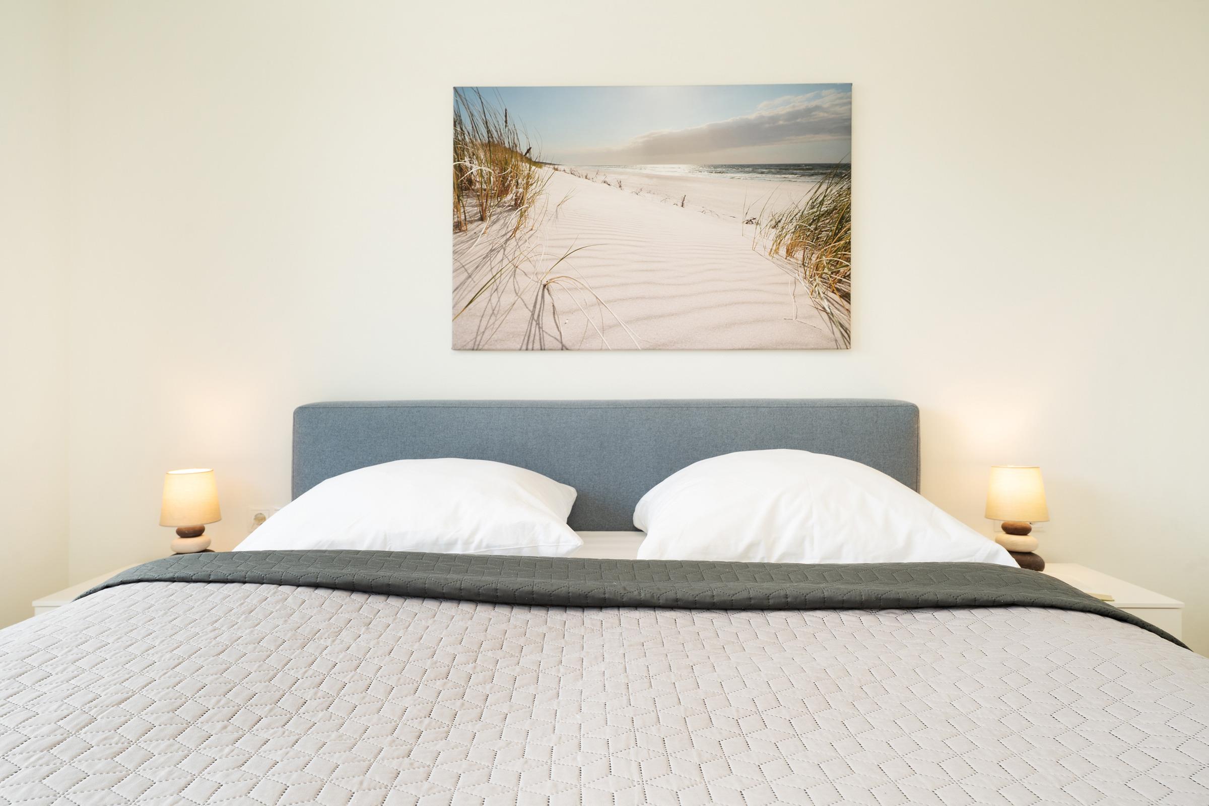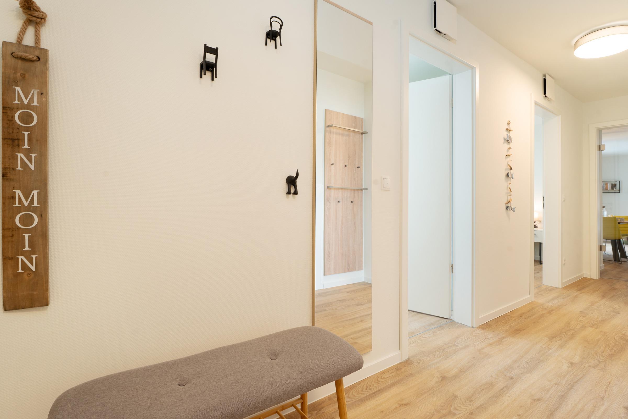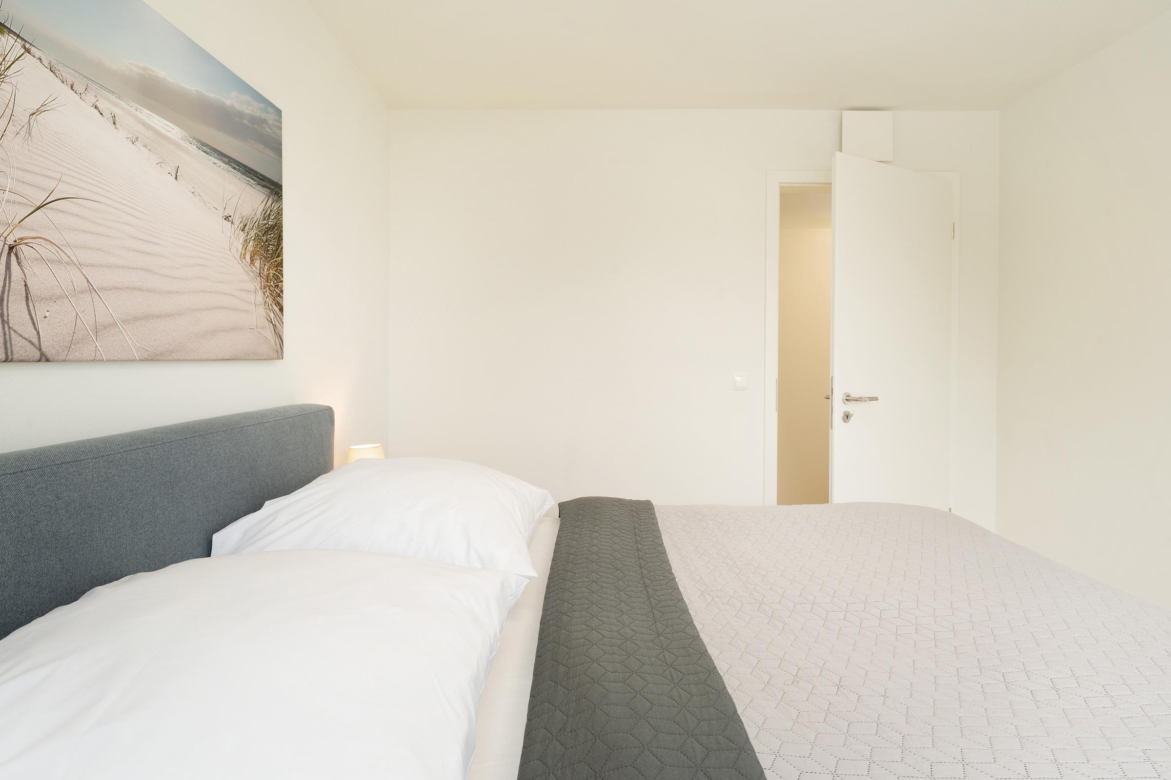 Zwei separate Schlafzimmer - jeweils mit einem Doppelboxspringbett ausgestattet - sorgen für erholsame Nächte. Die weiteren Gäste finden auf einem komfortablen Schlafsofa im Wohnzimmer Platz. Ein Kinderhochstuhl ist ebenfalls vorhanden. Das moderne Badezimmer verfügt über eine bodengleiche Dusche, Waschbecken, WC und Fußbodenheizung. Ein Haartrockner sowie eine Waschmaschine und ein Trockner stehen ebenfalls zur Verfügung.