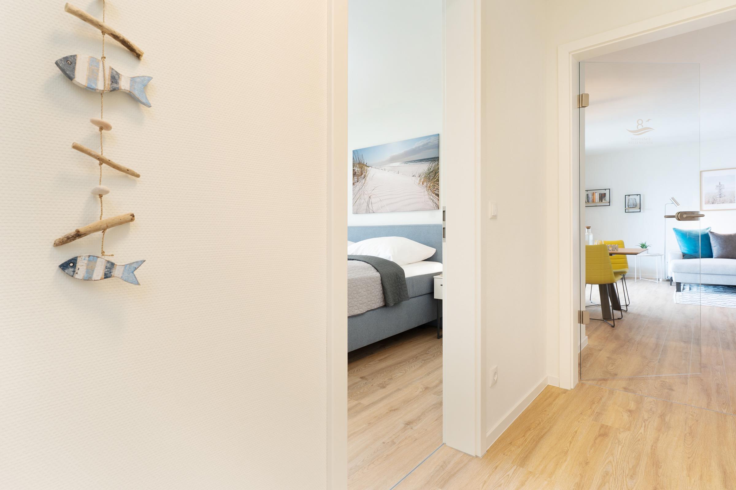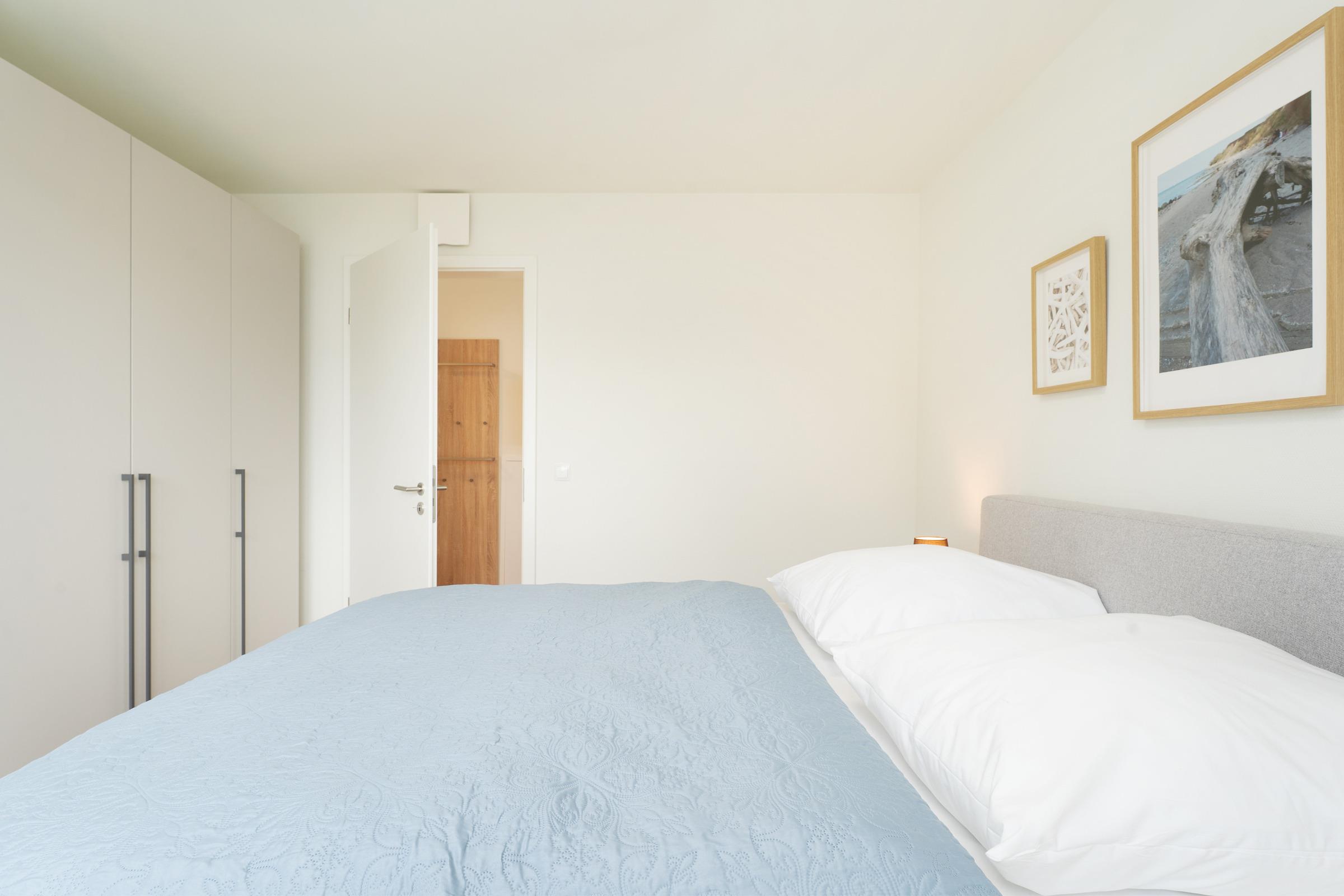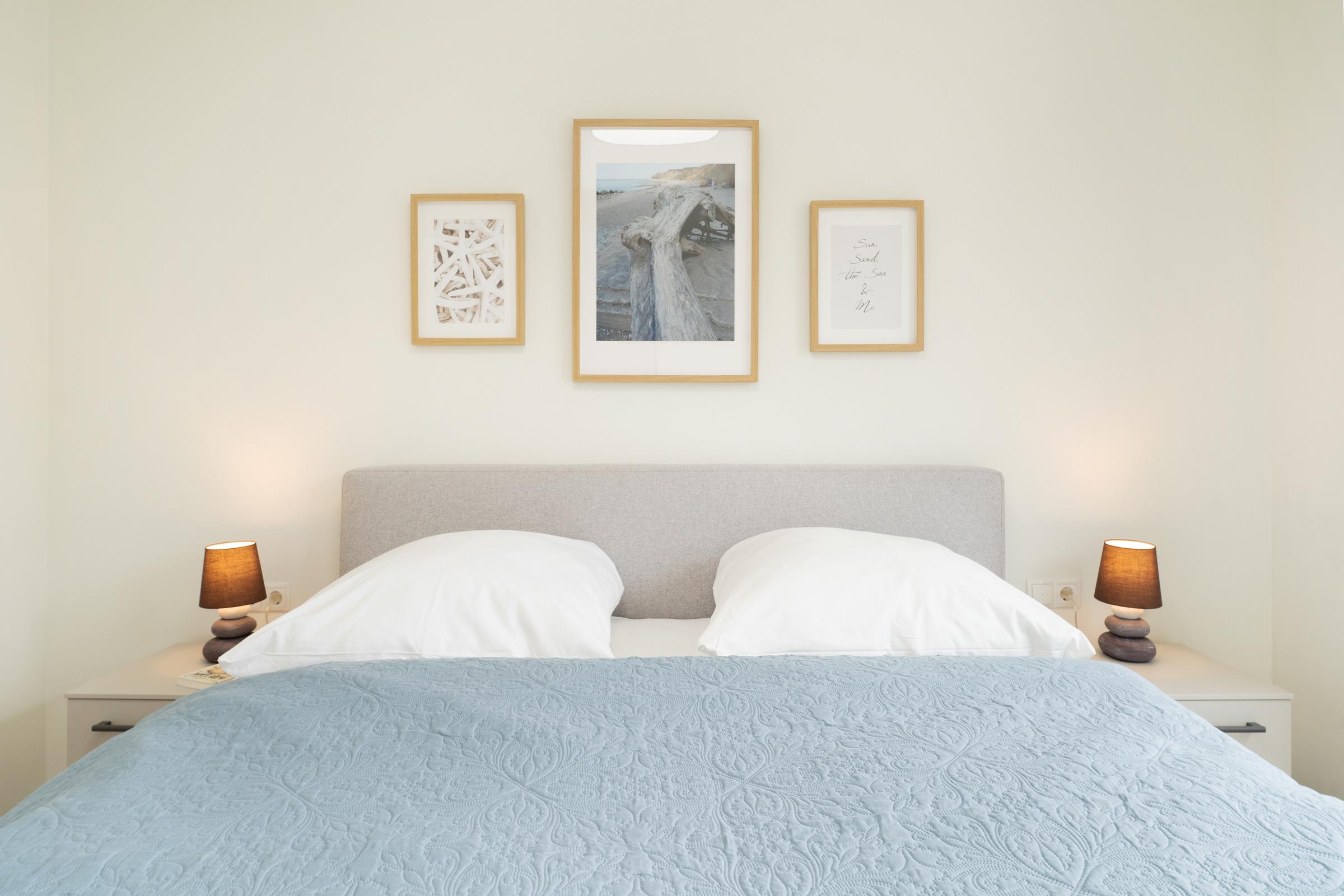 Zwei separate Schlafzimmer - jeweils mit einem Doppelboxspringbett ausgestattet - sorgen für erholsame Nächte. Die weiteren Gäste finden auf einem komfortablen Schlafsofa im Wohnzimmer Platz. Ein Kinderhochstuhl ist ebenfalls vorhanden. Das moderne Badezimmer verfügt über eine bodengleiche Dusche, Waschbecken, WC und Fußbodenheizung. Ein Haartrockner sowie eine Waschmaschine und ein Trockner stehen ebenfalls zur Verfügung.