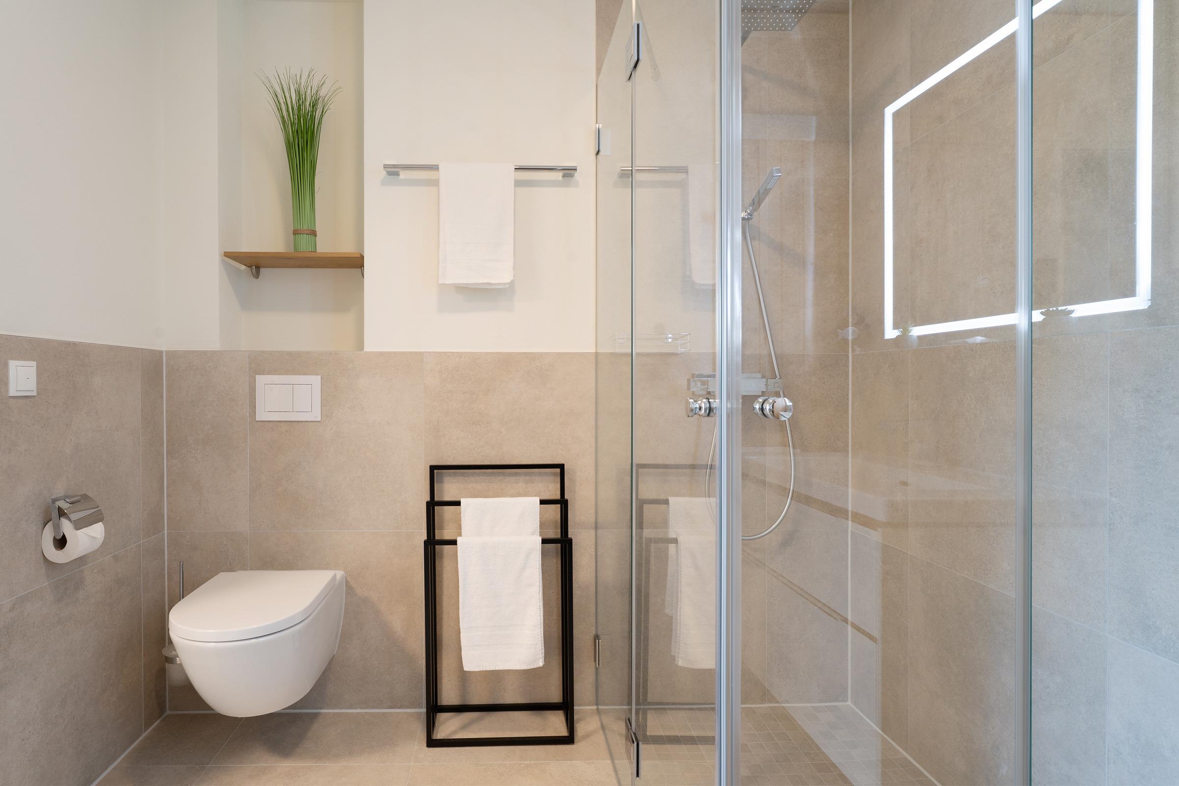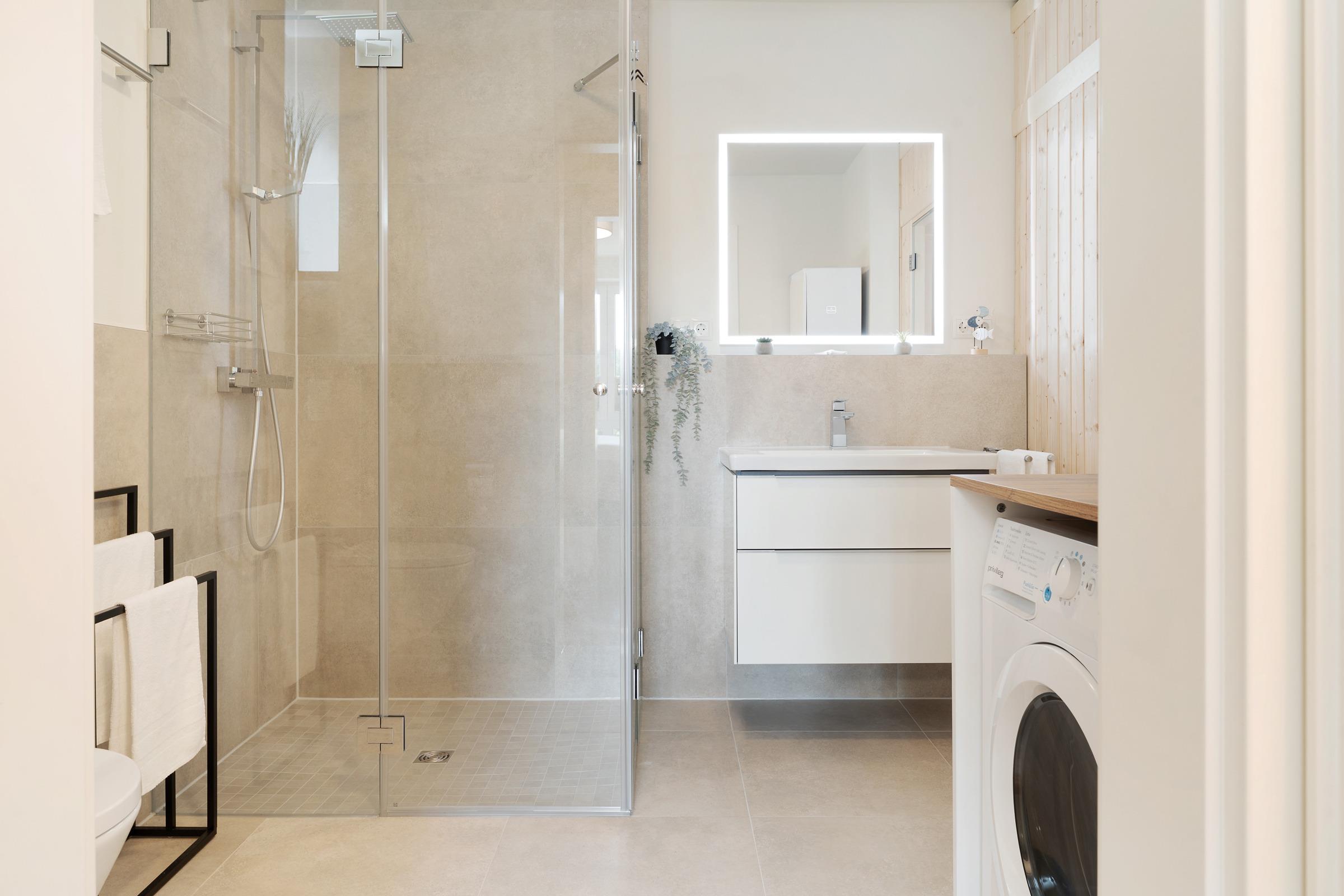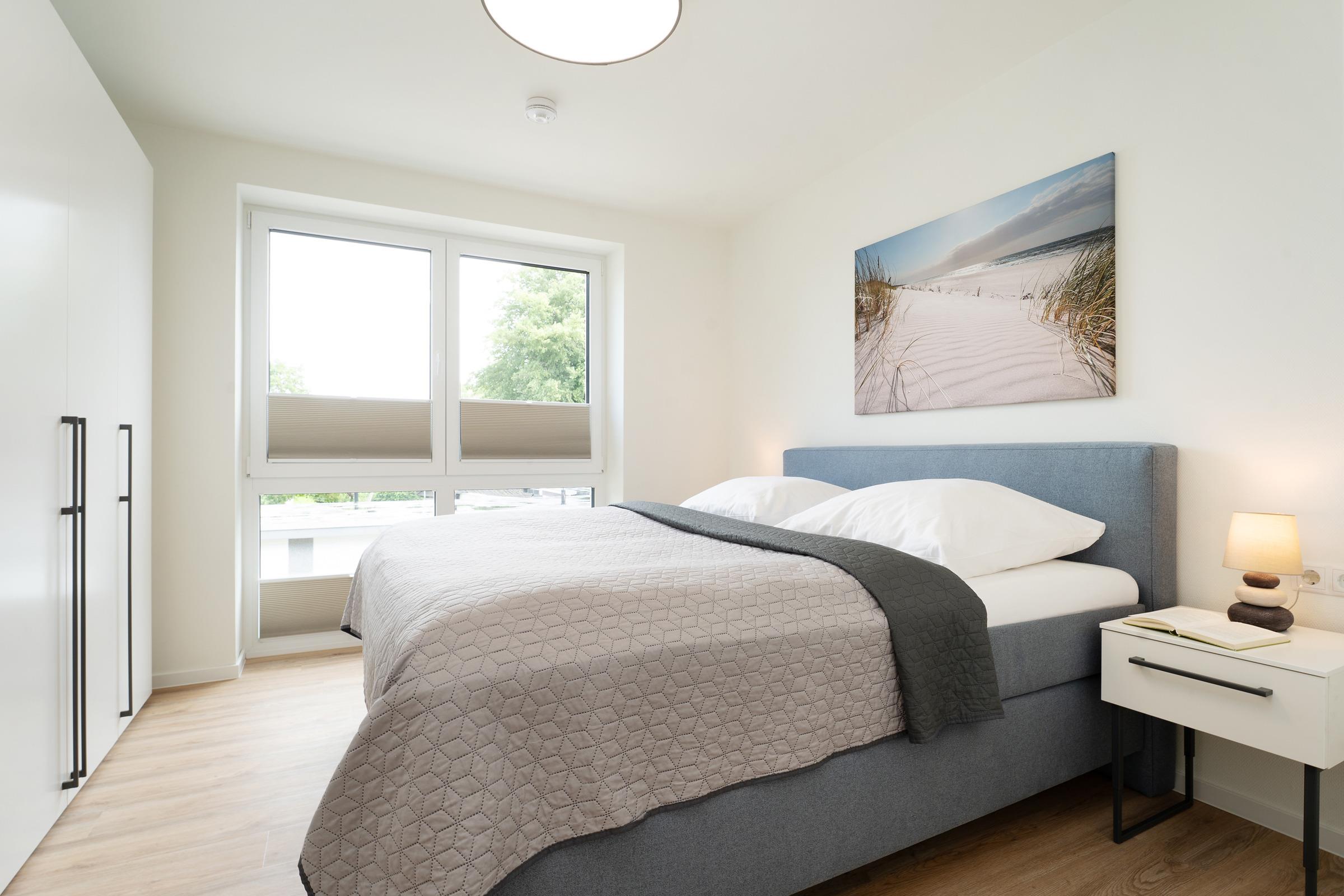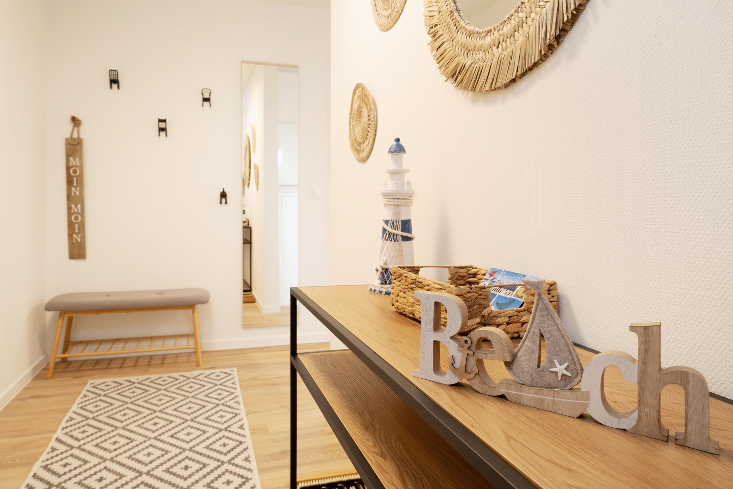 Zwei separate Schlafzimmer - jeweils mit einem Doppelboxspringbett ausgestattet - sorgen für erholsame Nächte. Die weiteren Gäste finden auf einem komfortablen Schlafsofa im Wohnzimmer Platz. Ein Kinderhochstuhl ist ebenfalls vorhanden. Das moderne Badezimmer verfügt über eine bodengleiche Dusche, Waschbecken, WC und Fußbodenheizung. Ein Haartrockner sowie eine Waschmaschine und ein Trockner stehen ebenfalls zur Verfügung.