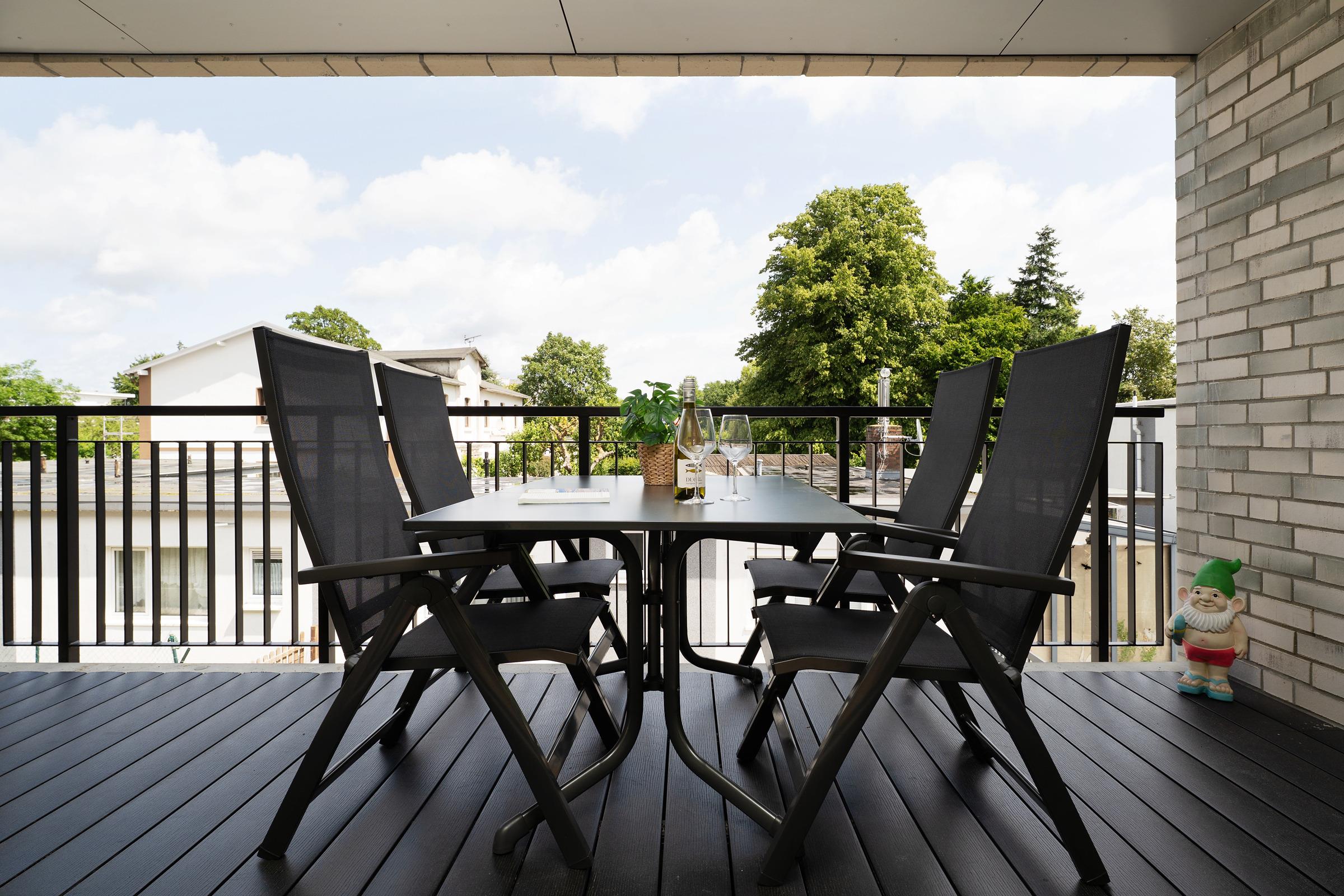 Der lichtdurchflutete Wohnbereich ist mit einer gemütlichen Sofaecke, TV, Hifi-Anlage und großer Fensterfront ausgestattet. Von hier aus betreten Sie den überdachten Balkon mit Gartenmöbeln – ideal für sonnige Stunden oder entspannte Abende.