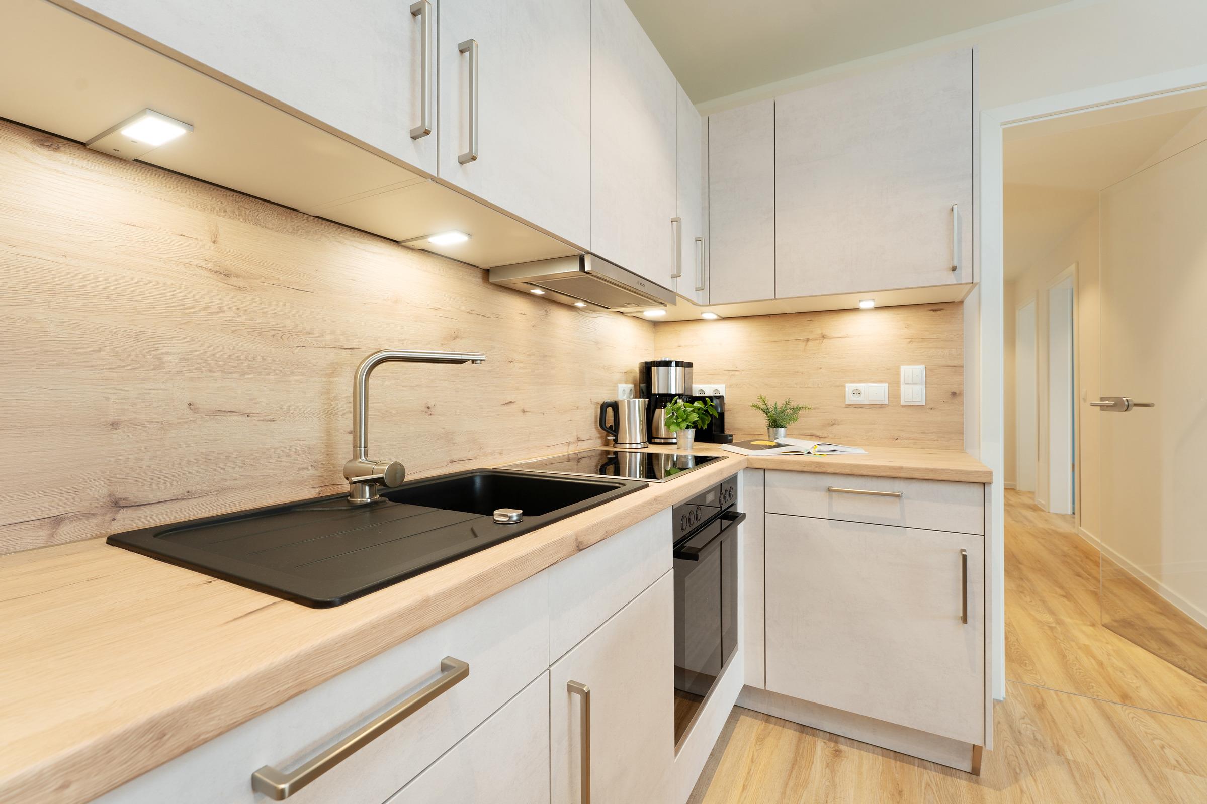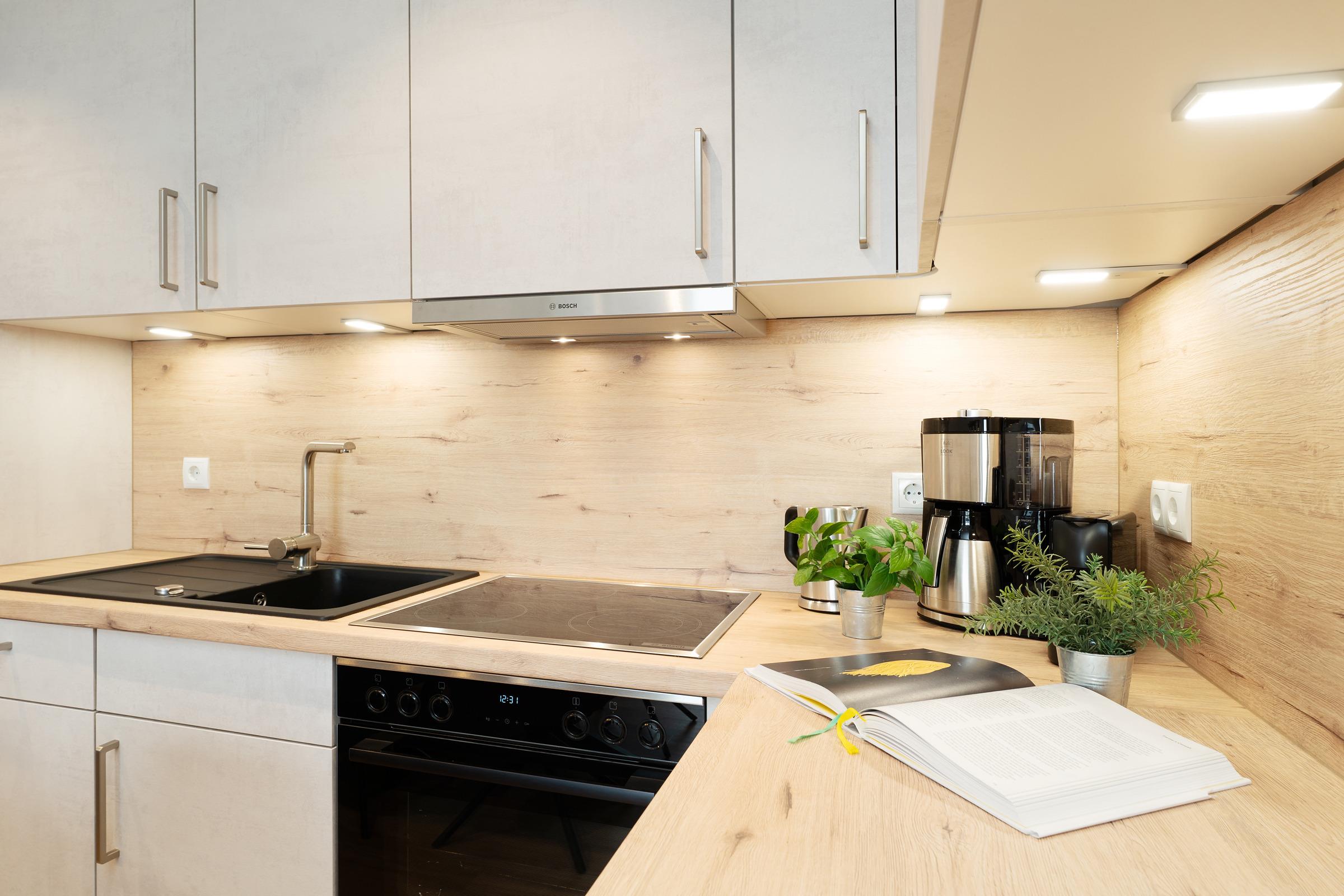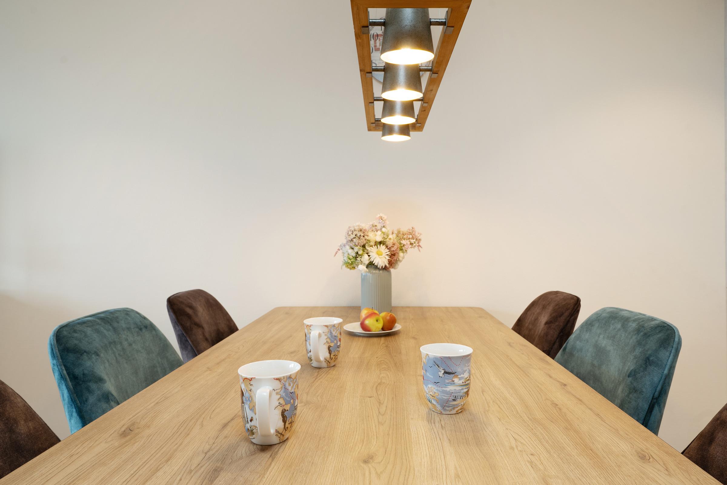 Die offene Küche ist voll ausgestattet mit Induktionskochfeld, Backofen, Kühlschrank mit Gefrierfach, Spülmaschine, Kaffeemaschine, Wasserkocher, Toaster und Nespressomaschine. Der angrenzende Essbereich bietet ausreichend Platz für alle Mitreisenden.