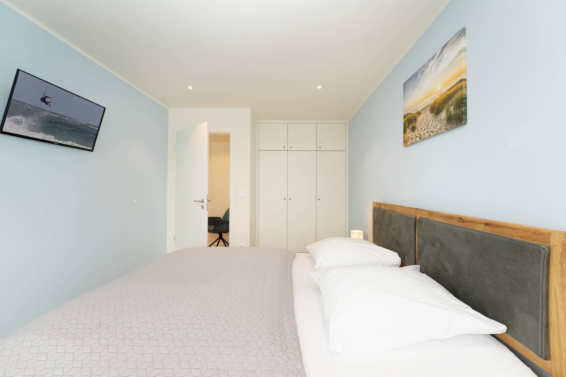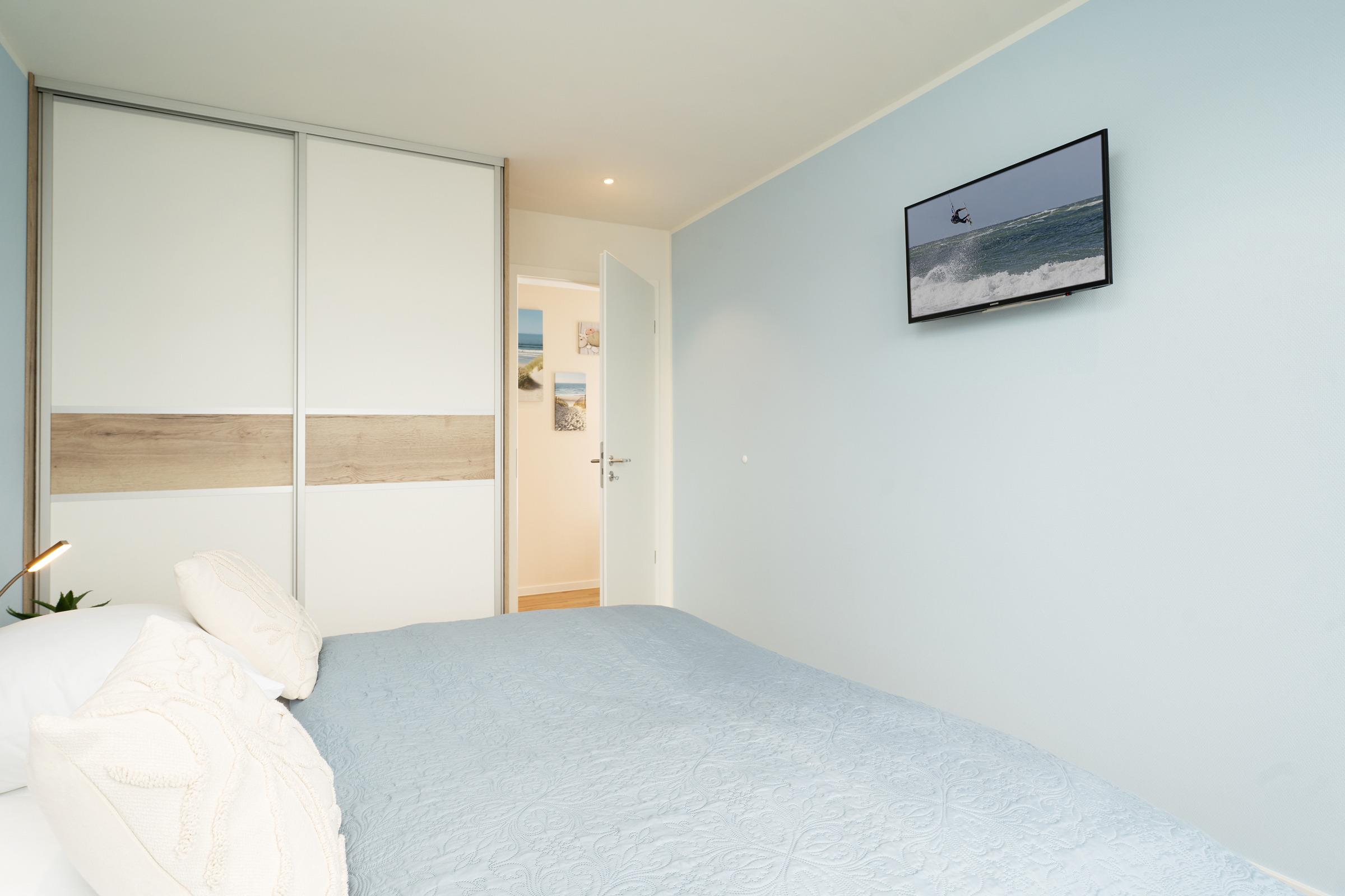 Schlafzimmer 2: 1 Doppelbett (2x 100x220 cm), Kleiderschrank, TV, Verdunkelung: Plissees, Platz für ein Babybett vorhanden