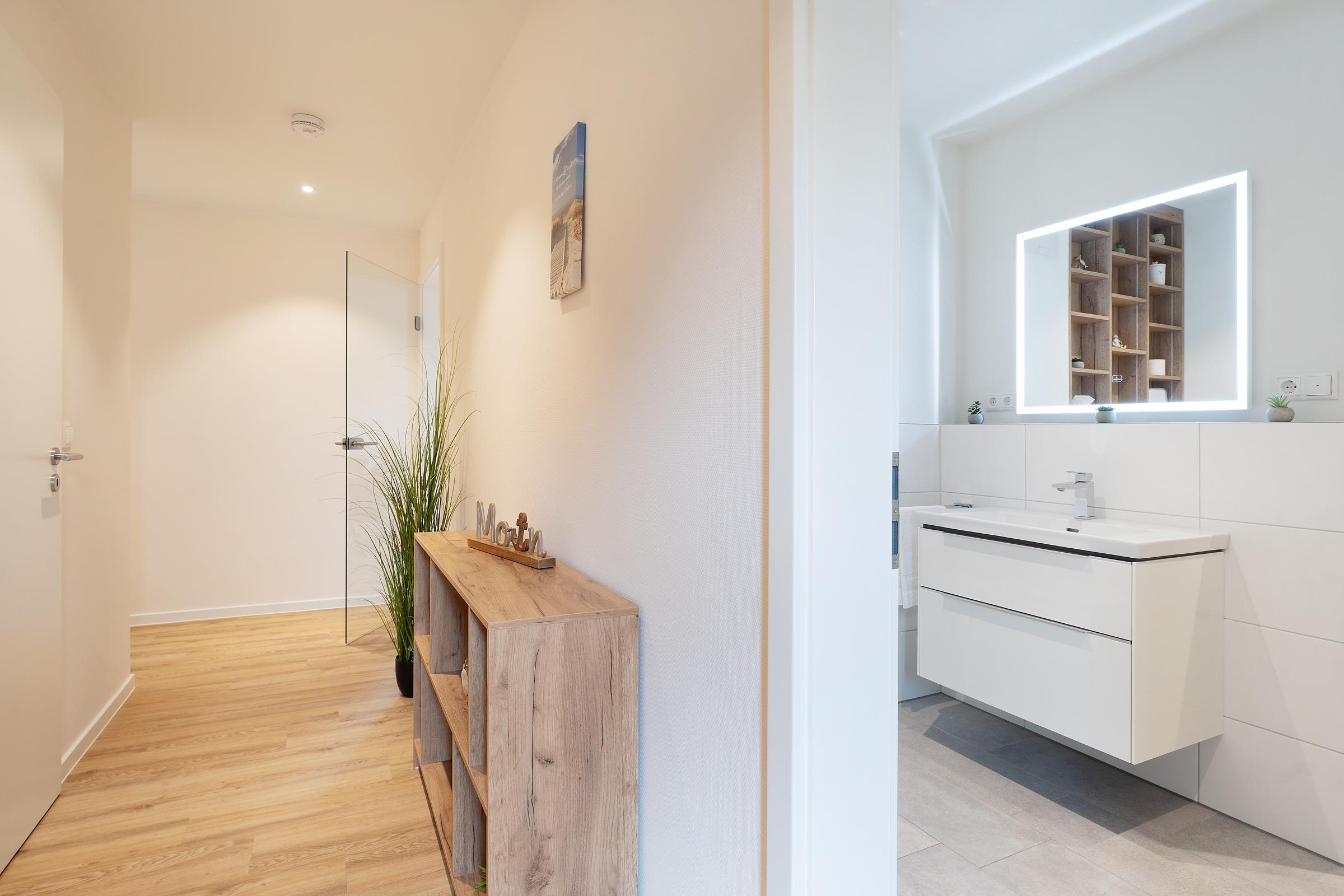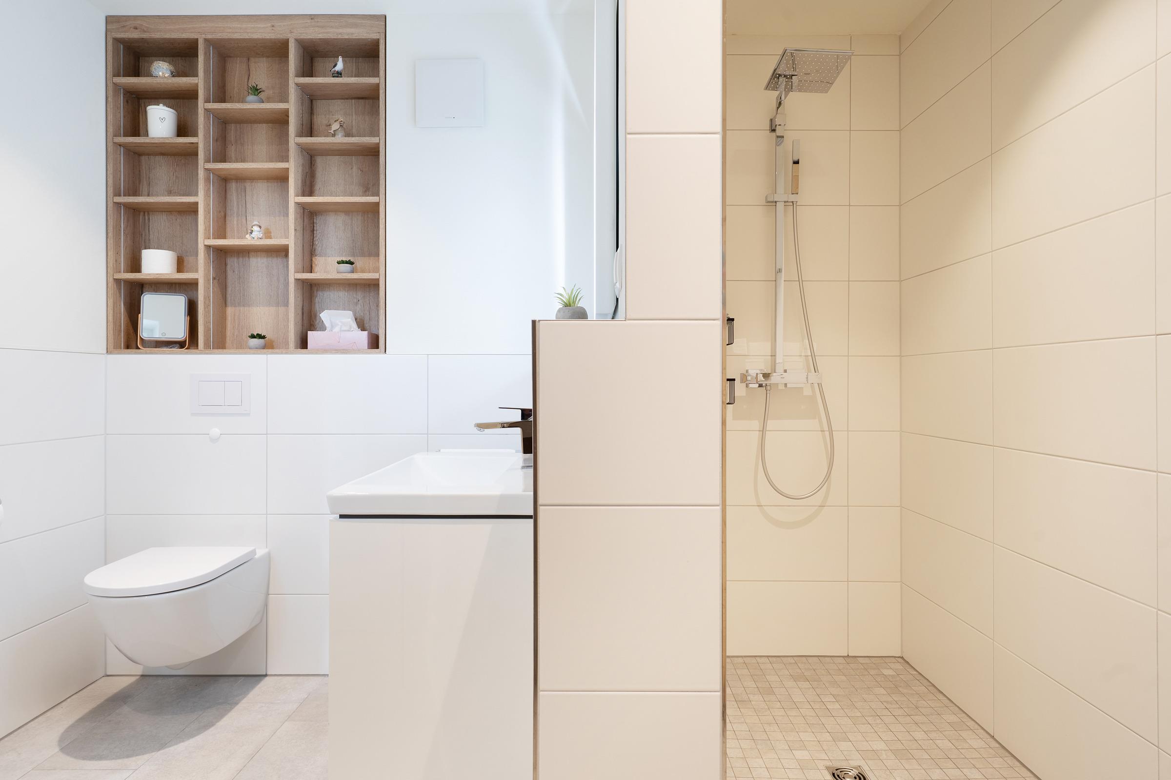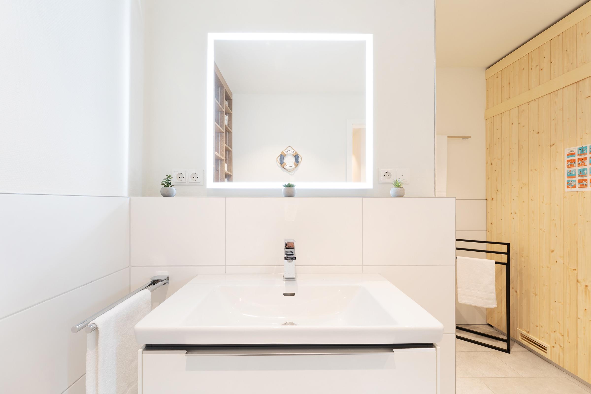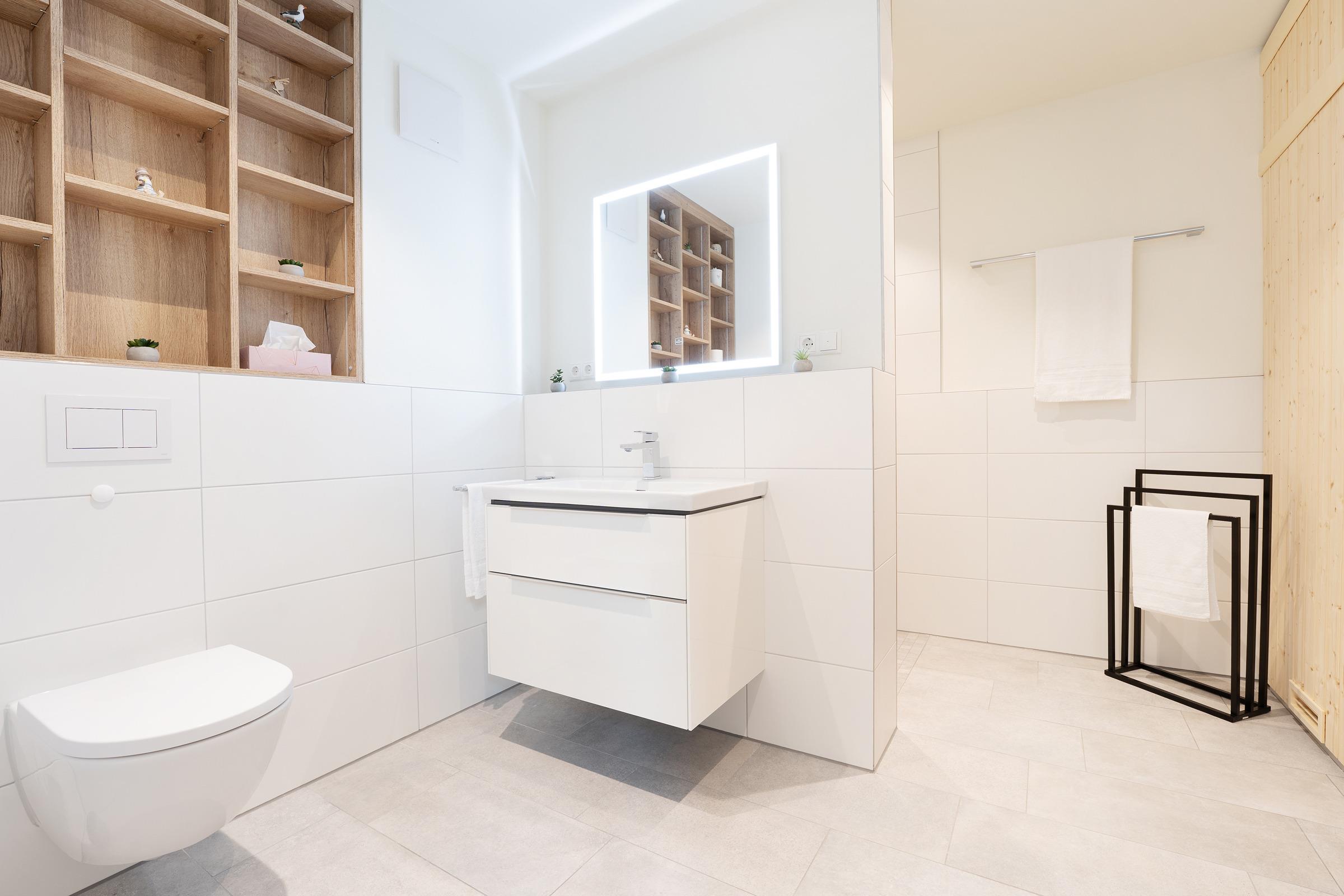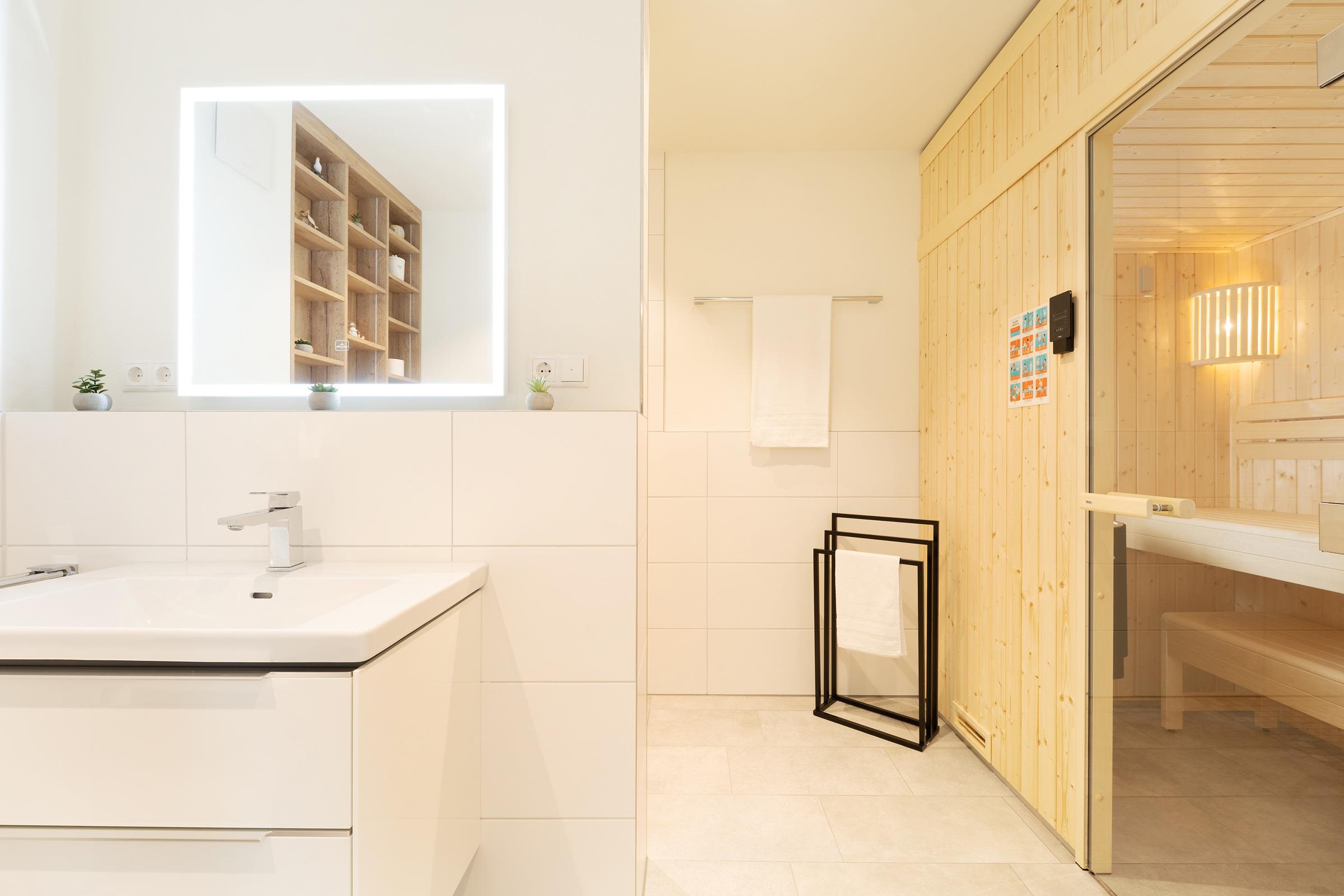 Das Bad überzeugt mit einer bodengleichen Dusche, WC, Waschbecken und Fußbodenheizung. Abgerundet wird der Komfort von einem Haartrockner und einem Kosmetikspiegel. Eine eigene Waschmaschine und ein Wäscheständer stehen ebenfalls zur Verfügung.
