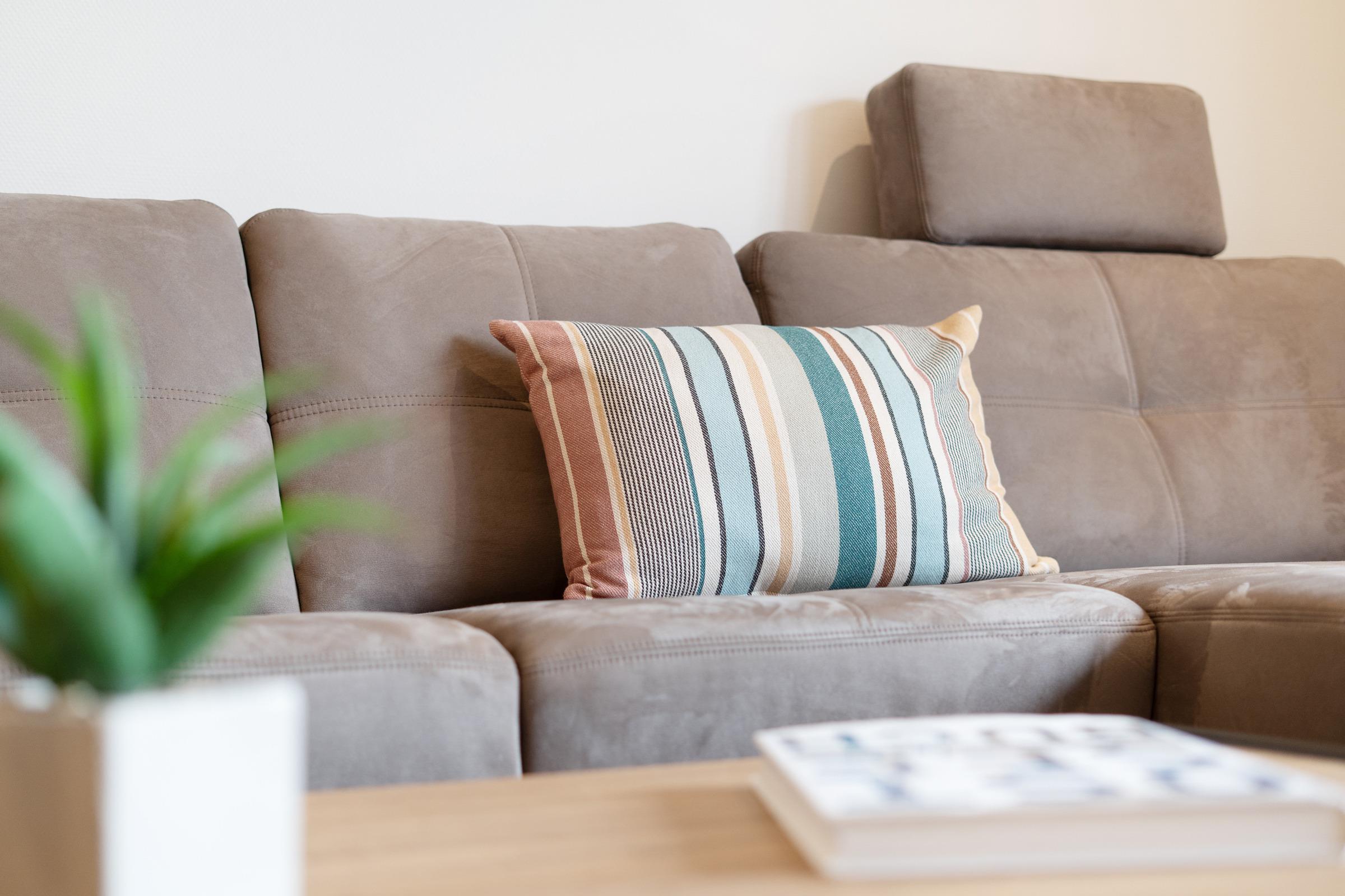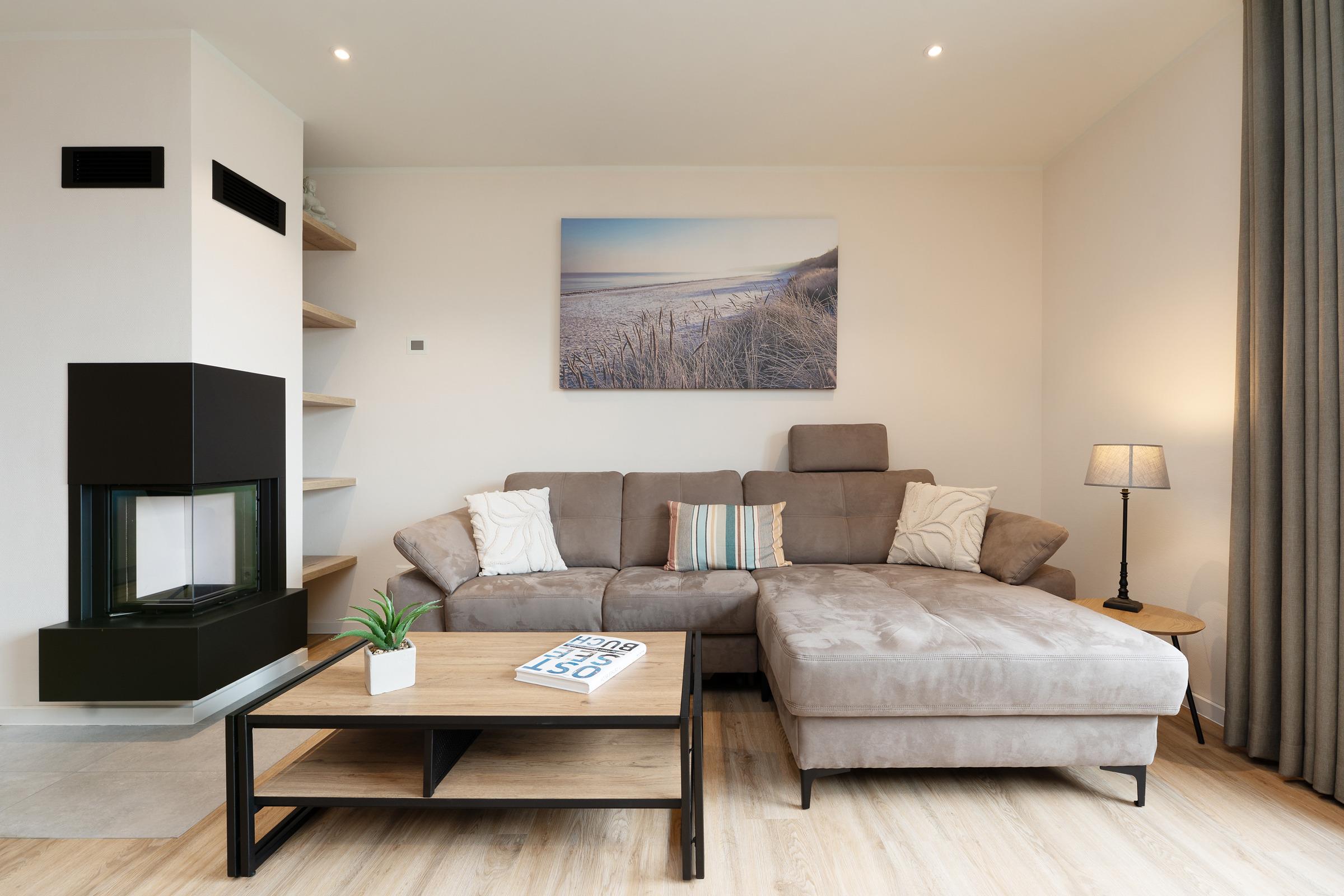 Der lichtdurchflutete Wohnbereich ist stilvoll eingerichtet und lädt mit gemütlicher Sofaecke, Kaminofen und Smart-TV zu entspannten Stunden ein. Vom Wohnzimmer aus gelangen Sie direkt auf die große, Dachterrasse mit Gartenmöbeln – ideal für Sonnenbäder und gesellige Abende. Von der Dachterrasse können Sie je nach Jahreszeit den Blick auf das Meer genießen.