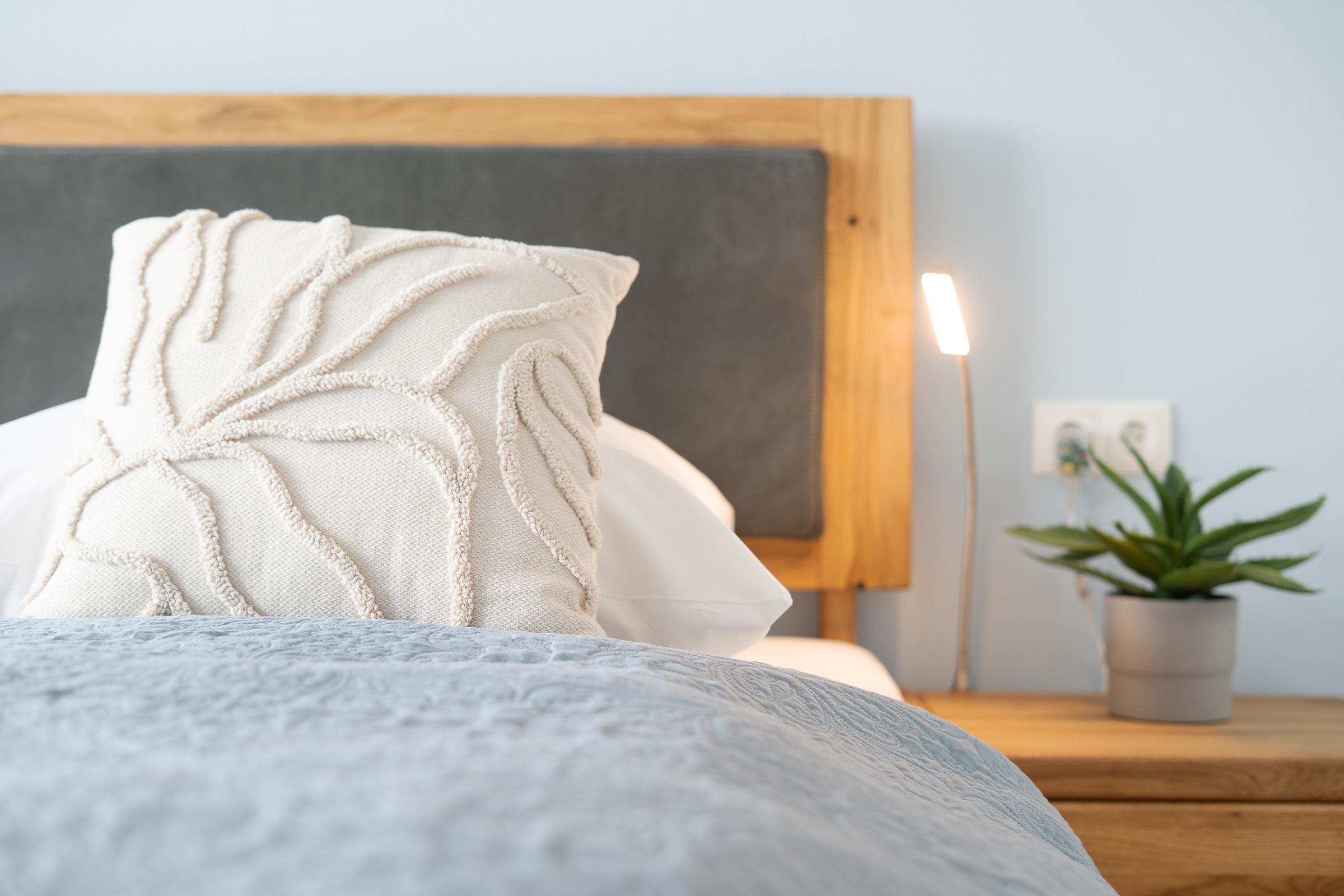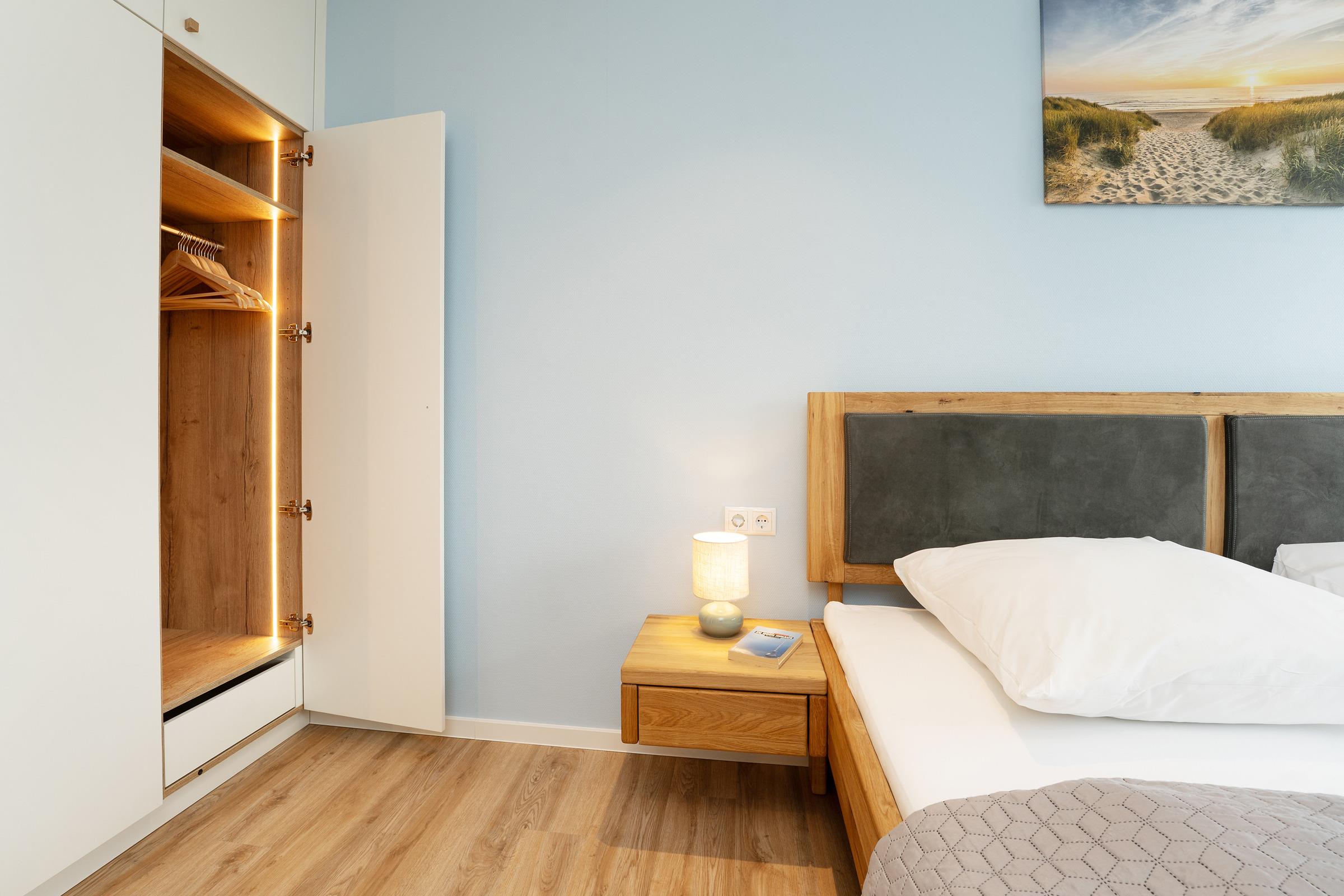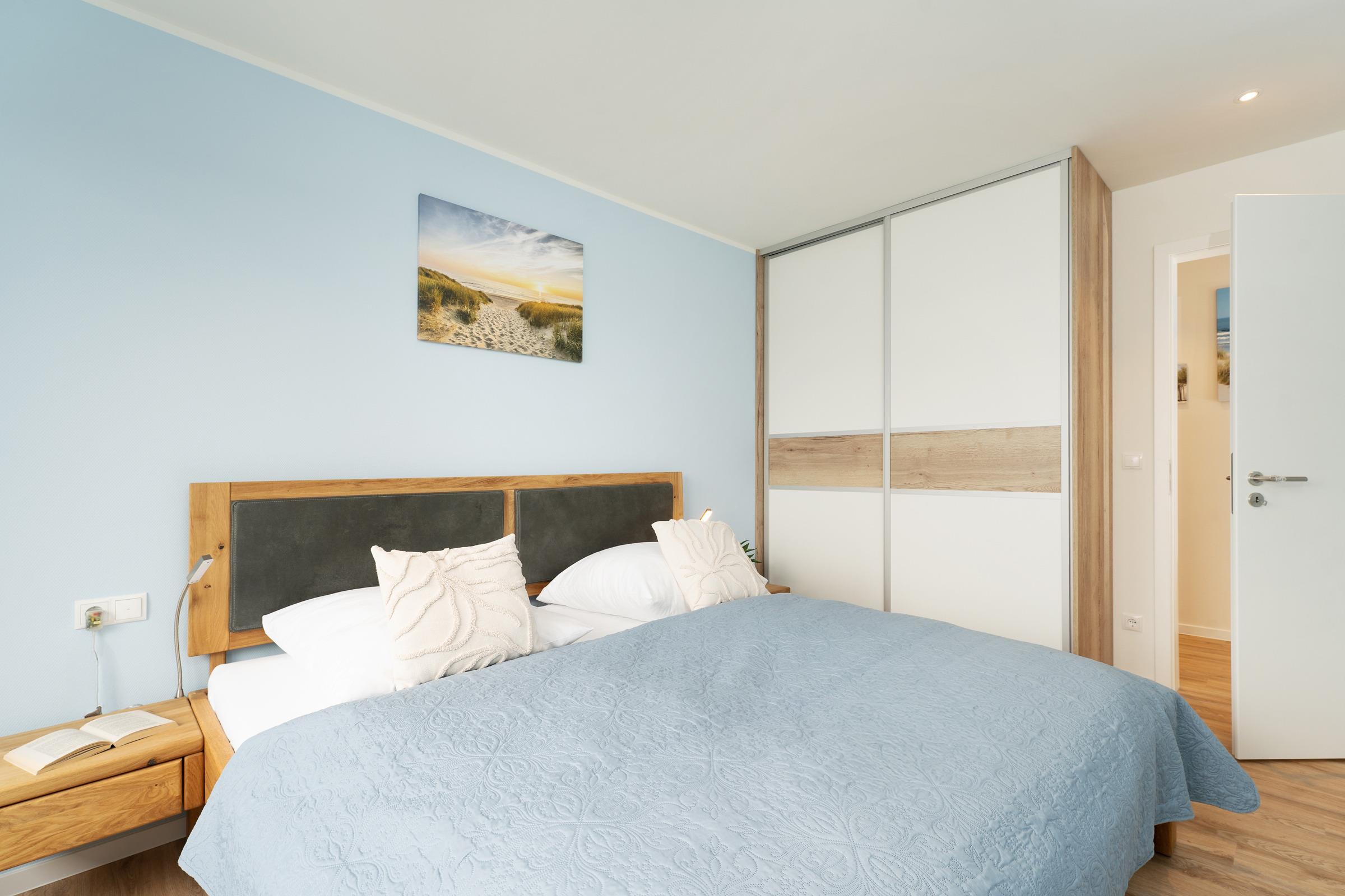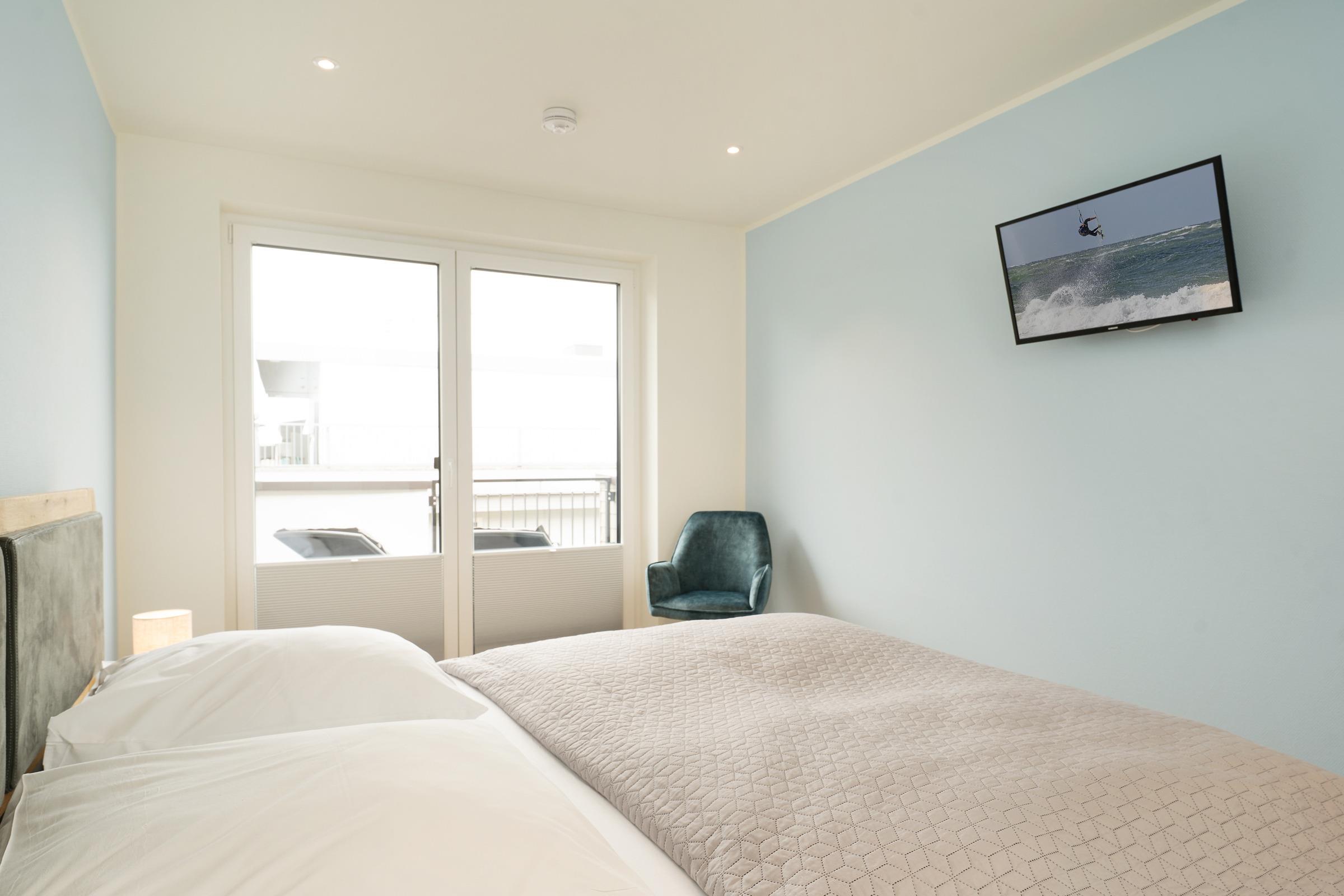 Schlafzimmer 1: 1 Doppelbett (2x 100x200 cm), Kleiderschrank, TV, Verdunkelung: Plissees, Platz für ein Babybett vorhanden
