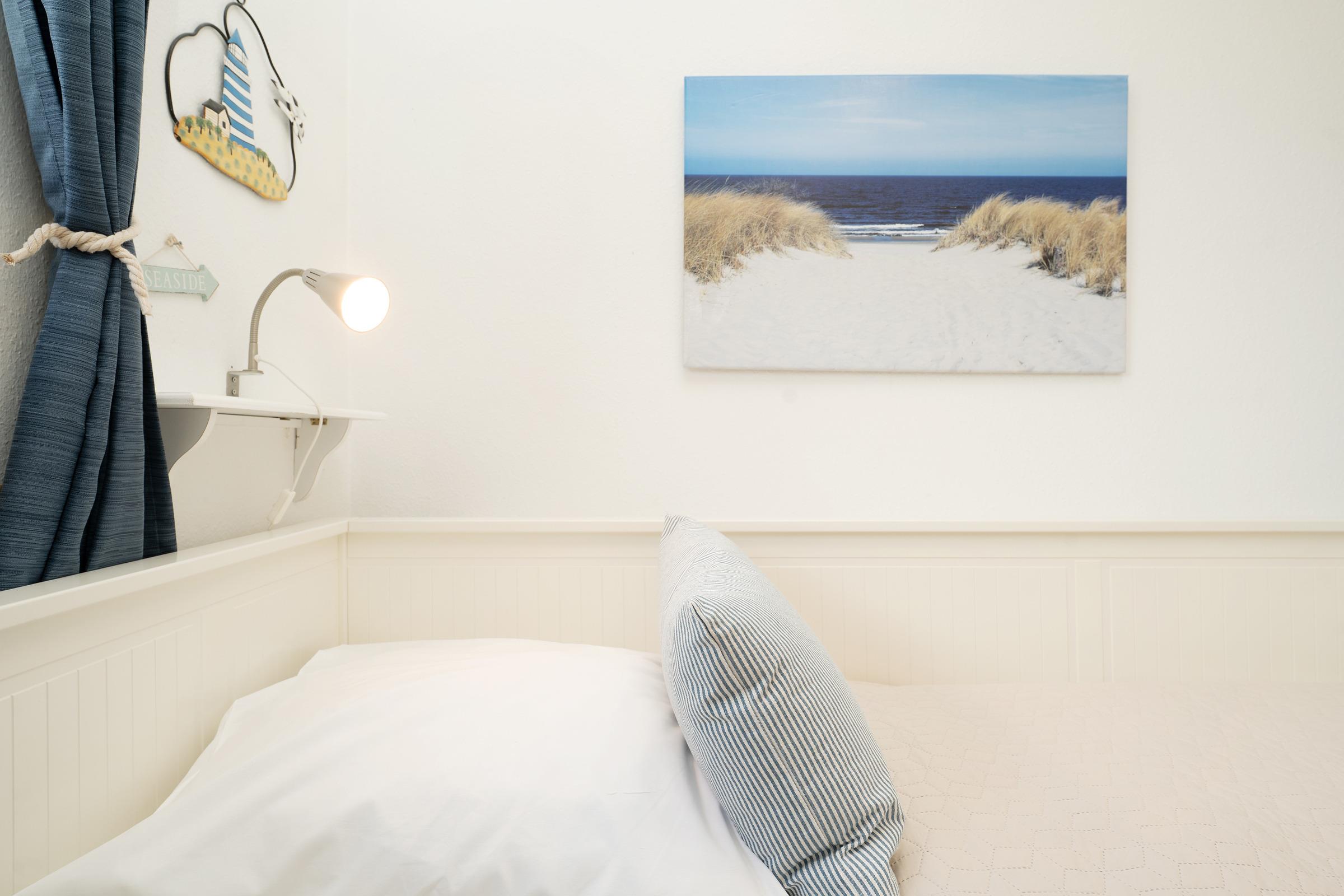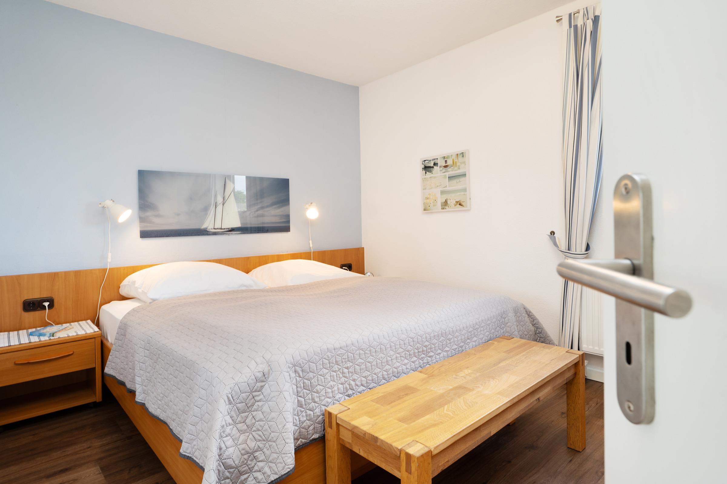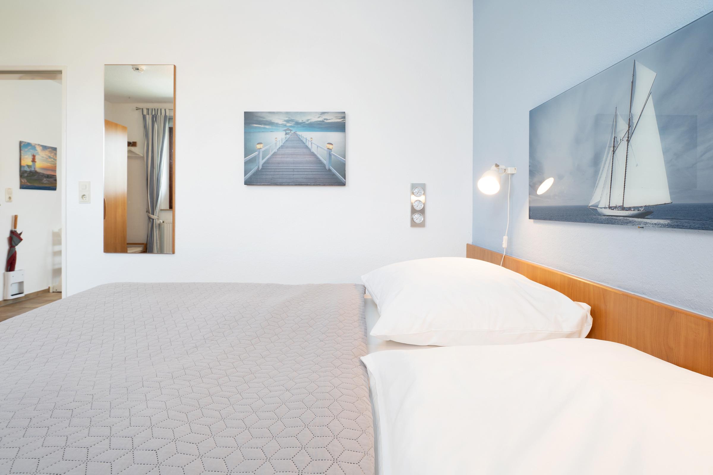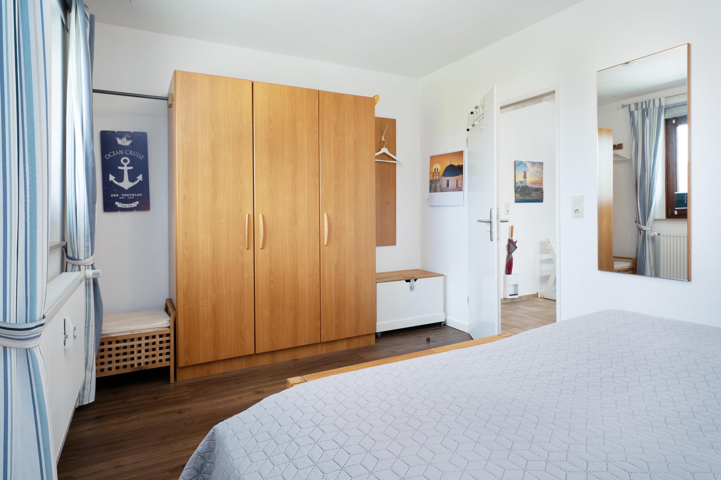 Schlafzimmer 1: 1 Doppelbett (2x 90x200 cm), Kleiderschrank, Verdunkelung: Plissee, Rollo & Gardinen, Platz für ein Babybett vorhanden