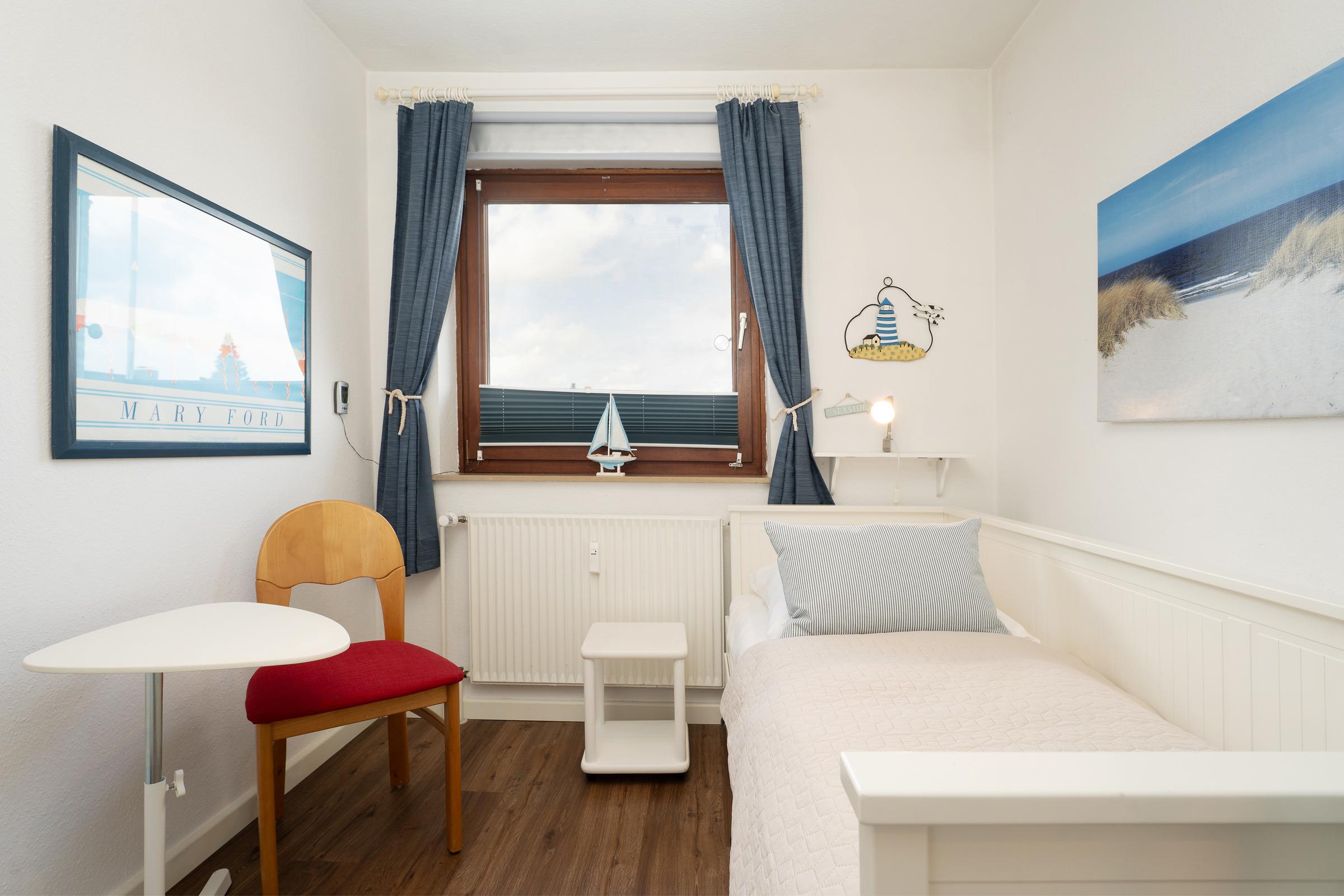 Schlafzimmer 2: 1 ausziehbares Kojenbett (2x 80x200 cm), Kleiderschrank, Verdunkelung: Plissee, Rollo & Gardinen, kein Platz für ein Babybett vorhanden