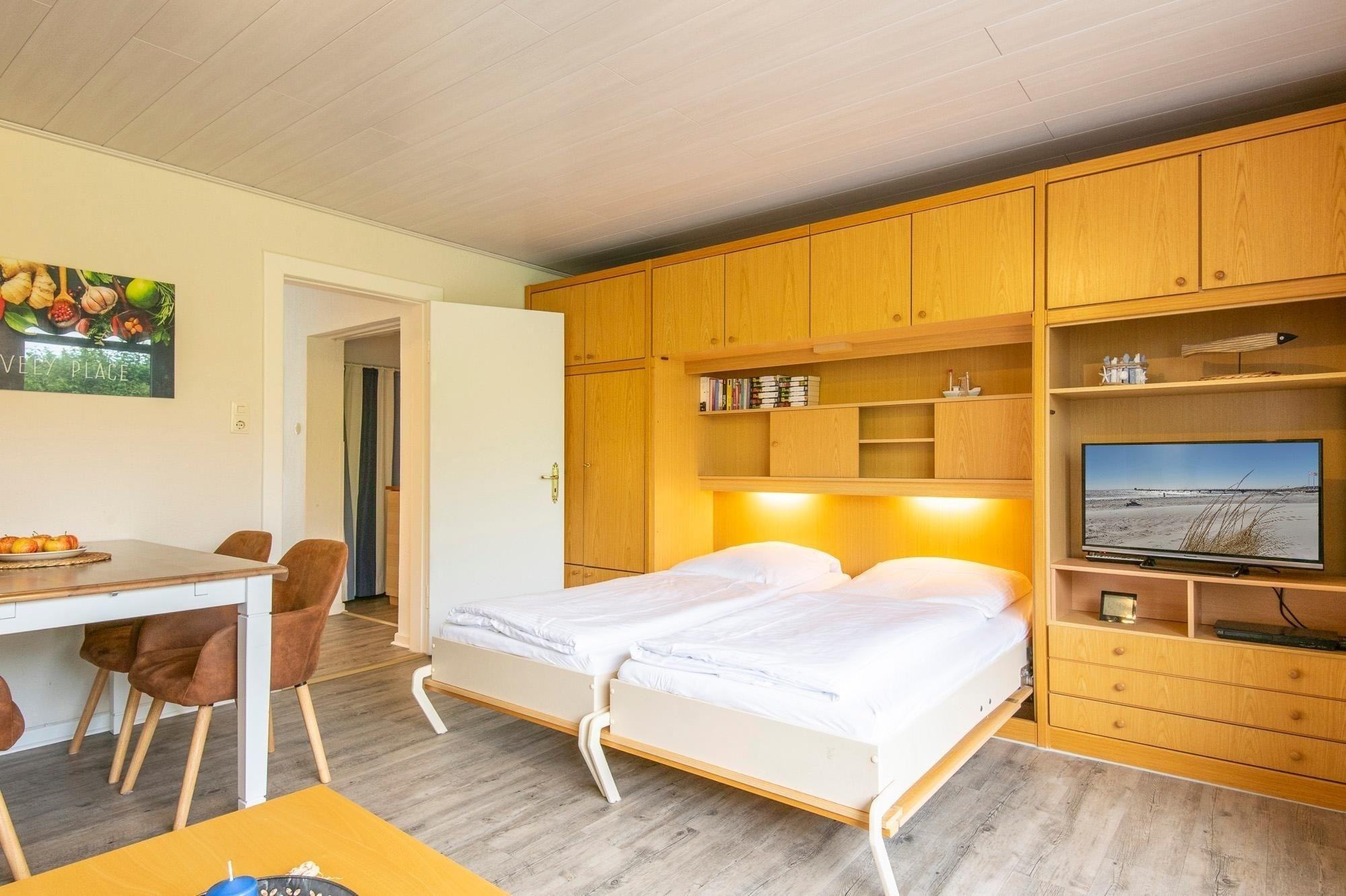 Wohn/Schlafraum: 1 Schrankbett (zwei ausklappbare Einzelbetten – je 90x200 cm), TV, Kleiderschrank