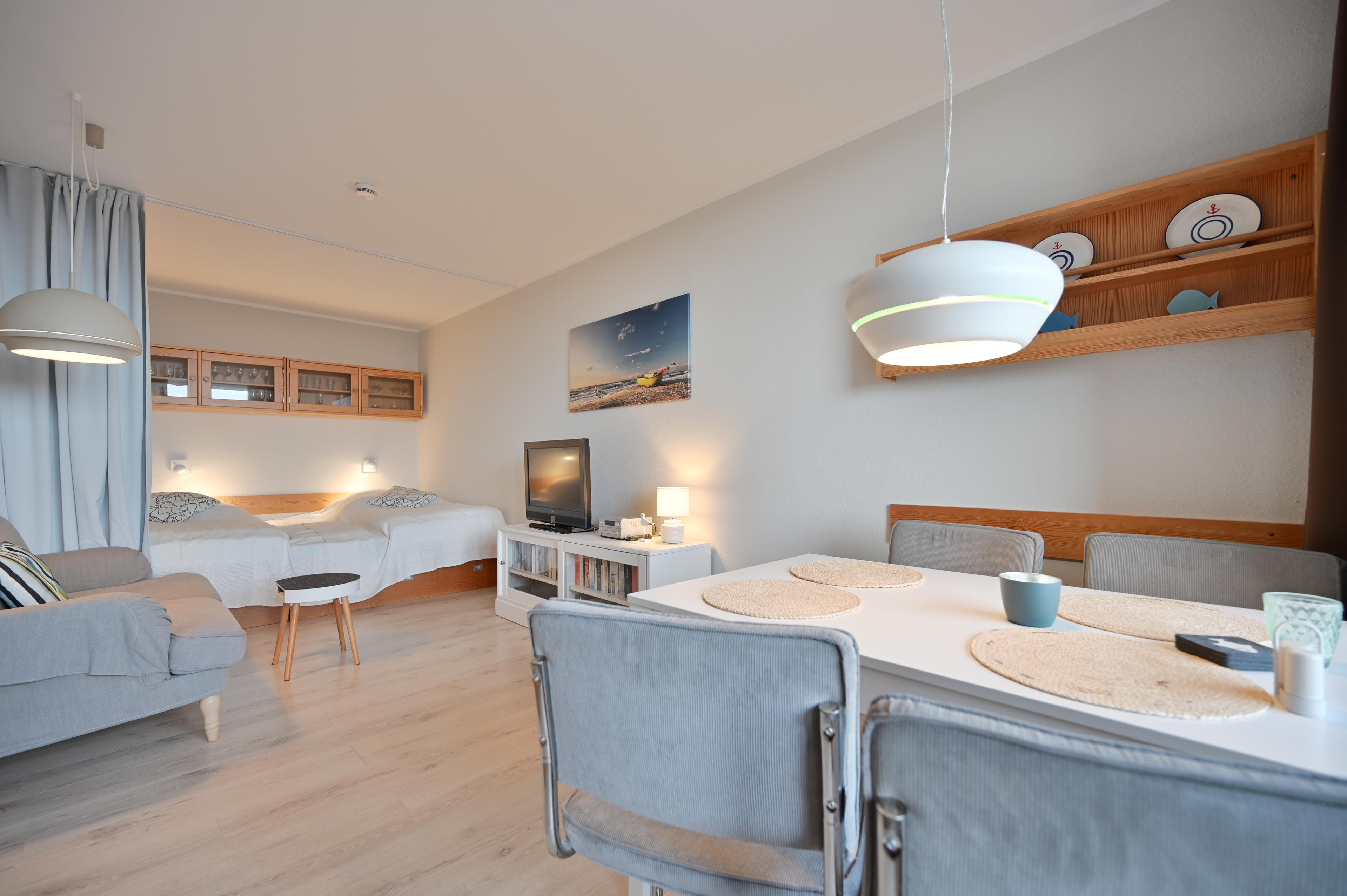 Ein Esstisch (ausziehbar) mit bequemen Stühlen bietet ausreichend Platz für gemeinsame Mahlzeiten oder gesellige Abende. Das Sofa lädt zum Entspannen ein - ob zum Lesen, Fernsehen oder einfach zum Abschalten nach einem erlebnisreichen Tag an der Ostsee.
