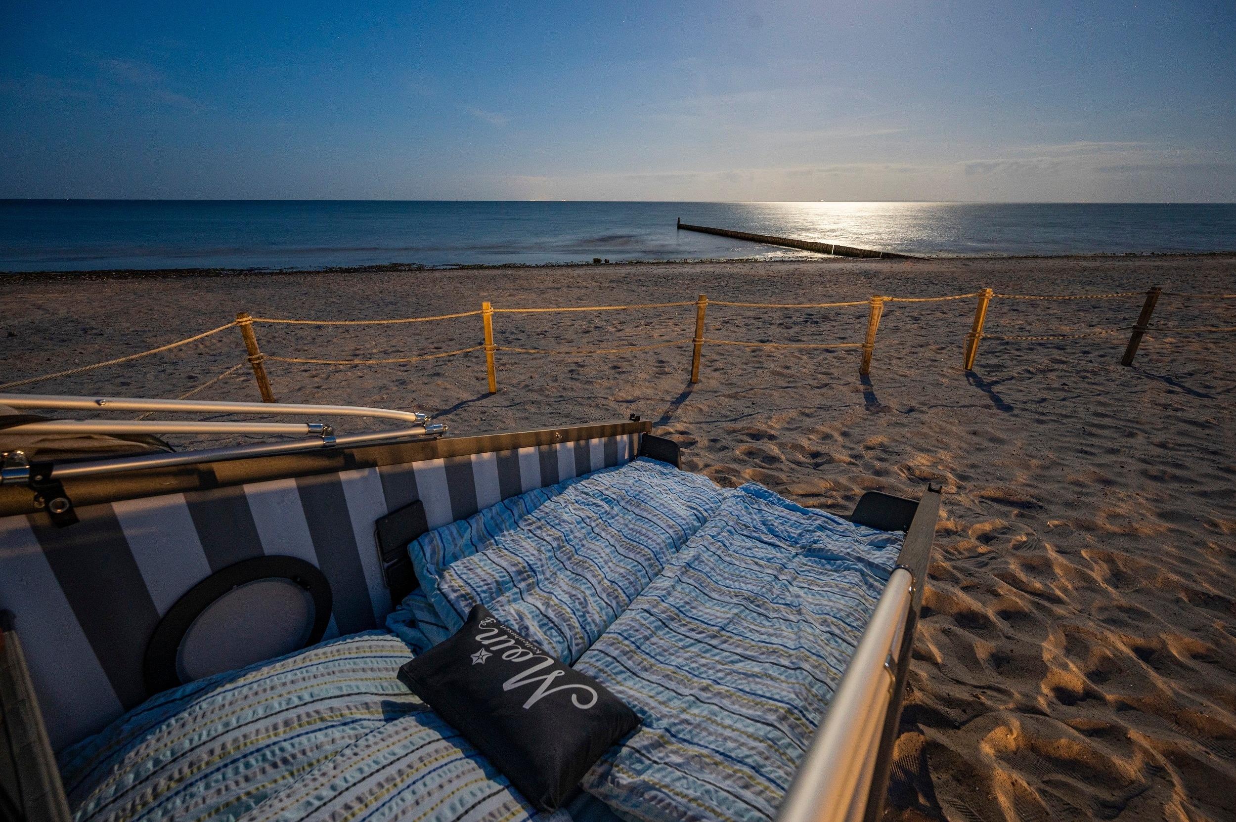 Lassen Sie Kindheitsräume am Strand von Kellenhusen wahr werden und erleben Sie Glücksgefühle pur bei einer Übernachtung in unserem neuen Schlafstrandkorb (120 x 200cm). Geschützt vor Sonne, Wind und Wetter und auch vor neugierigen Blicken genießen Sie eine unvergessliche Nacht mit Ausblick auf Ostsee, Mond und Sterne.