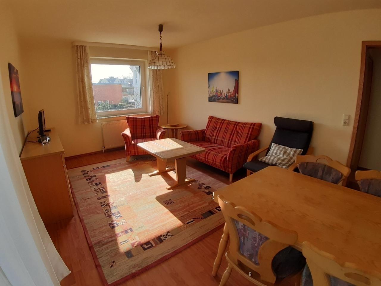 Die 51 qm große Wohnung befindet sich im 1. Stock vom "Haus Strandgang". Im Erdgeschoss gibt es frische Brötchen und Pizza außer Haus. Sie verfügt über einen großen Balkon zum Theodor-Storm-Weg, ein Wohnzimmer (Esstisch, Couchgarnitur und TV), ein Elternschlafzimmer (mit Doppelbett und Kinderbett), ein Kinderzimmer (ein Etagenbett), eine separate Küche (mit Spülmaschine) und ein Bad mit Dusche/WC.