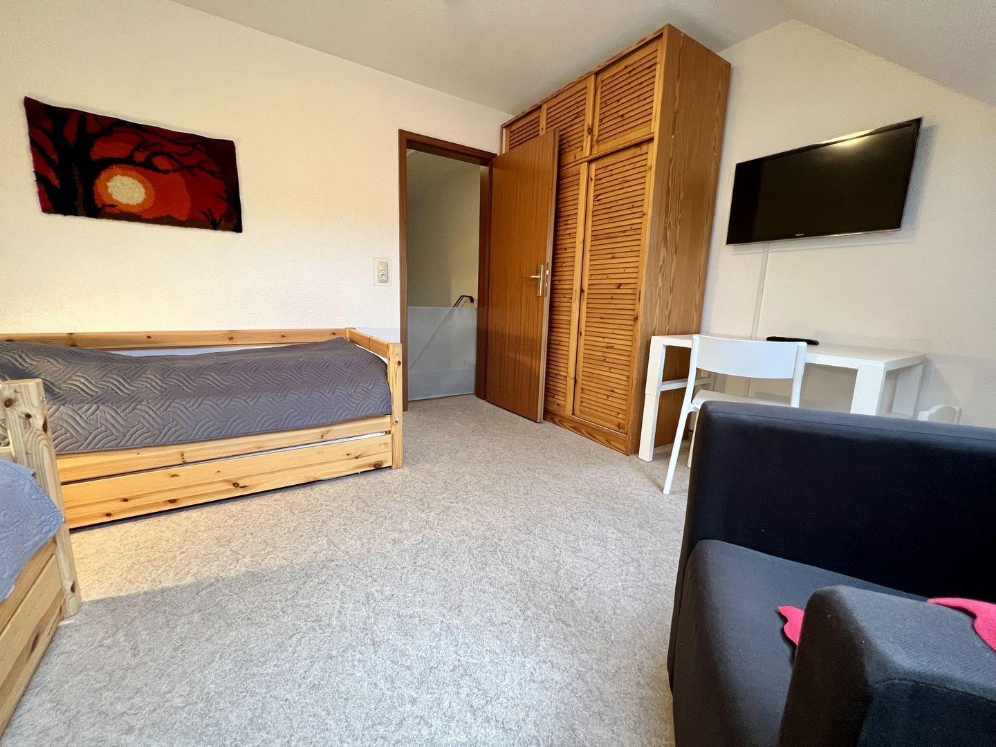 Im Dachgeschoss: Schlafzimmer mit Doppelbett und Kleiderschrank, Schlafzimmer mit 2 Einzelbetten, Kleiderschrank und TV(beide Einzelbetten sind ausziehbar und erreichen nach Ausklappen fast dieselbe Höhe wie die Einzelbetten selber (Liegefläche ca. 2x 90x190 cm)), Badezimmer mit Dusche und WC. Zur Sicherheit für die kleinen Gäste wurde im Obergeschoss ein Treppenschutzgitter angebracht.
