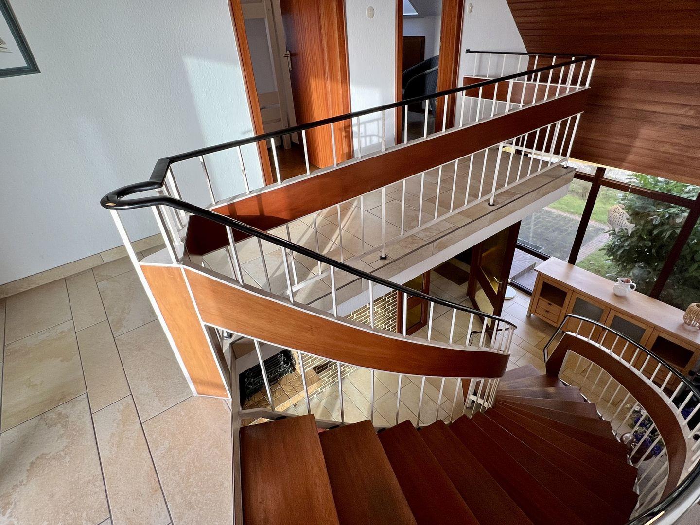 - Empfangsbereich mit Sitzecke, Kamin und Ausgang zur Terrasse und Garten, Treppe in den oberen Bereich