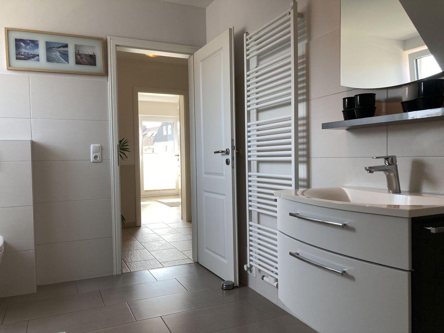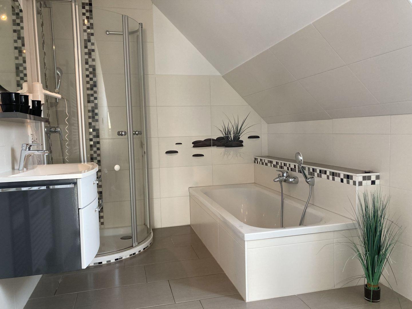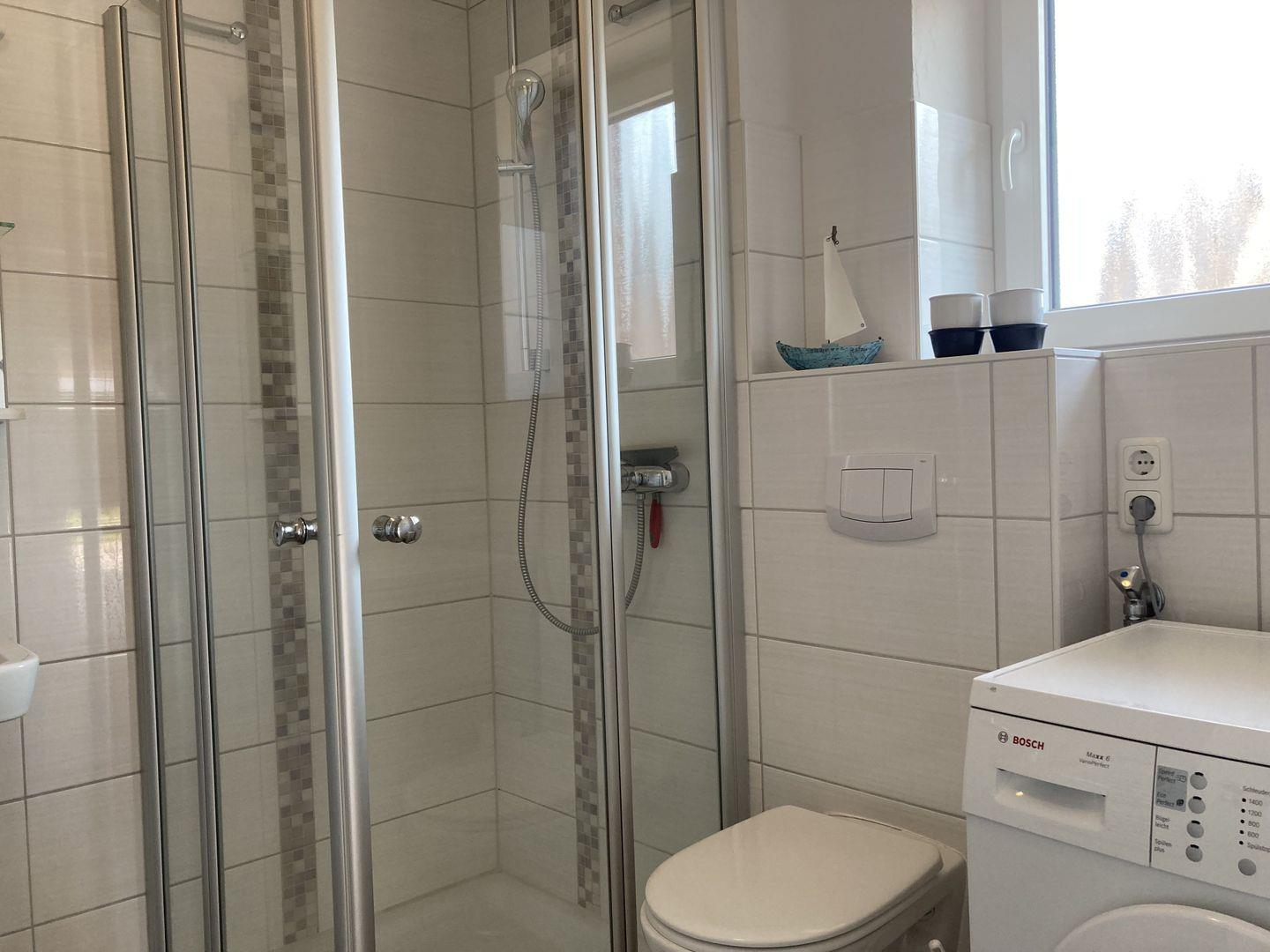 - Badezimmer mit Dusche, WC und Waschmaschine