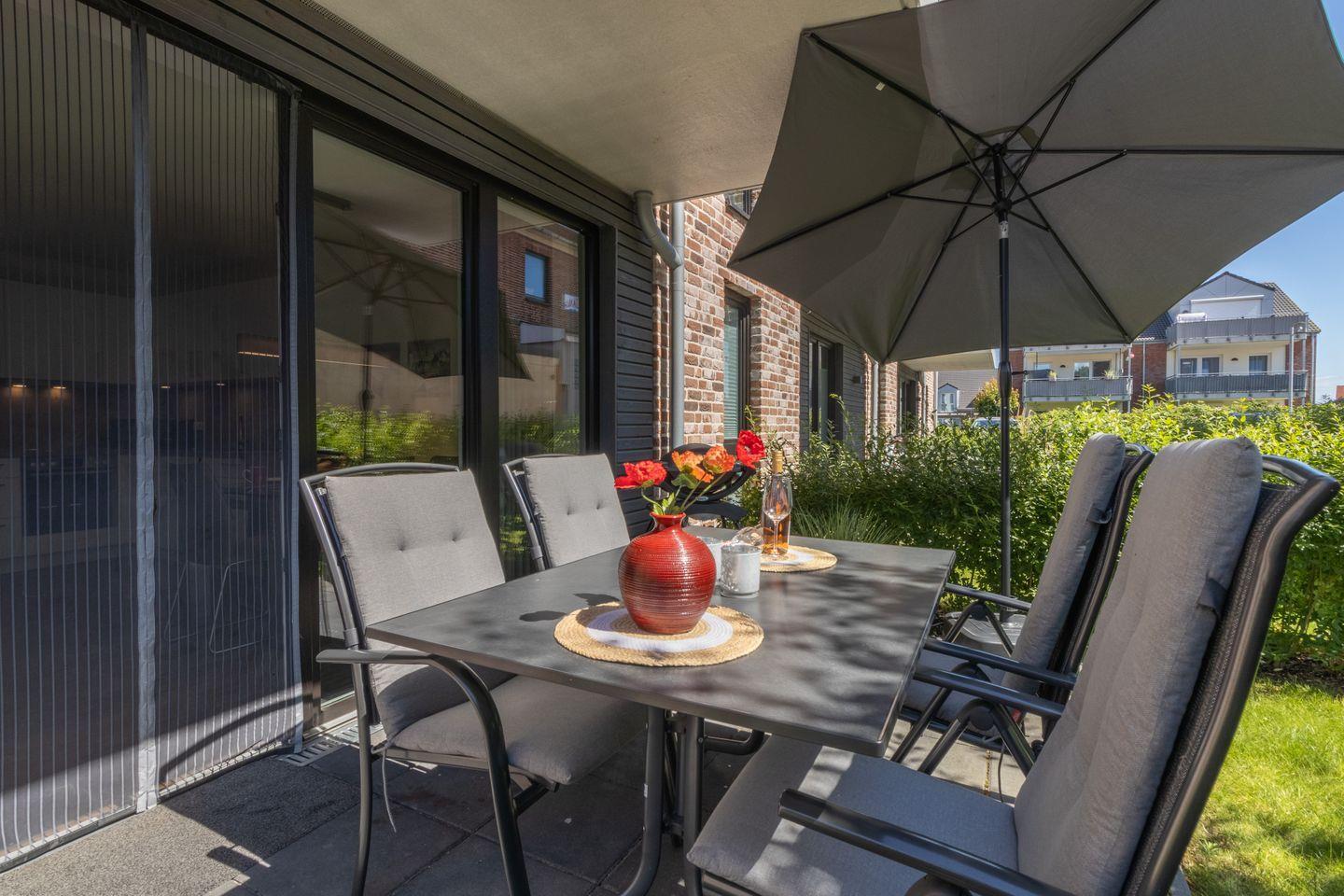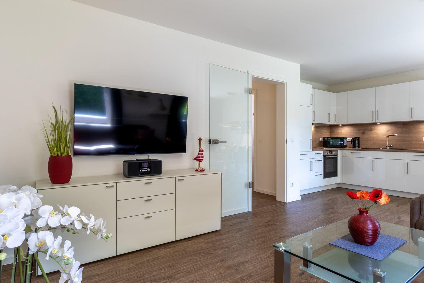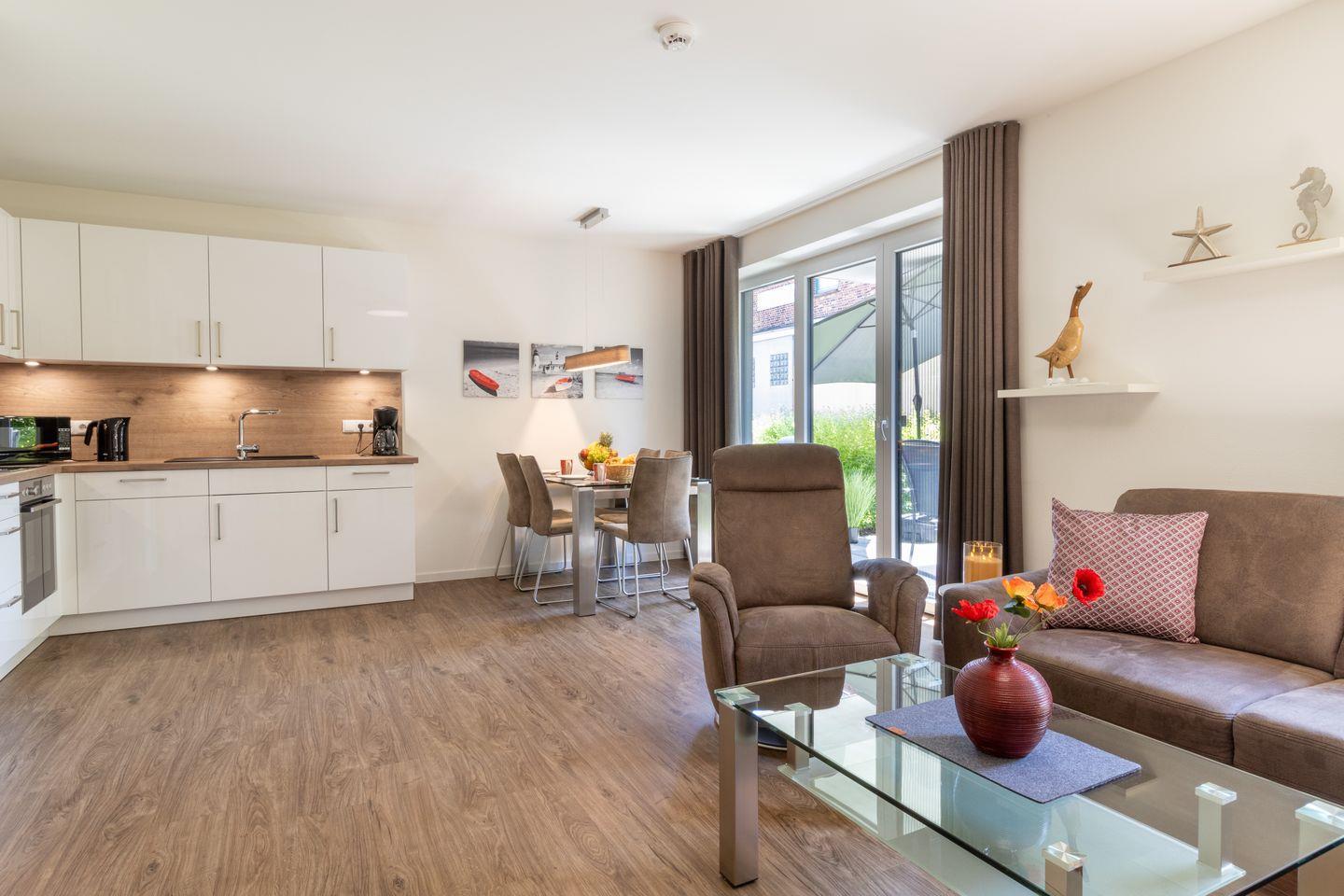 Der helle Wohnbereich mit gemütlicher Wohnlandschaft und harmonischem Farbkonzept lädt zum Wohlfühlen ein. Die offene Küche ist hochwertig ausgestattet und bietet dir alles, was du für genussvolle Kochabende brauchst. Vom Wohnbereich gelangst du direkt auf die Terrasse mit angrenzendem Garten – perfekt für entspannte Stunden im Grünen.