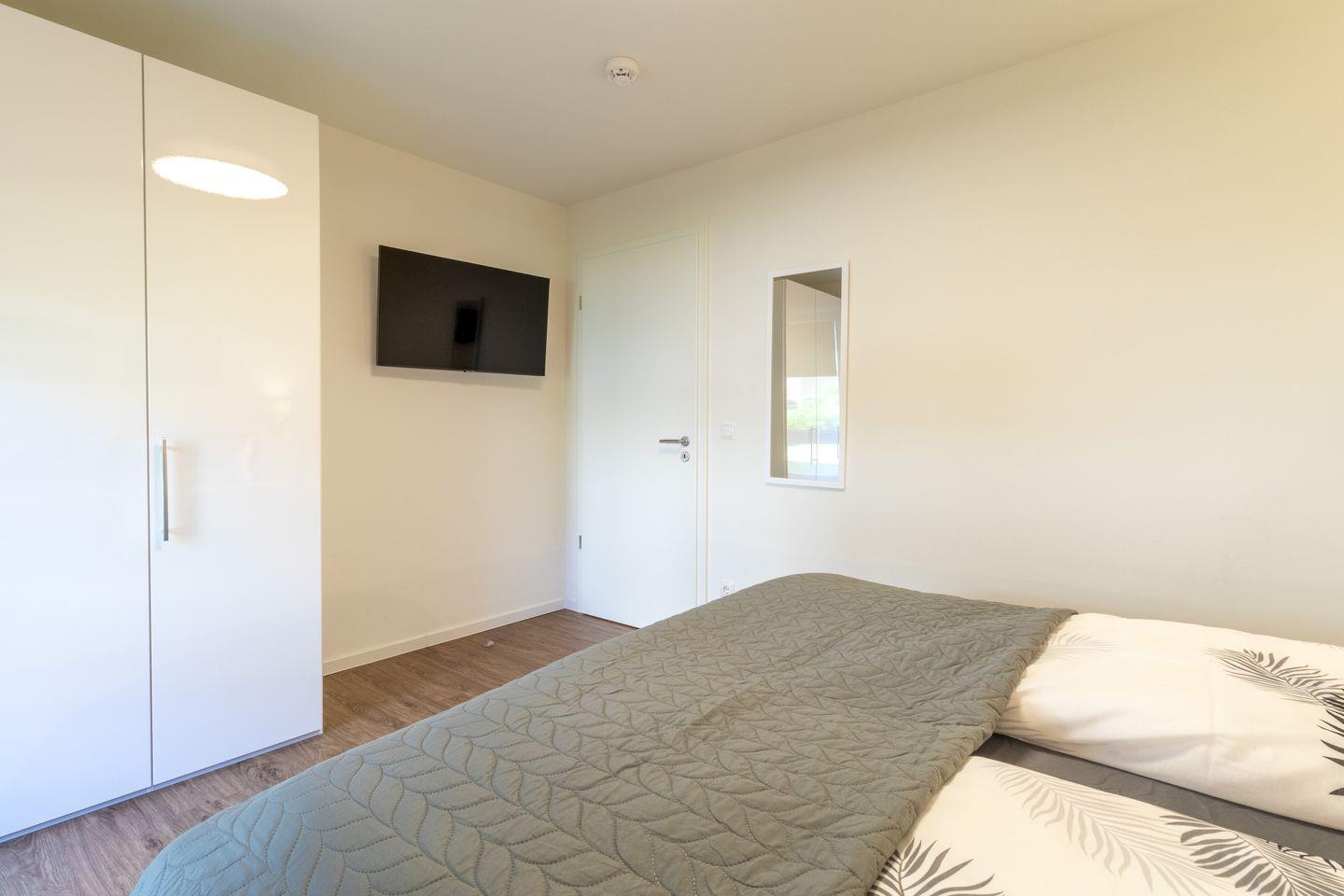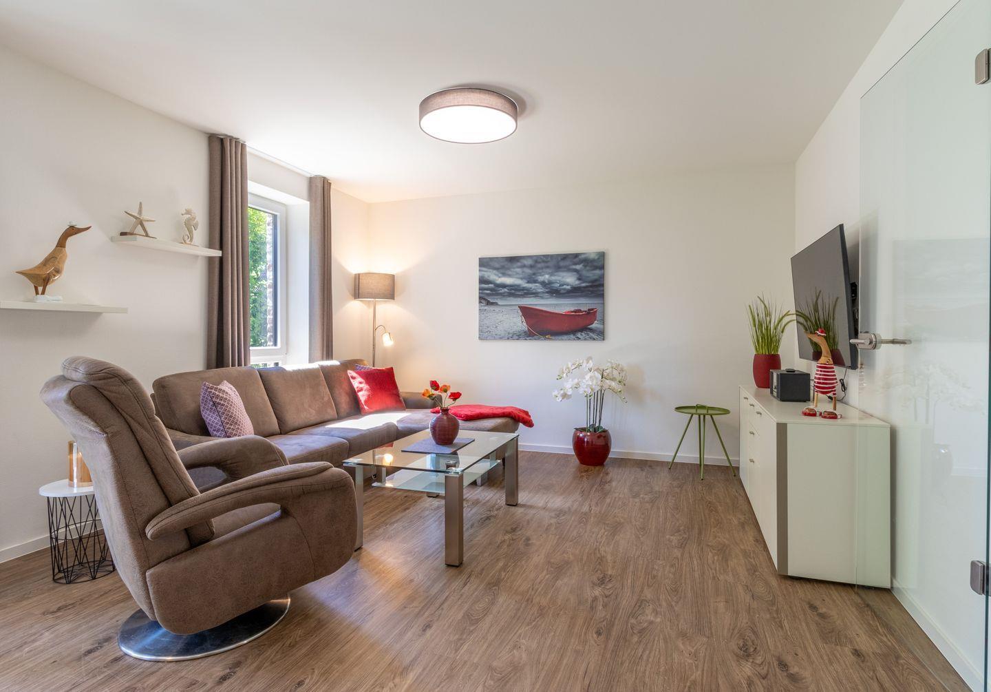 Zwei Schlafzimmer bieten dir mit komfortablen Boxspringbetten, Smart-TV und Verdunkelungsplissees den idealen Rückzugsort. Für einen weiteren Gast lässt sich die Couch im Wohnbereich als Schlafplatz nutzen. Hier schläfst du erholt – auch bei voller Belegung.