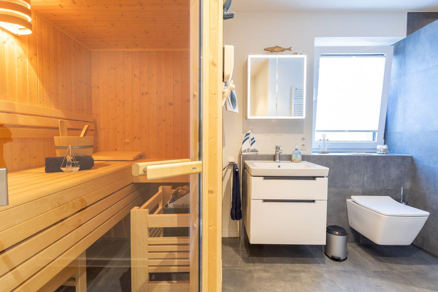 Das moderne Bad bietet dir eine Dusche, eine Sauna, WC, einen Waschtisch mit viel Ablagefläche und einen Föhn.