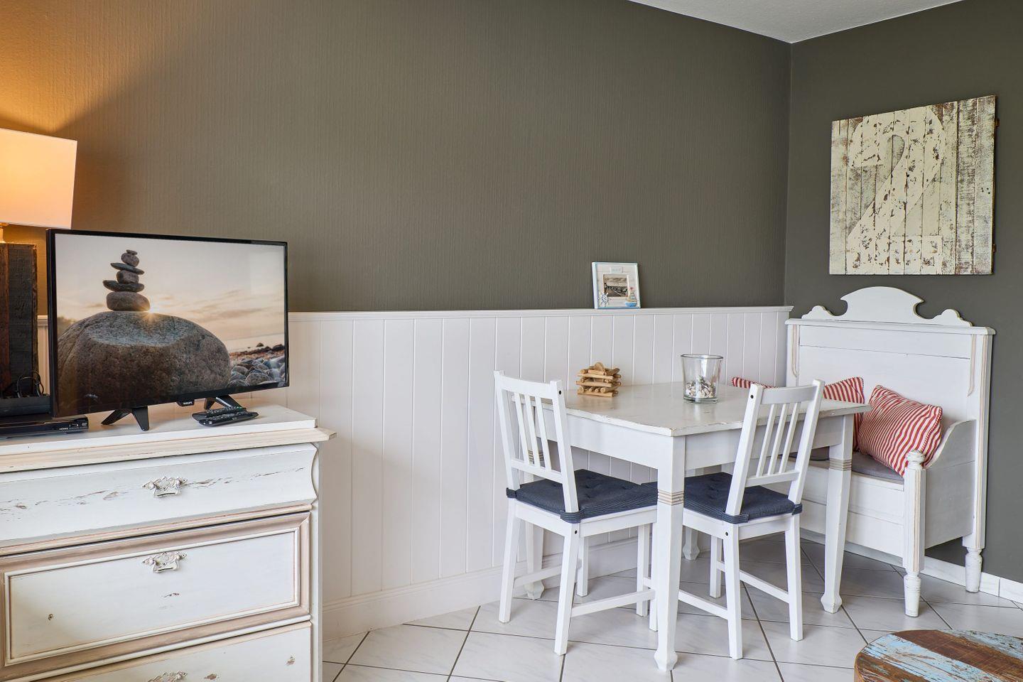 Die moderne, geschlossene Küche ist mit allen notwendigen Annehmlichkeiten ausgestattet, darunter ein Cerankochfeld, ein Kühlschrank, eine Spülmaschine und eine Mikrowelle. Hier können Sie Ihre Kochkünste entfalten und leckere Gerichte zubereiten. Zusätzlich steht ein gut ausgestatteter Essbereich mit Esstisch zur Verfügung, der Platz für gemeinsame Mahlzeiten bietet. Kaffeemaschine, Wasserkocher, Toaster sowie Geschirr und Besteck sind ebenfalls Teil der Ausstattung, sodass Sie sich sofort wie zu Hause fühlen können.