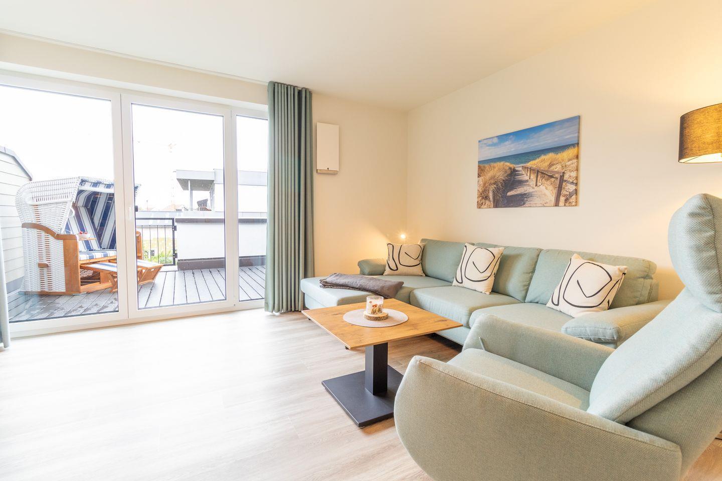 Eine große Dachterrasse (Süd-/Westausrichtung) mit Strandkorb und Gartenmöbeln und eine zweite Dachteraase (Ostausrichtung) mit Tisch und Sitzgelegenheiten laden zu jeder Tageszeit zu Sonne, Meerluft und Entspannung ein.