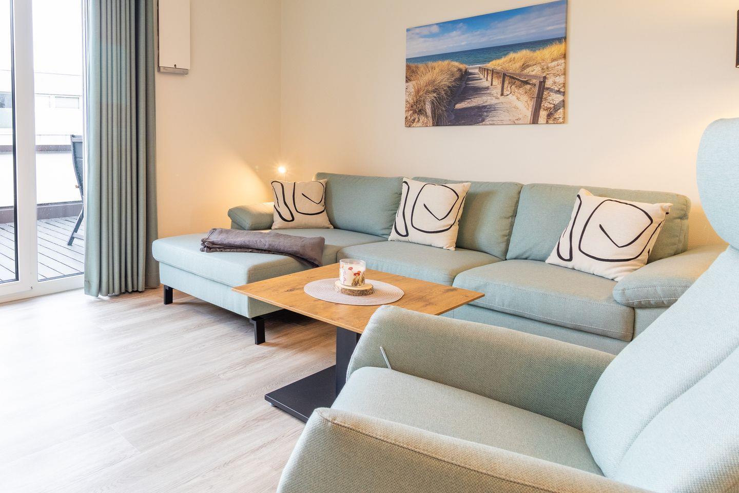 Der lichtdurchflutete Wohnbereich öffnet sich zur weitläufigen Dachterrasse. Hier kannst du entspannen, lesen oder einfach die Sonne genießen. Die offene Küche ist umfassend ausgestattet mit Cerankochfeld, Backofen, Mikrowelle Kühlschrank mit Gefrierfach und Spülmaschine. Der angrenzende Essbereich bietet ausreichend Platz für alle Gäste. Fußbodenheizung und eine Wohnraumlüftung mit Wärmerückgewinnung sorgen ganzjährig für ein angenehmes Raumklima.