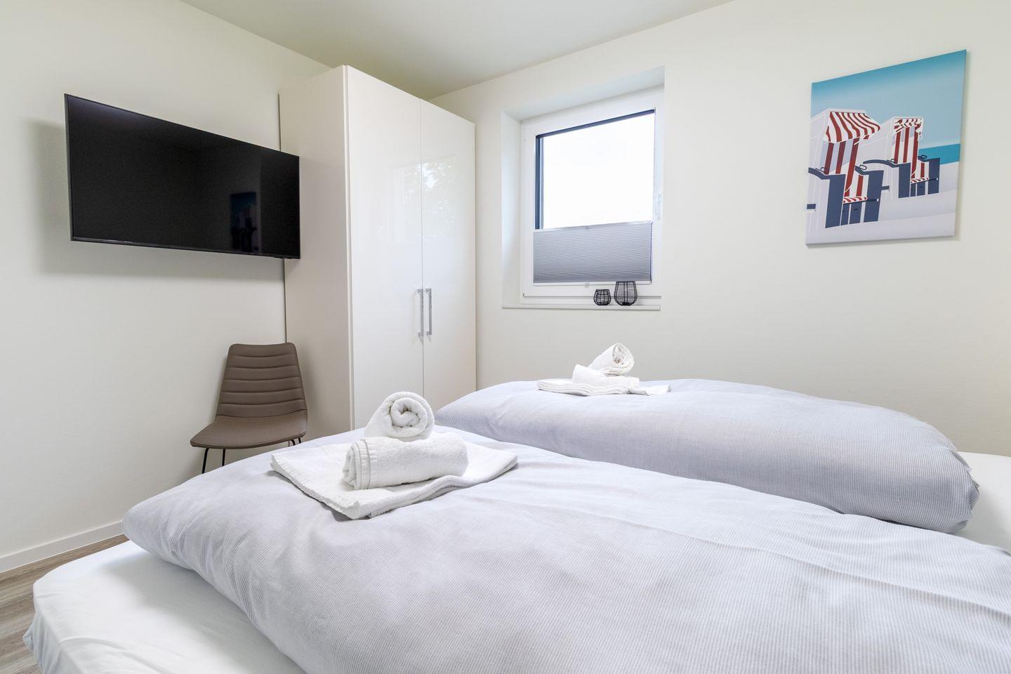 Zwei Schlafzimmer bieten dir besten Schlafkomfort: Das Hauptschlafzimmer ist mit einem großen Doppel-Boxspringbett (180?×?200?cm) ausgestattet und bietet Dir direkten Zugang zur Dachterrasse. Im zweiten Schlafzimmer findest du zwei Einzelbetten (je 90?×?200?cm) – perfekt für Kinder oder Freunde. Beide Räume sind stilvoll eingerichtet und eignen sich sowohl für Paare als auch für Familien mit Kindern.