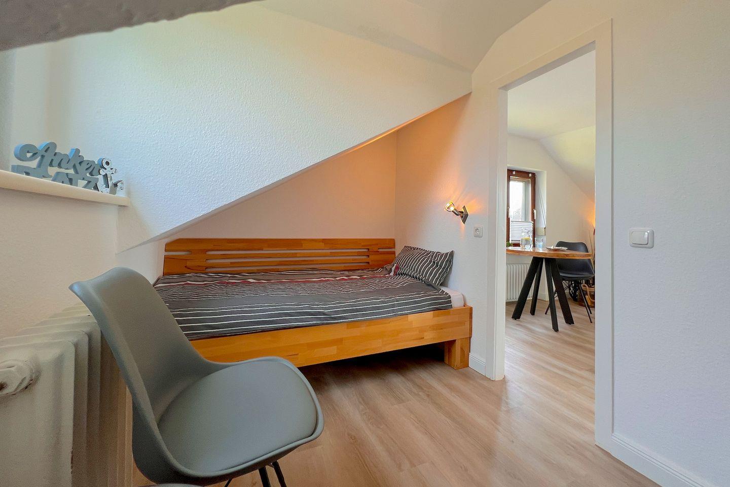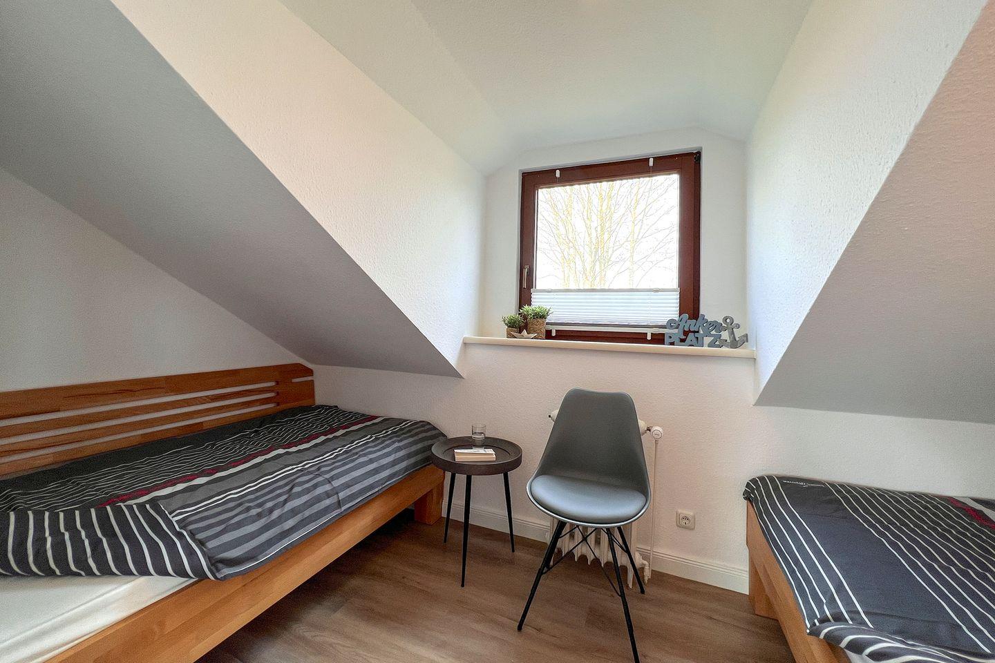 Im separaten Schlafzimmer befinden sich zwei Einzelbetten. Für die kleinsten Gäste stellen wir auf Anfrage gerne ein Kinderreisebett und einen Hochstuhl zur Verfügung.